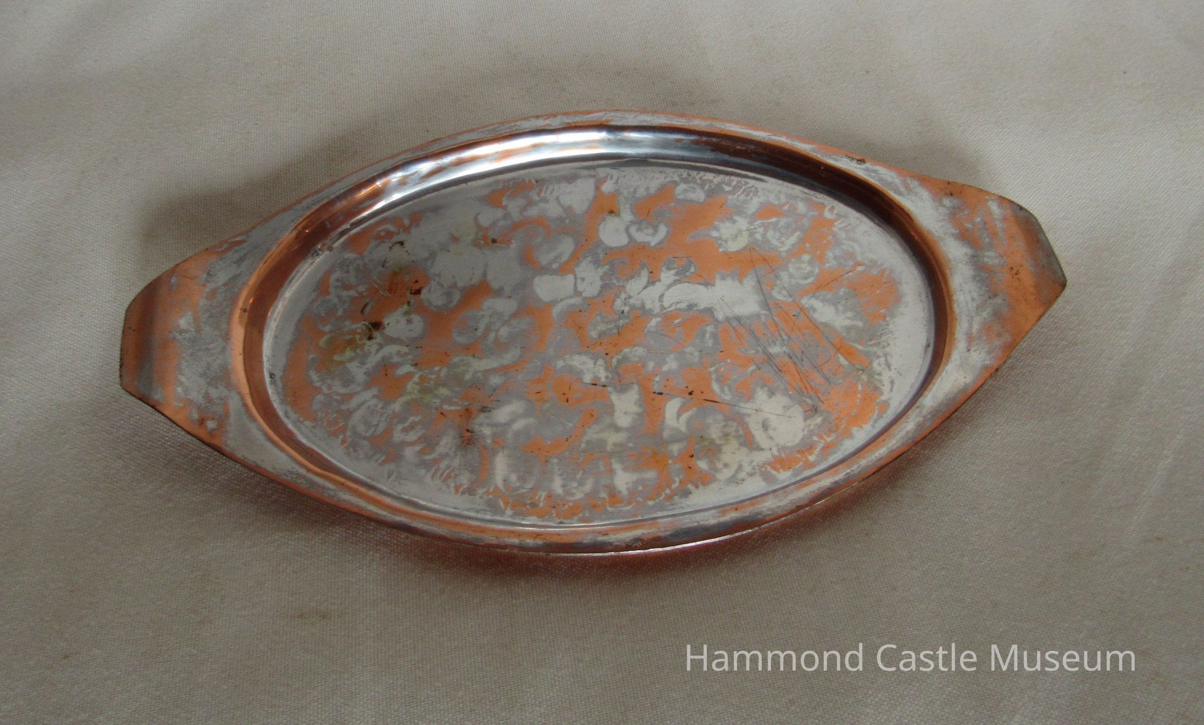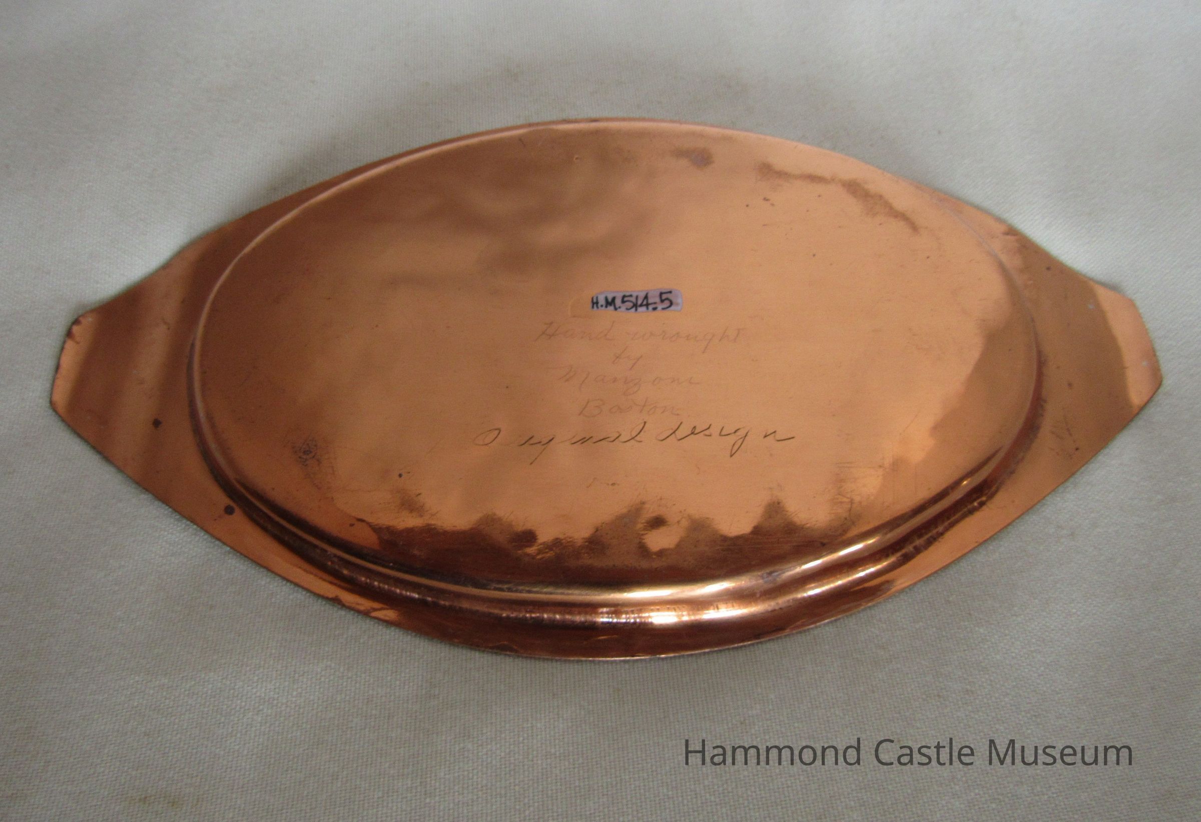 Set of 5 oval trays, slightly varying in handle design. Each signed in script on the bottom: "Hand wrought by Manzoni, Boston, original design".