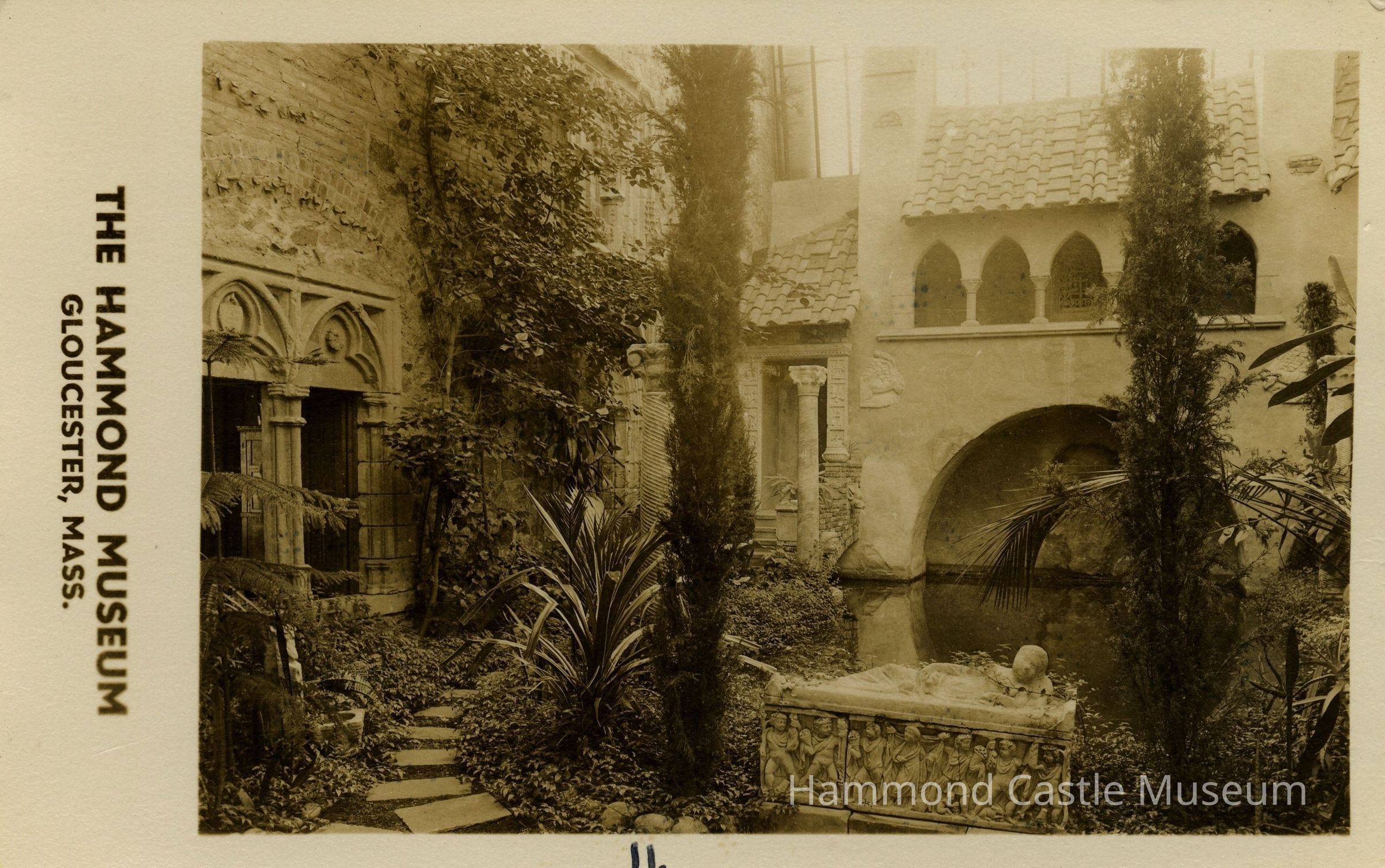 Early postcard of courtyard pool & bridge, w season sarcophagus but pre-Paris statue