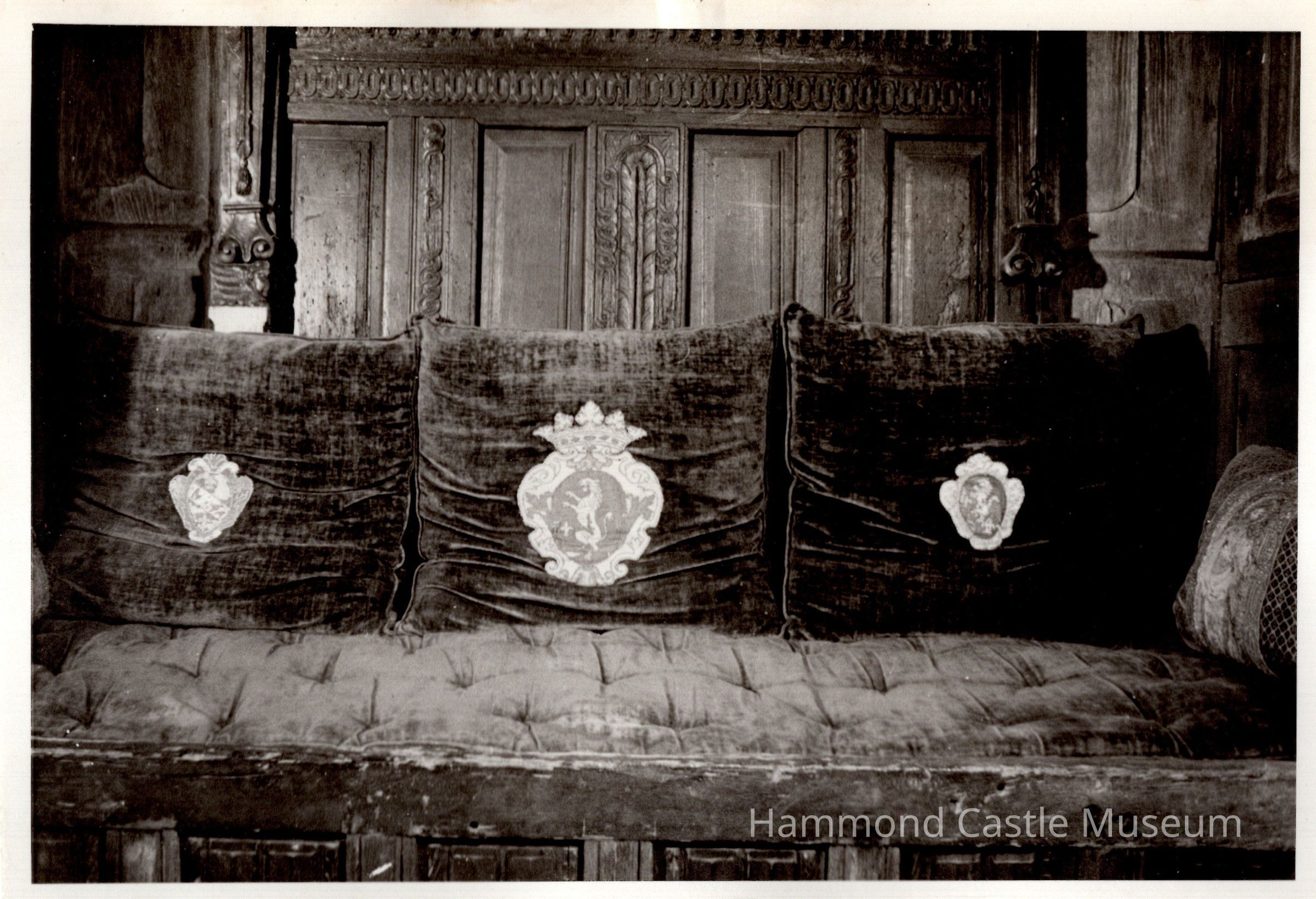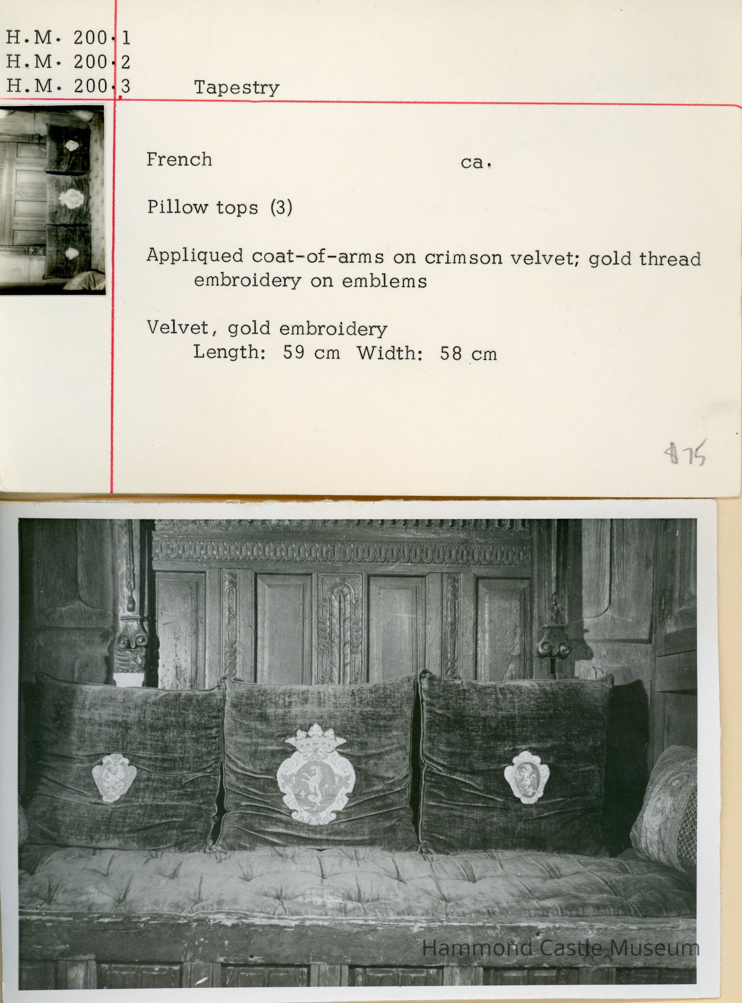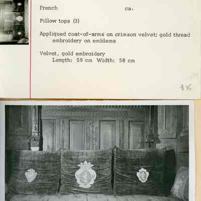 Set of three pillow tops. Appliqued coat-of-arms on crimson velvet; gold thread embroidery on emblems.