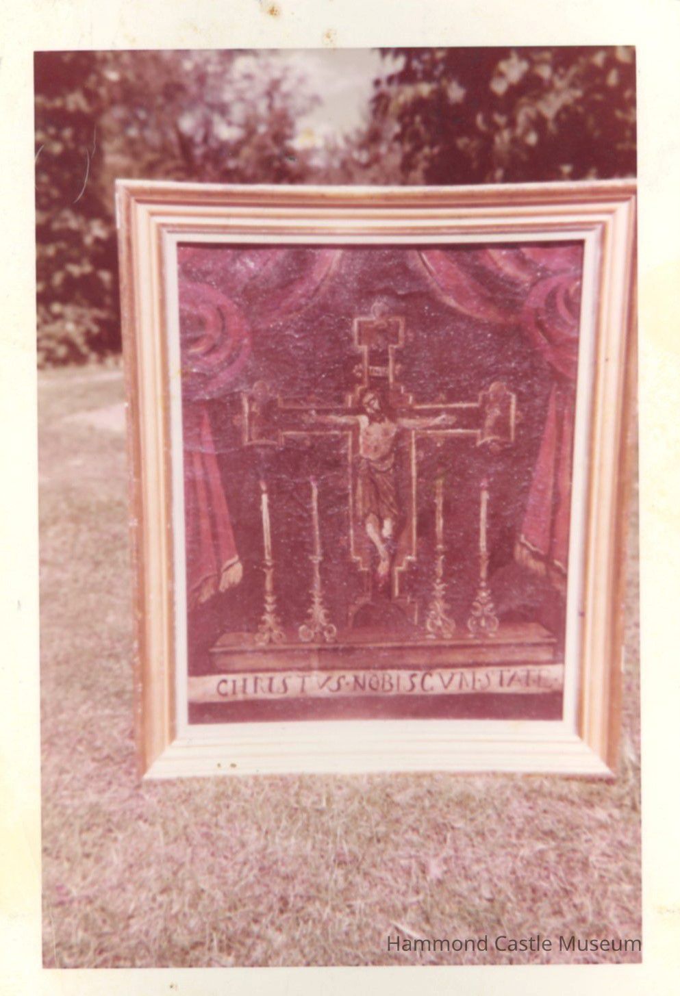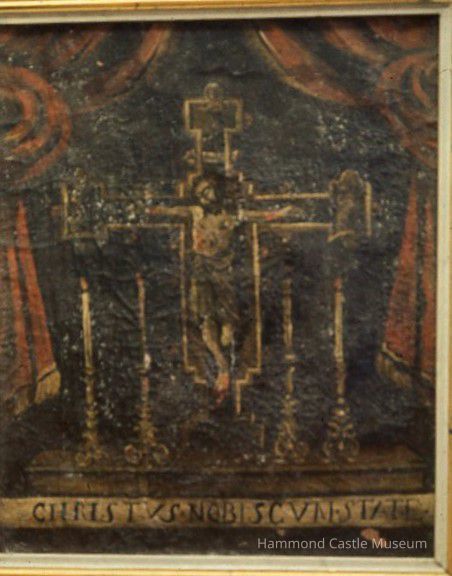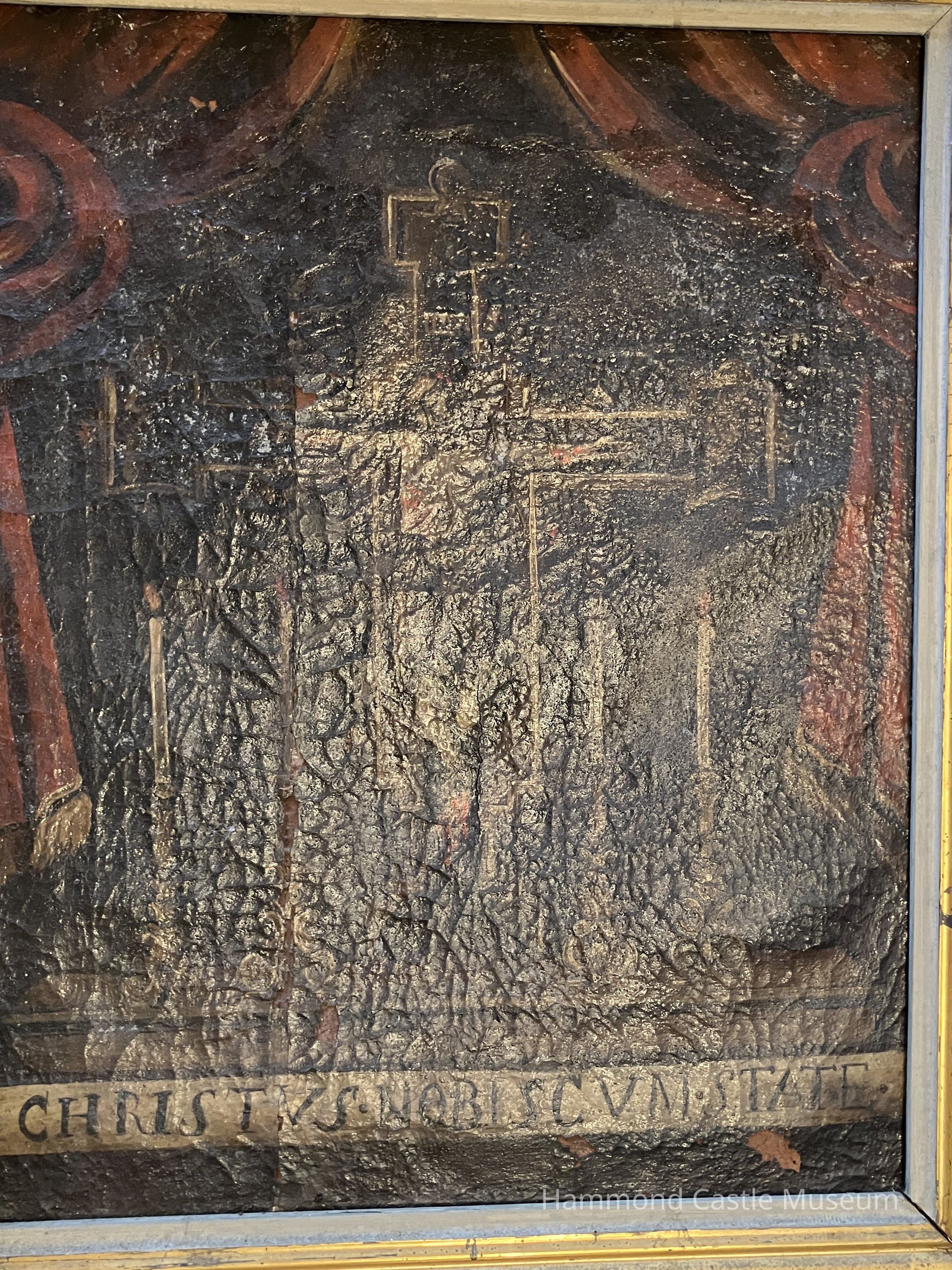 Painting of Crucifix on Altar "CHRISTUS NOBIS CVM STATE" along the altar front edge Translation - Christ state (speak or pray) for us Heavily crackled