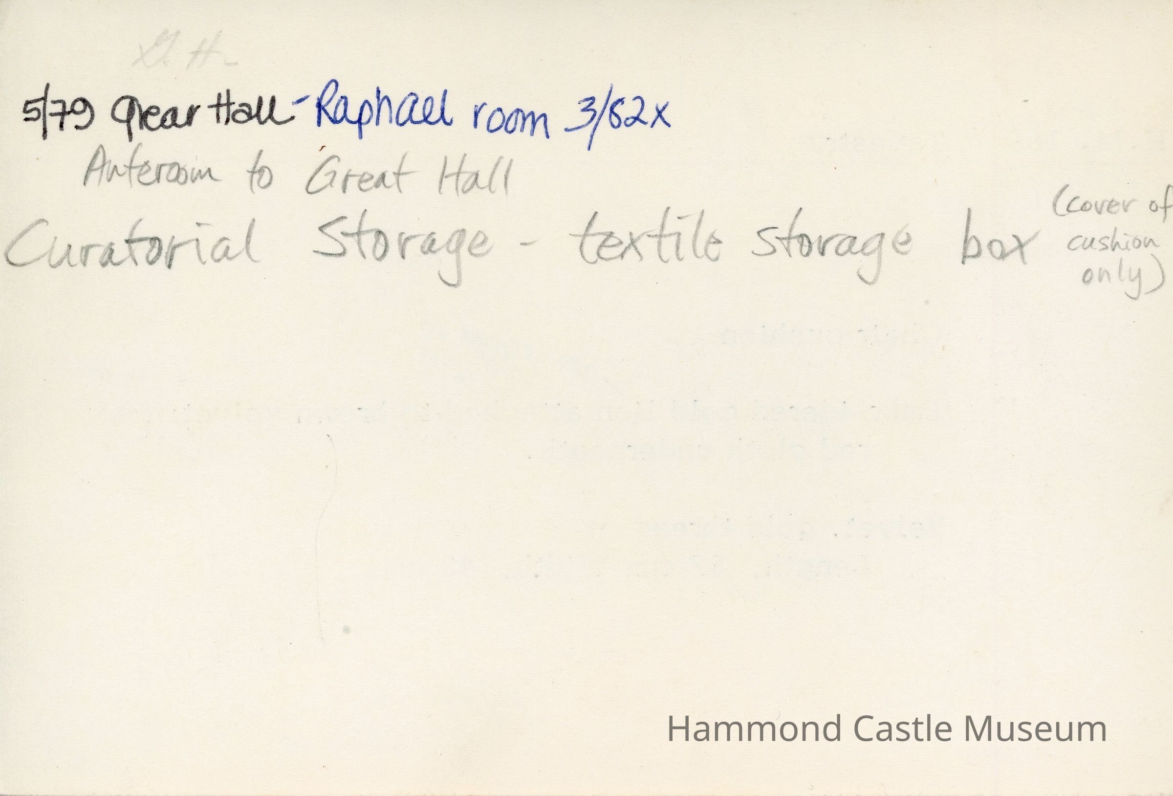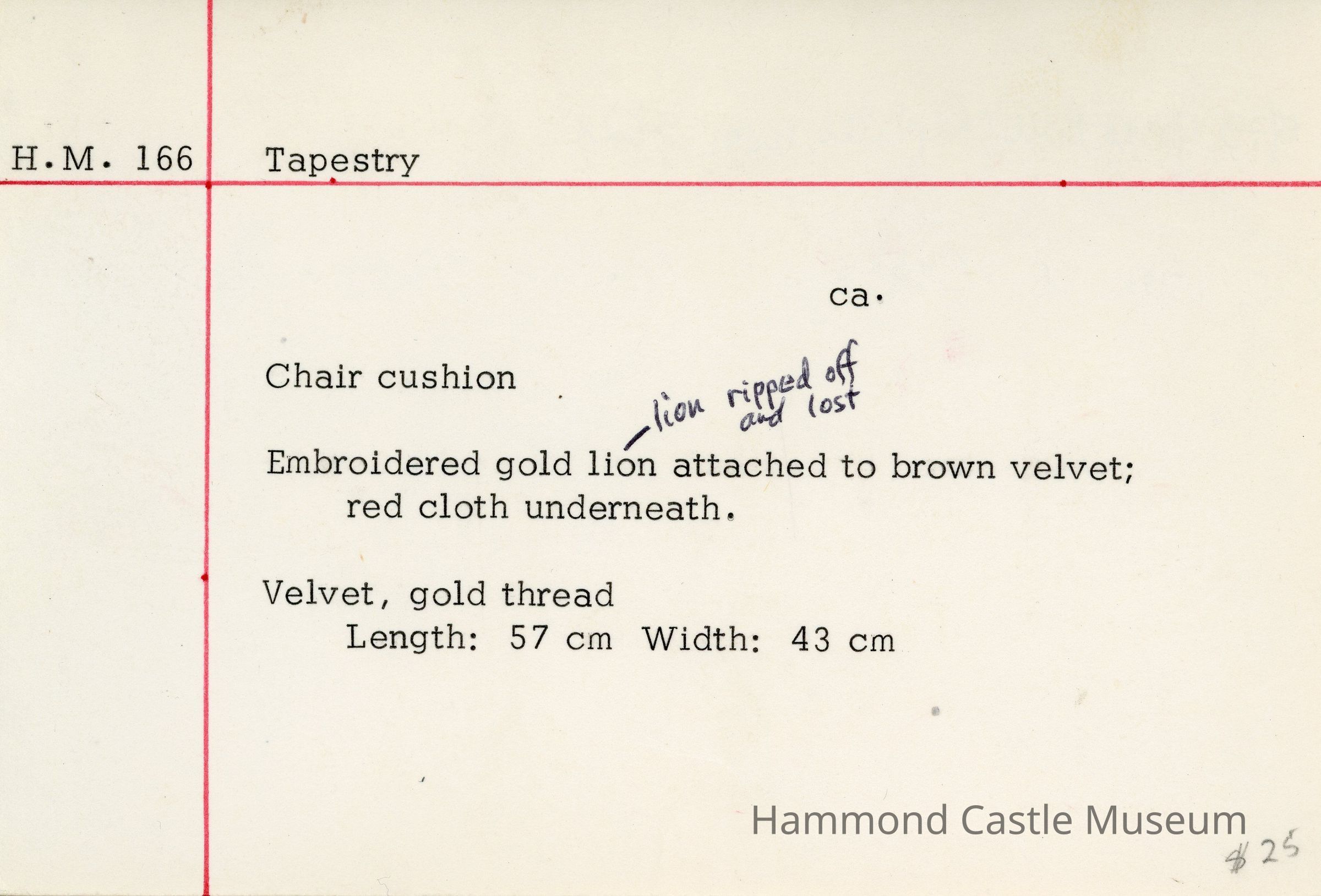 Chair cushion Embroidered gold lion (lion is missing) attached to brown velvet; red cloth underneath