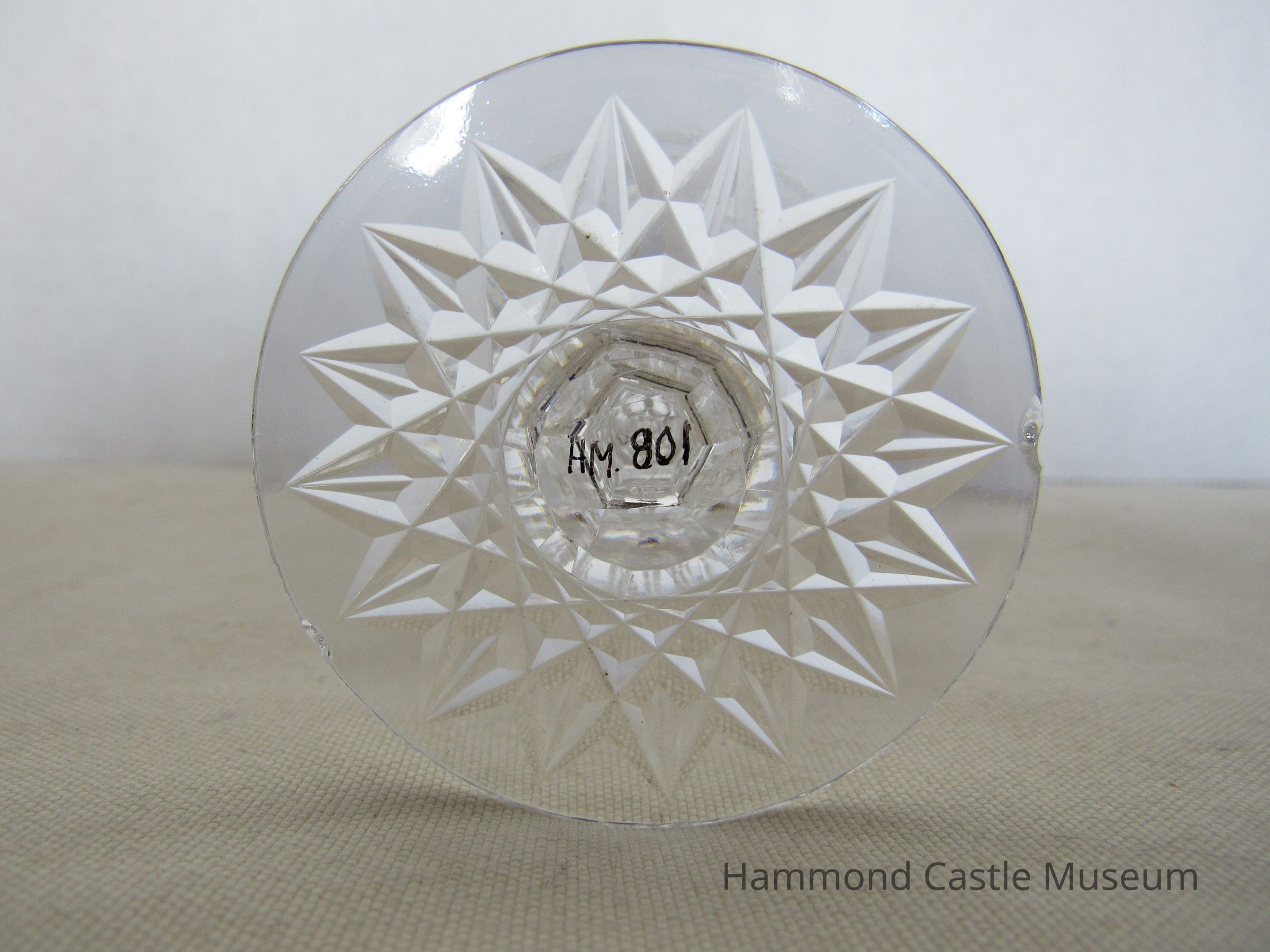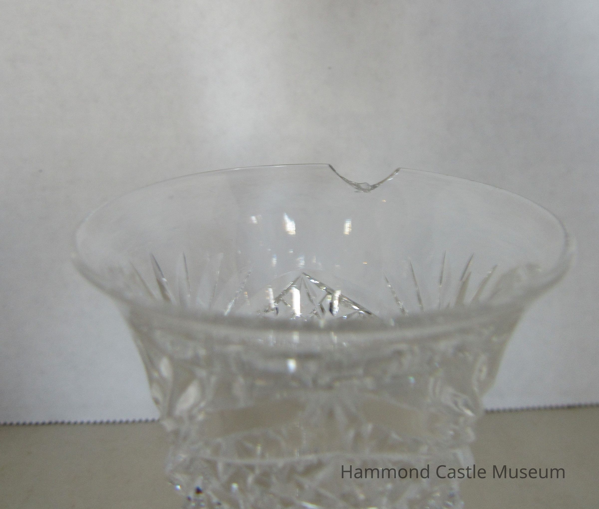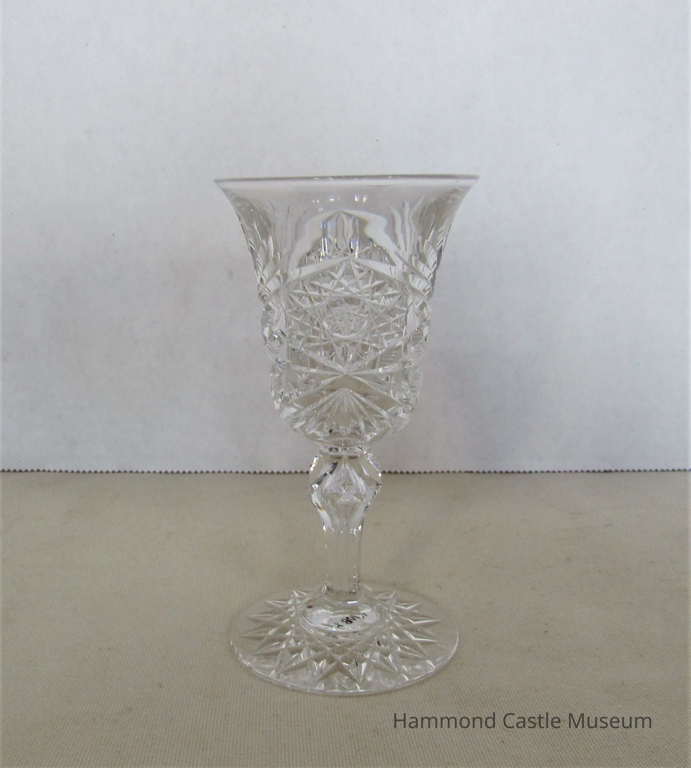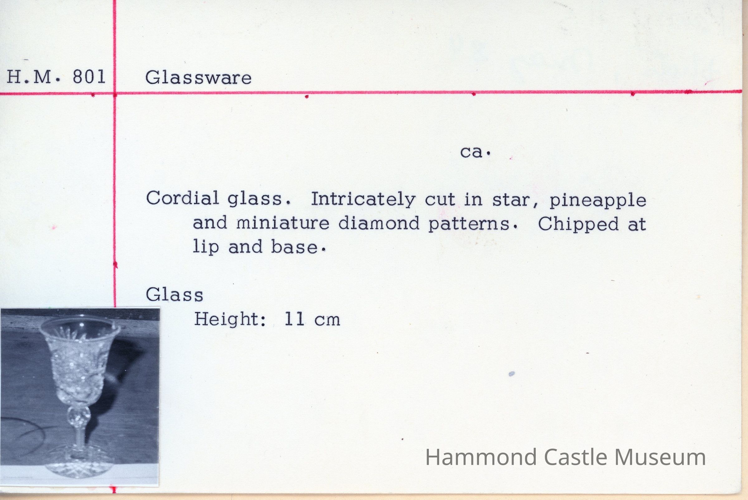 Cordial glass. Intricately cut in star, pineapple and miniature diamond patterns. Chipped at lip and base.
