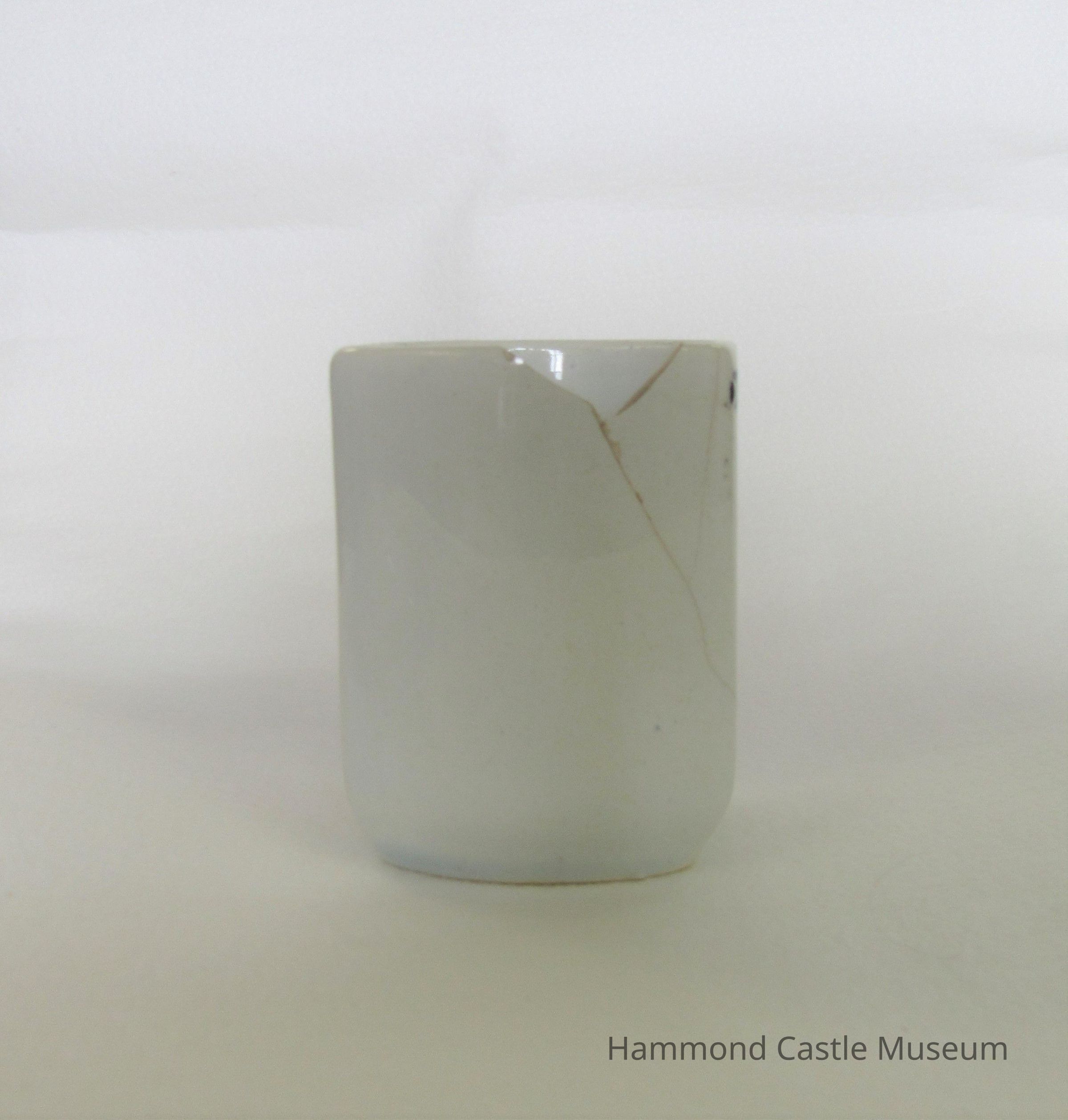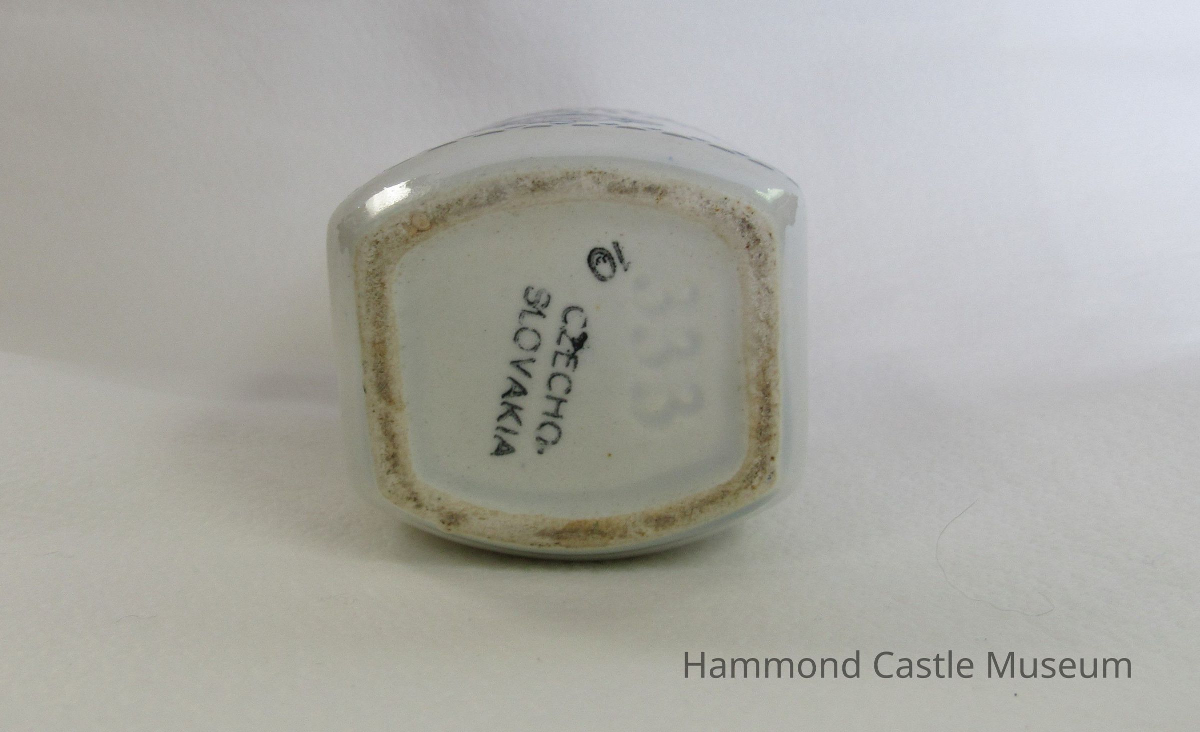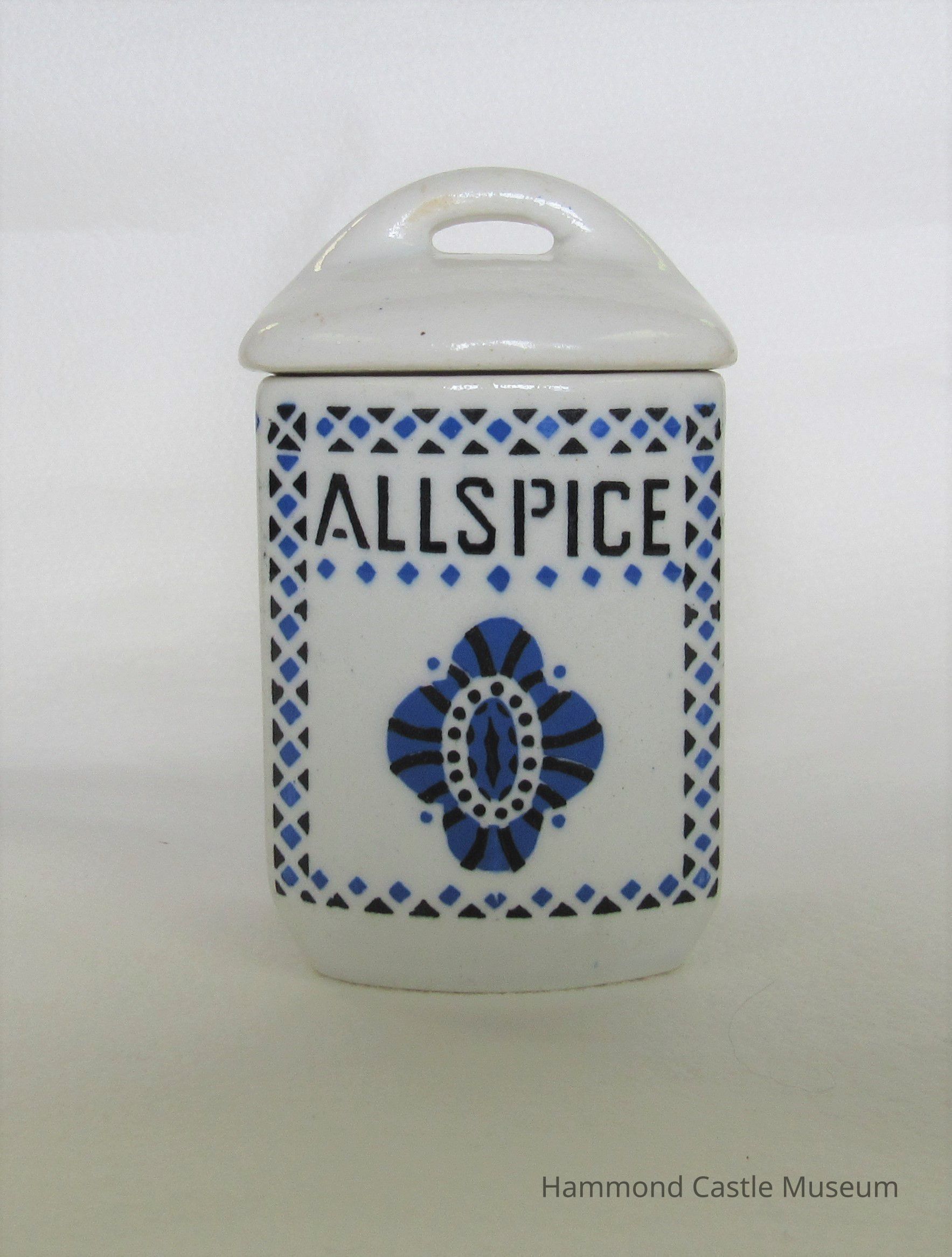 Czechoslovakian food cannister cover. Barley, rice, etc. White. Blue hatching. Impressed: YVONNE 357 Czech. 7 and 22 (note: only first and last of series are marked)