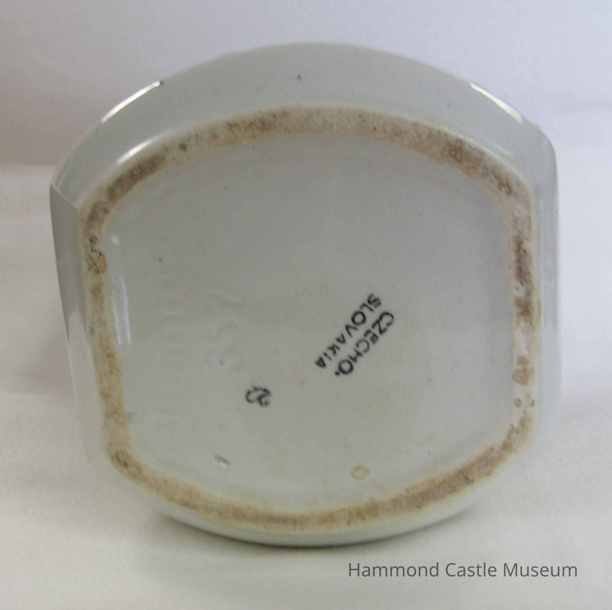 Czechoslovakian food cannister set. Barley, rice, etc. White. Blue hatching. Impressed: YVONNE 357 Czech. 7 and 22 (note: only first and last of series are marked)