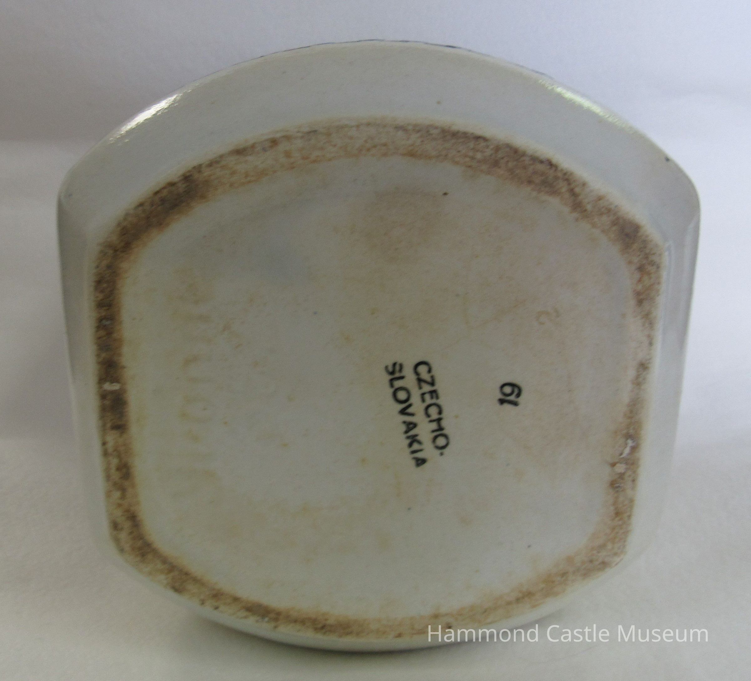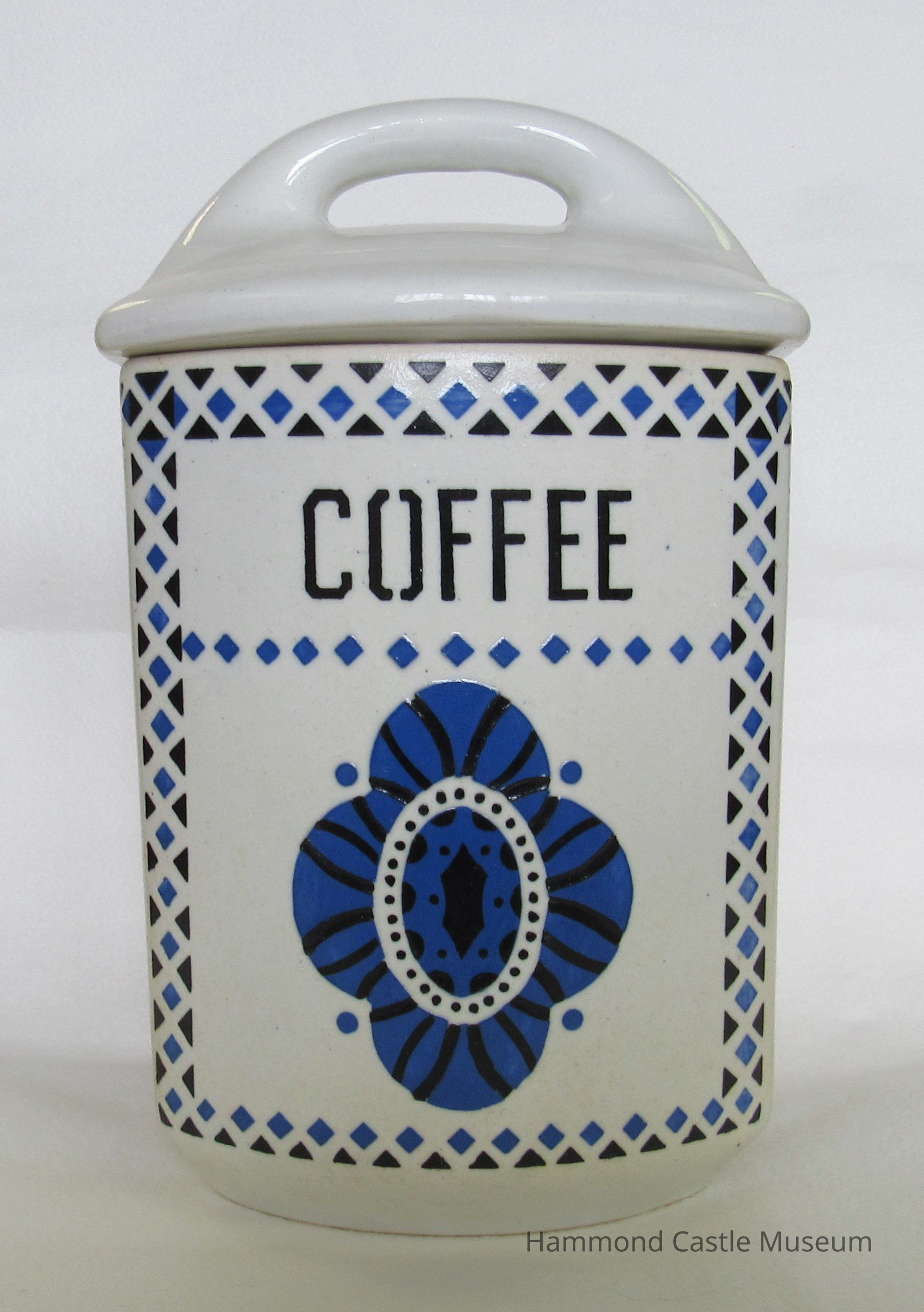 Czechoslovakian food cannister set. Barley, rice, etc. White. Blue hatching. Impressed: YVONNE 357 Czech. 7 and 22 (note: only first and last of series are marked)