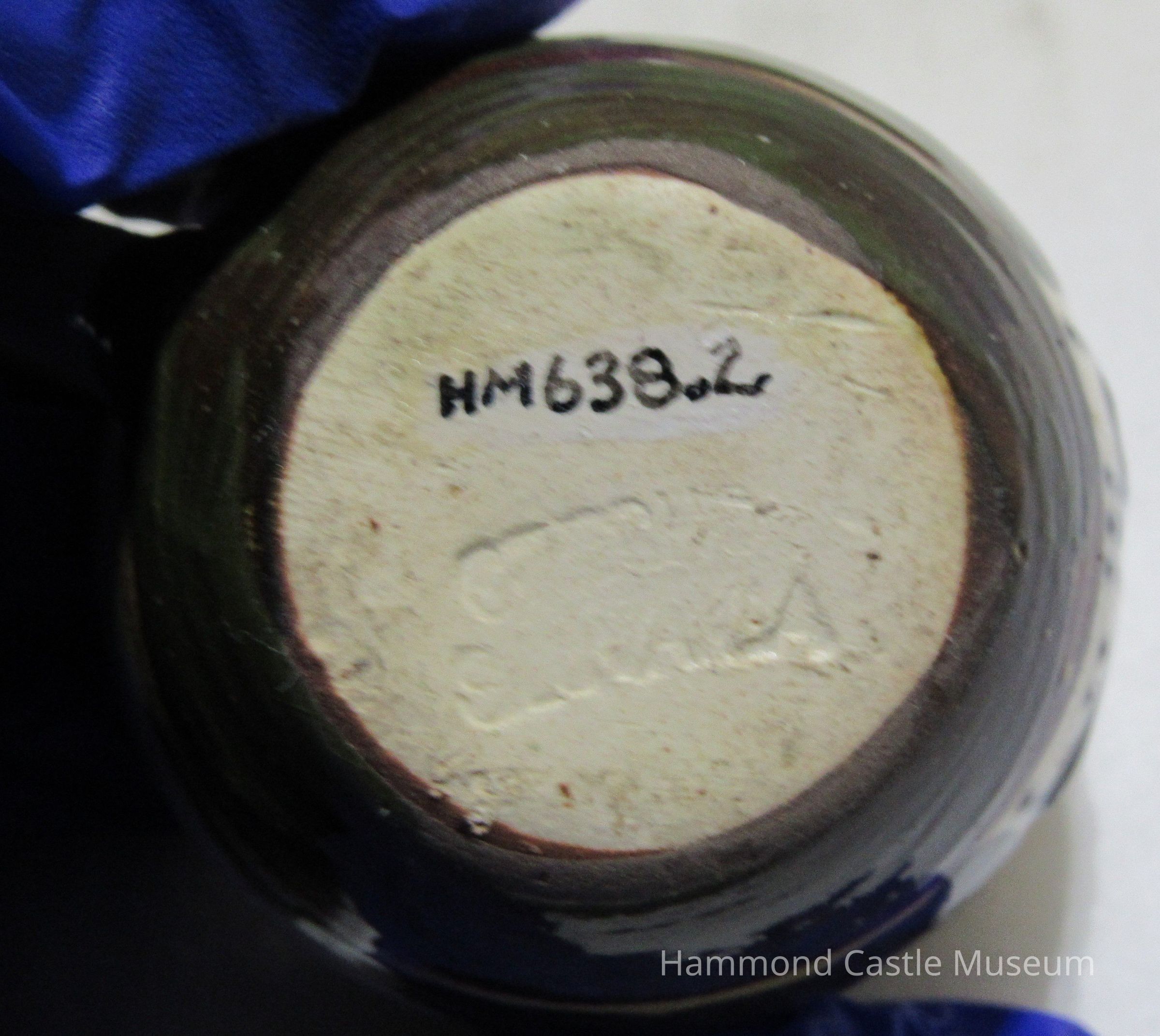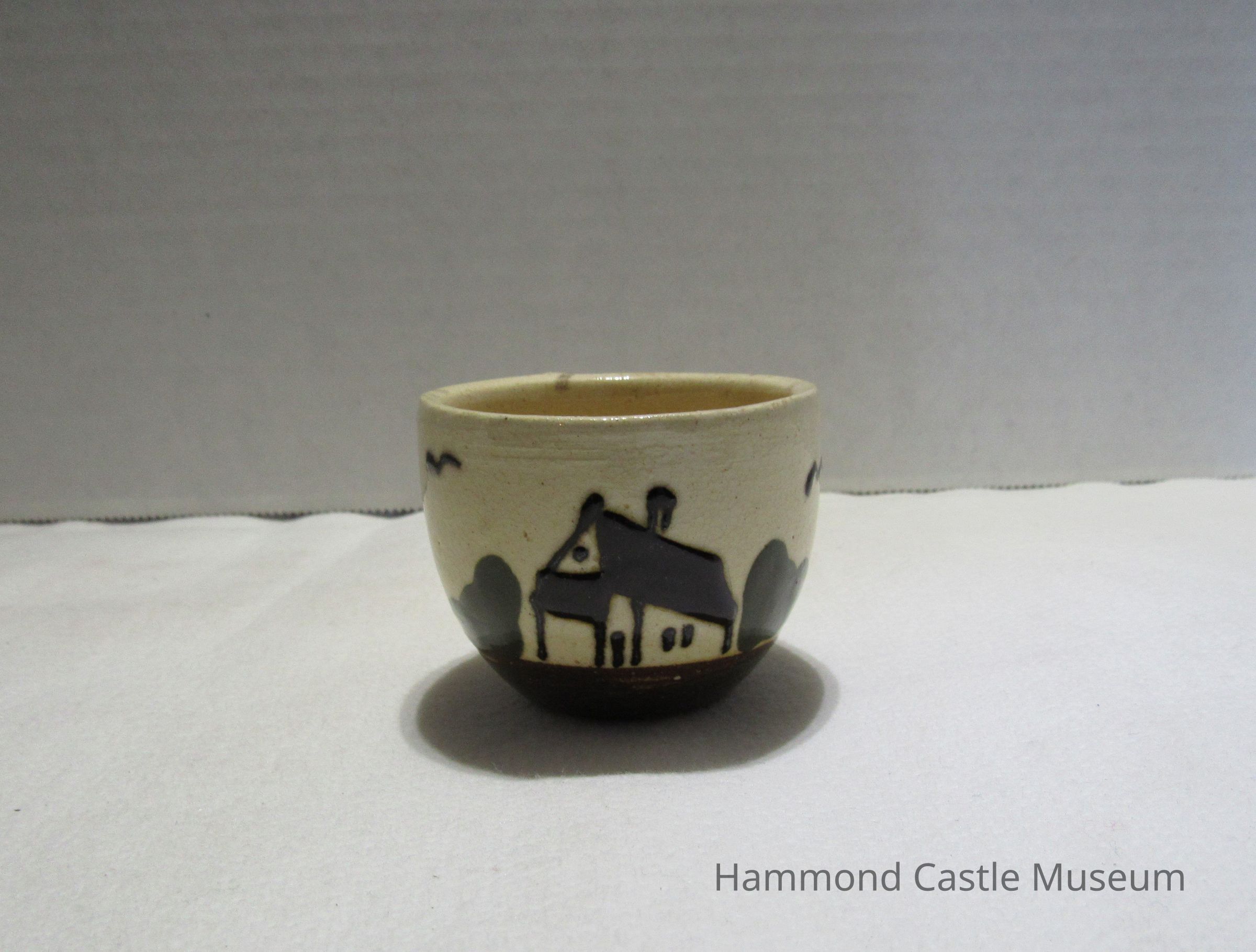 Czechoslovakian earthenware demitasse cup. Hand-painted in cream/green/brown farmhouse scene. Marking: CZECHOSLOVAKIA V Impressed: P.A.W.