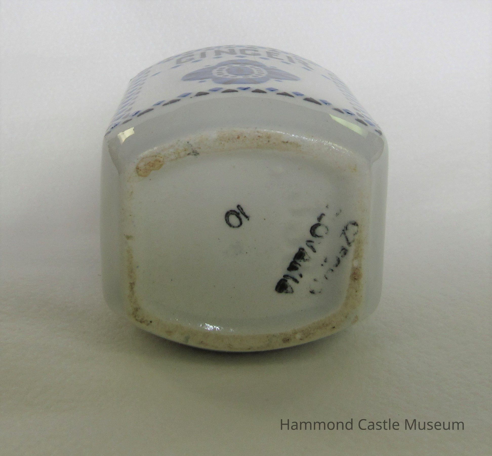Czechoslovakian food cannister cover. Barley, rice, etc. White. Blue hatching. Impressed: YVONNE 357 Czech. 7 and 22 (note: only first and last of series are marked)