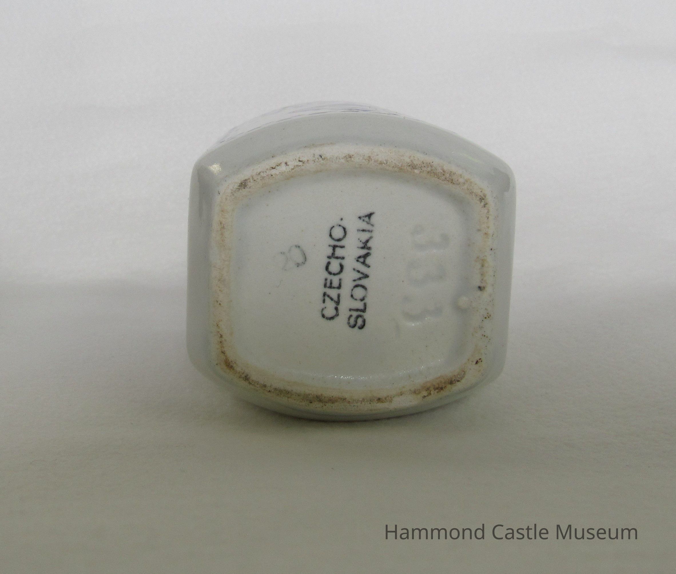 Czechoslovakian food cannister cover. Barley, rice, etc. White. Blue hatching. Impressed: YVONNE 357 Czech. 7 and 22 (note: only first and last of series are marked)