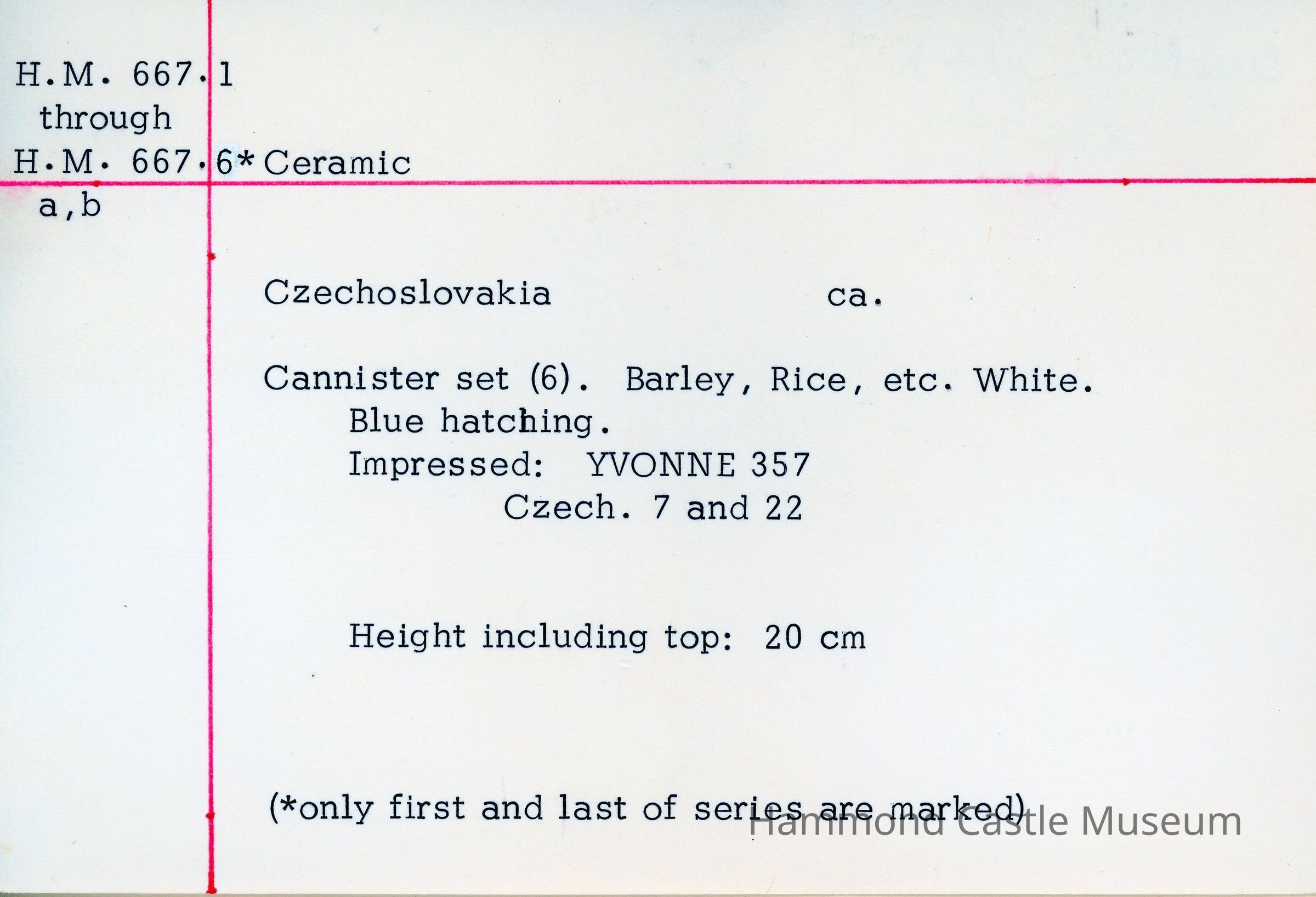 Czechoslovakian food cannister set. Barley, rice, etc. White. Blue hatching. Impressed: YVONNE 357 Czech. 7 and 22 (note: only first and last of series are marked)