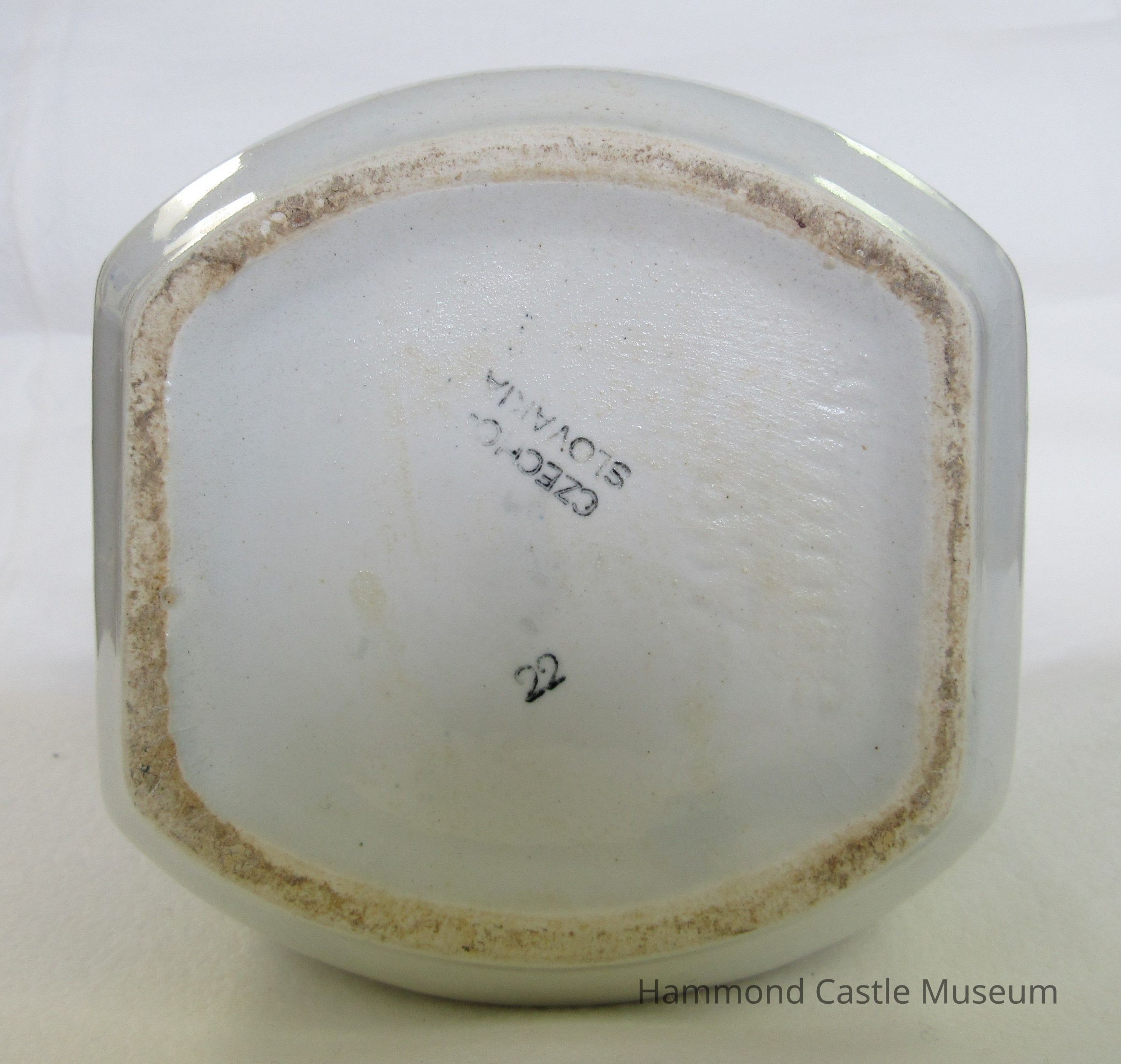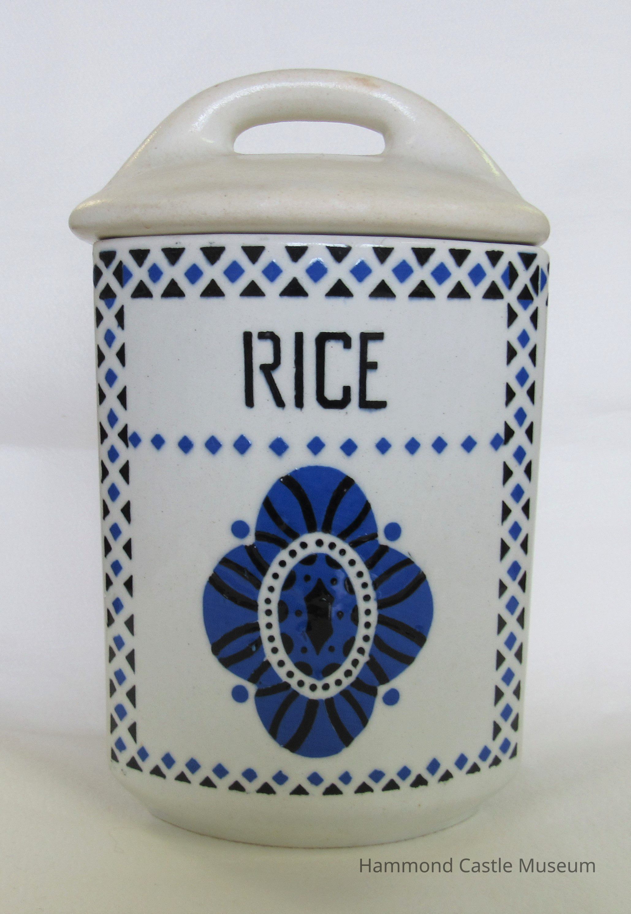 Czechoslovakian food cannister cover. Barley, rice, etc. White. Blue hatching.