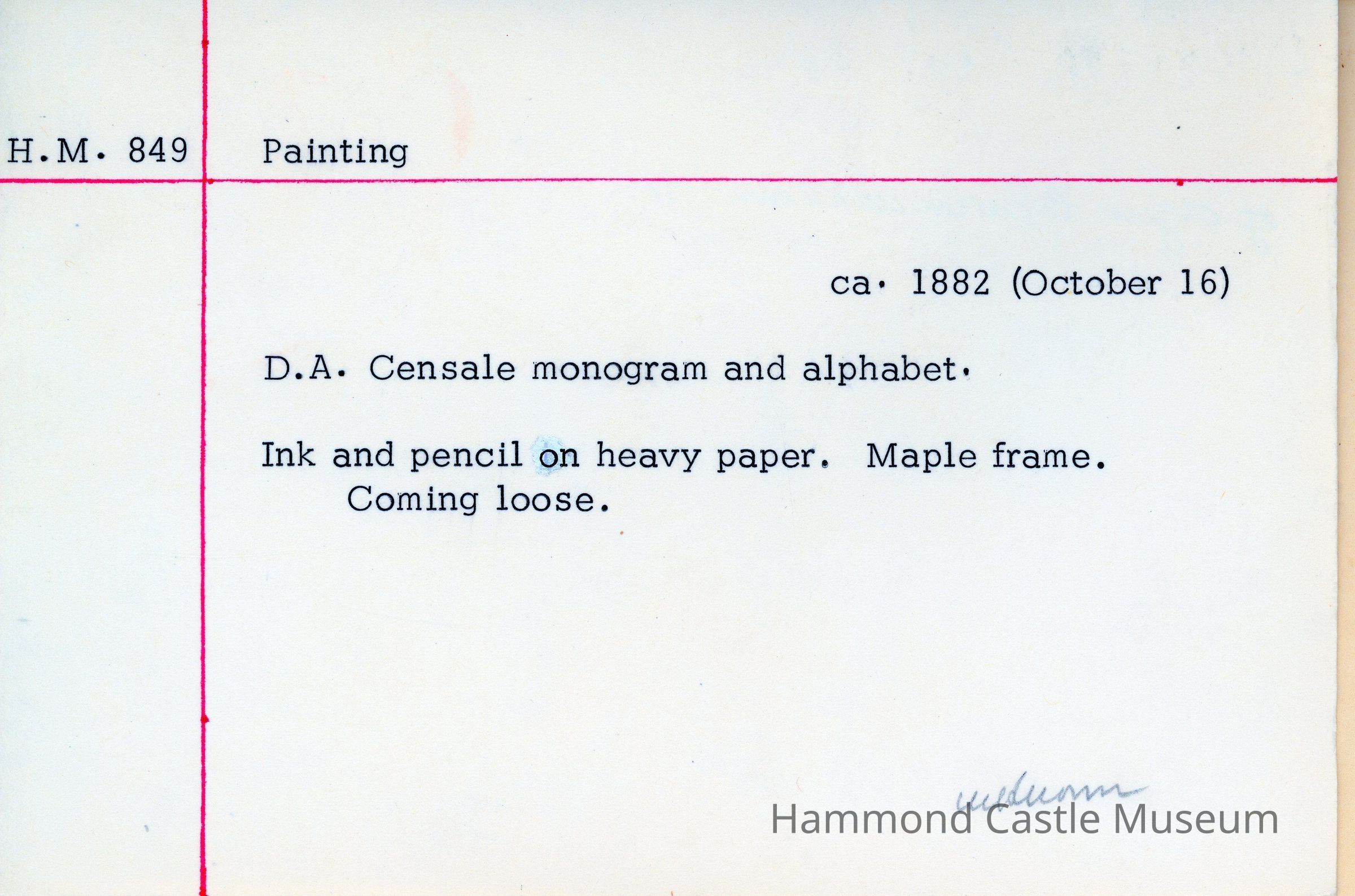 D.A. Censale monogram and alphabet. Ink and pencil on heavy paper. Maple frame. Coming loose.Collection