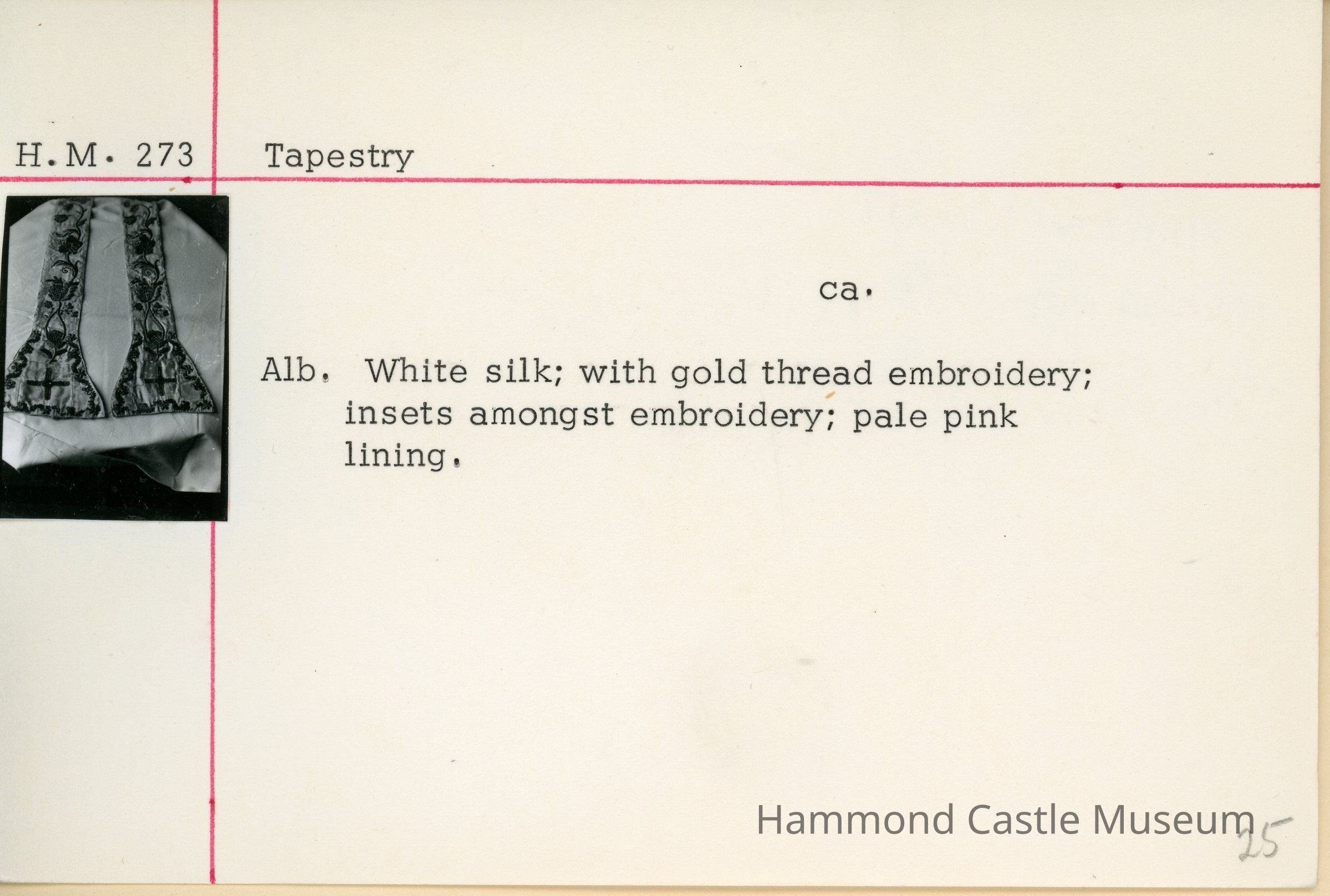 liturgical stole in white silk with gold thread embroidery; insets amongst embroidery; pale pink lining
