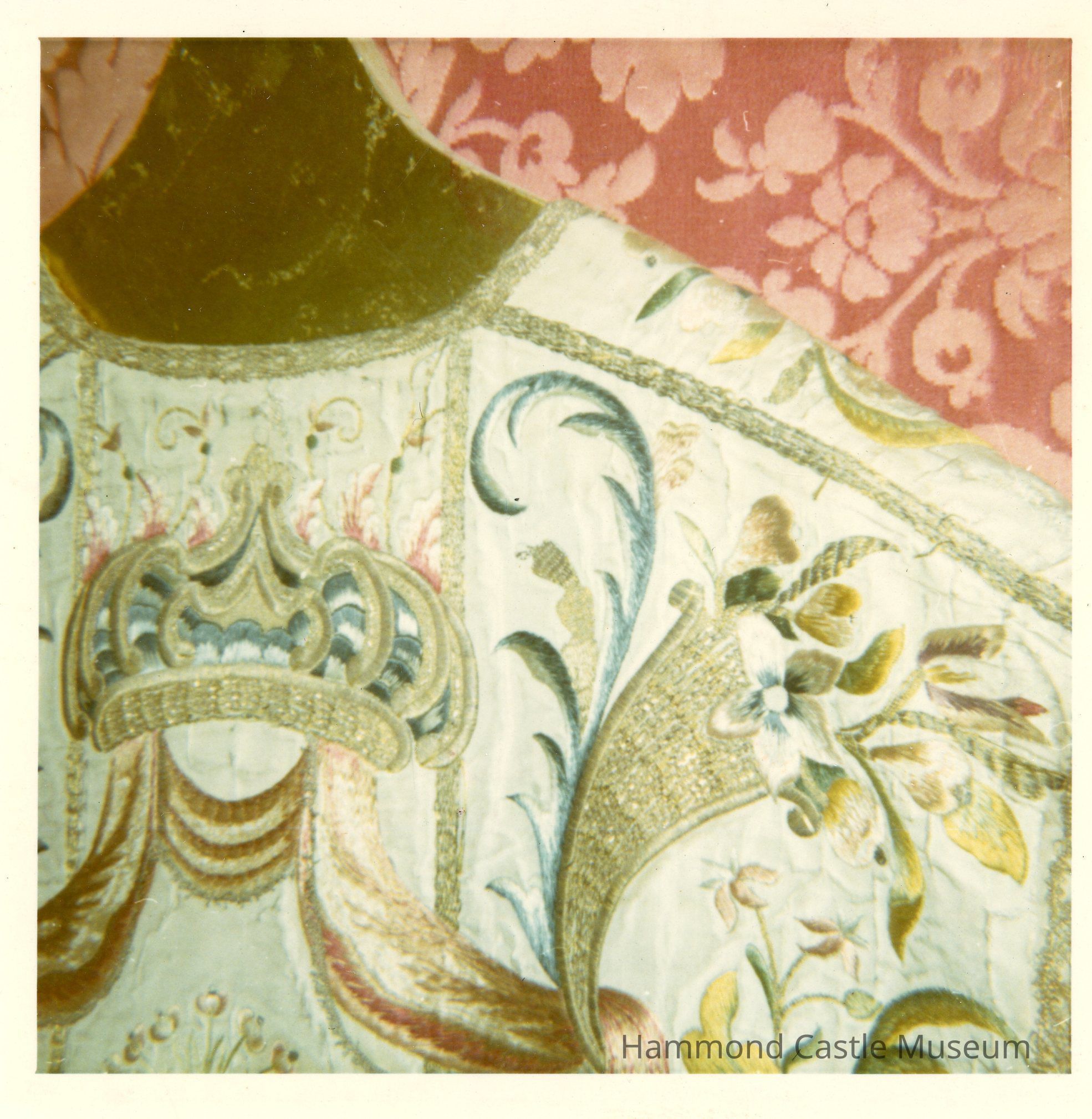 "The chasuble is of wide cut, of plain weave white silk (white was used for church festivals) decorated with luxurious floral and pomegranate designs. These multi-colored embroidered designs are complemented by gold threads couched in stem-like patterns. The edges of the chasuble are trimmed with strips of gold metallic lace."