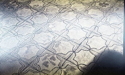 Hooked floor rug with geometric patterns in faded green, pink, and yellow flowers in square's centers (?), grey trim