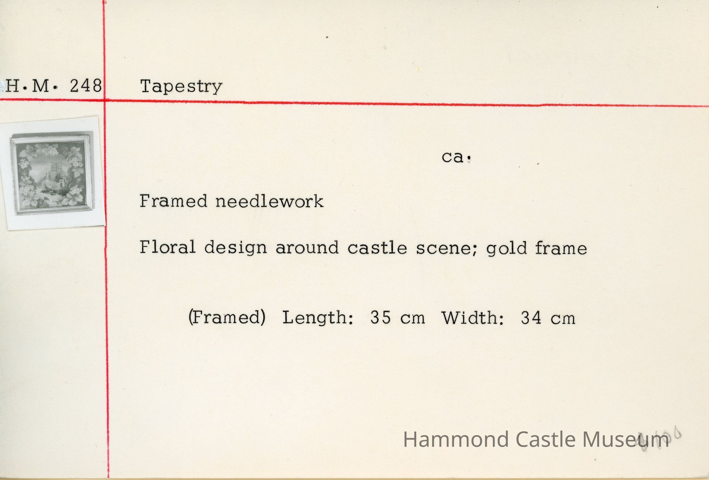 Framed velvet or petti point picture with floral design around castle scene Gold frame In Lower Guestroom when Hammond died 1965