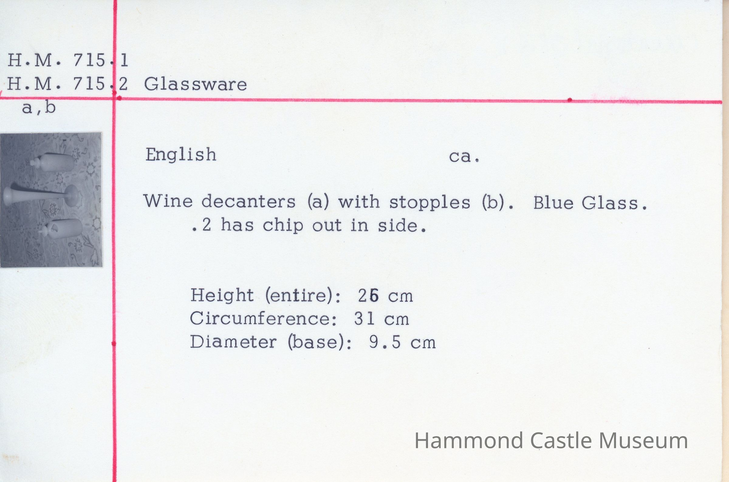 Pair of English blue glass decanters w stoppers (a&b) .2 has chip H: 25cm Cir: 31cm Dia: 9.5cm 1991 Deaccessioned to Sotheby's