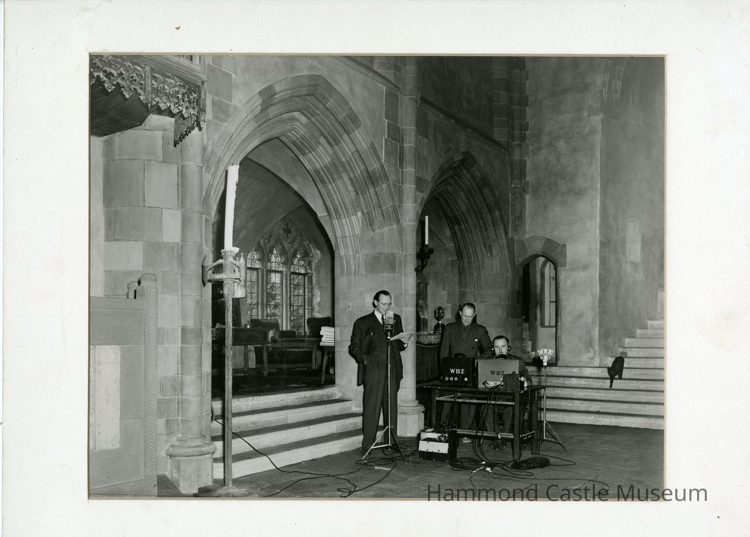 2 copies of photo from 1940 Daily Sunday Broadcast featuring organist Joseph Bonnet, black cat in background
