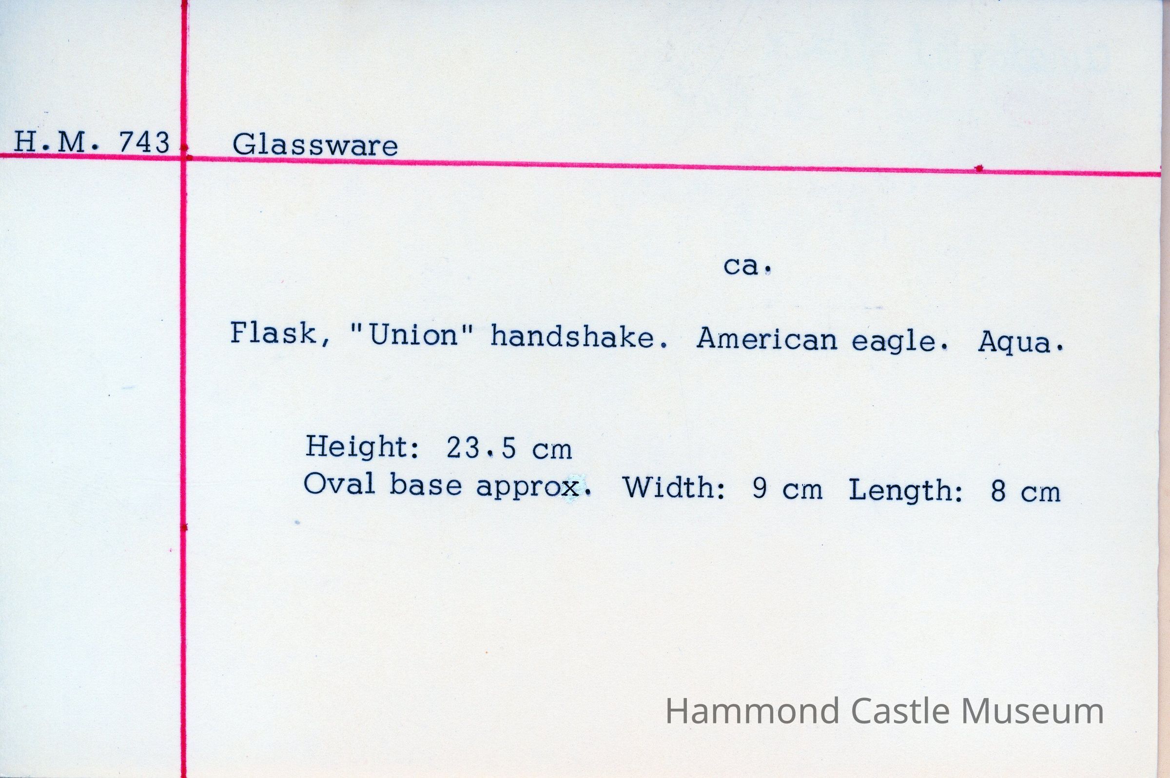 green pressed glass flask w eagle & handshake H: 23.5cm W: 9cm Deaccessioned 1991 for Sotherby auction