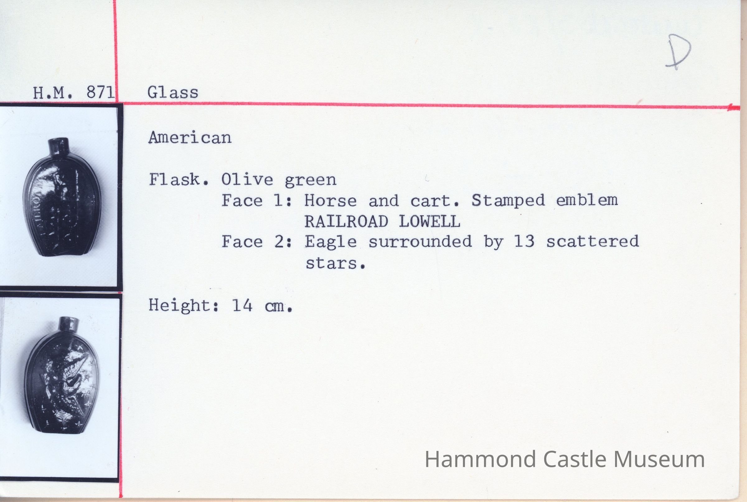 Green glass flask bottle stamped w Railroad Lowell & Eagle DEACCESSIONED 6-28-1991