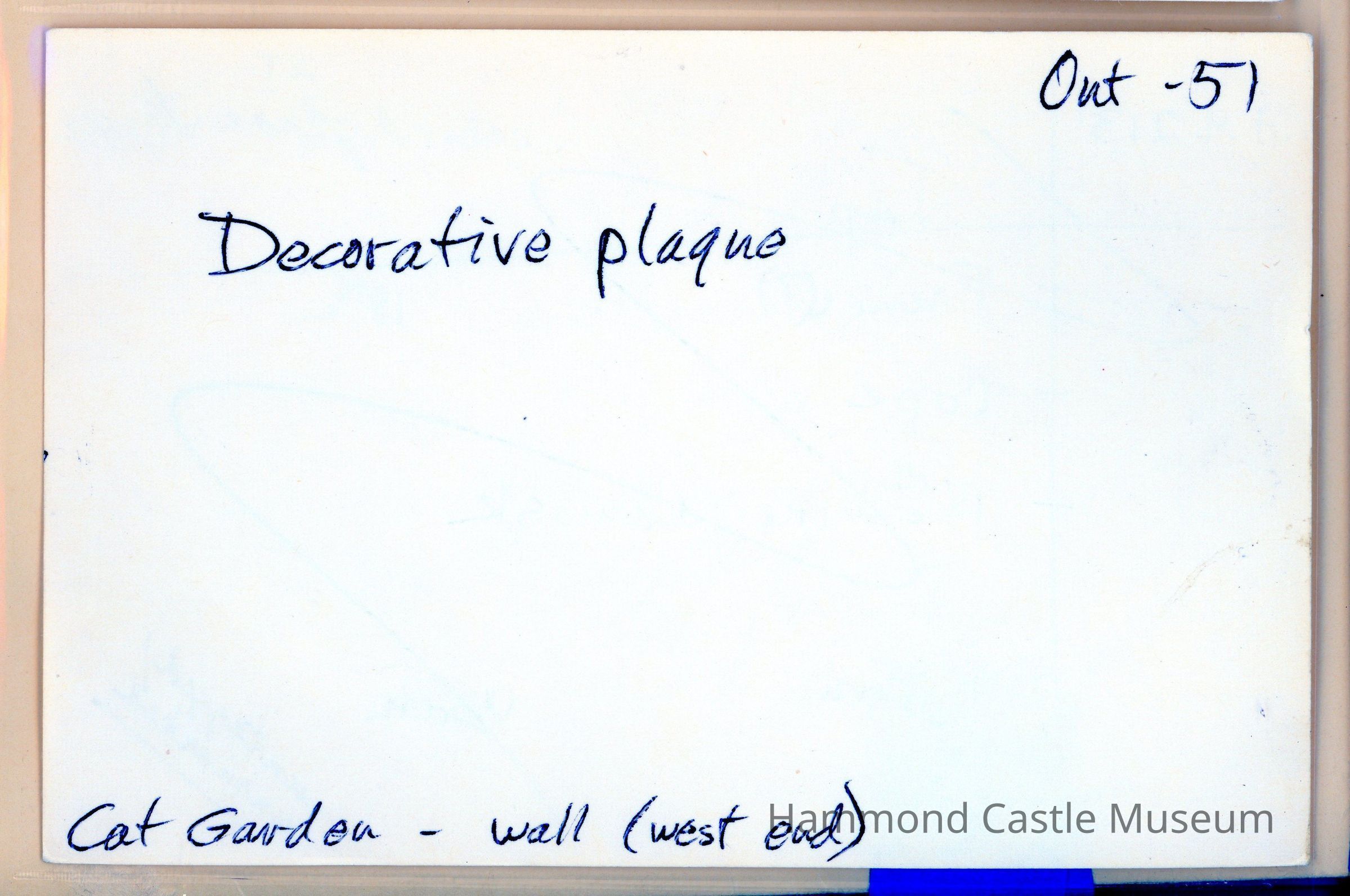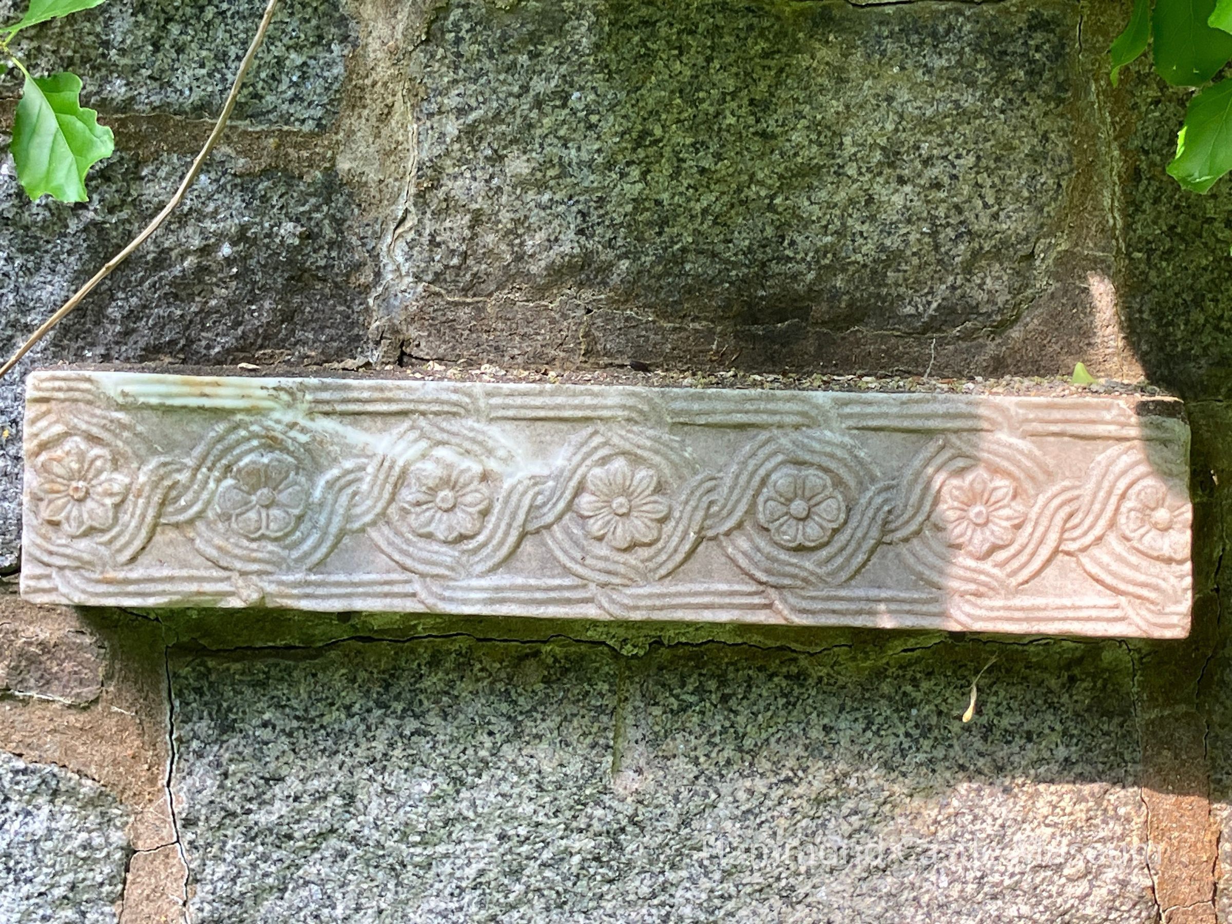 Decorative fragment/plaque on west end of cat garden wall Woven circles with flowers in centers pattern