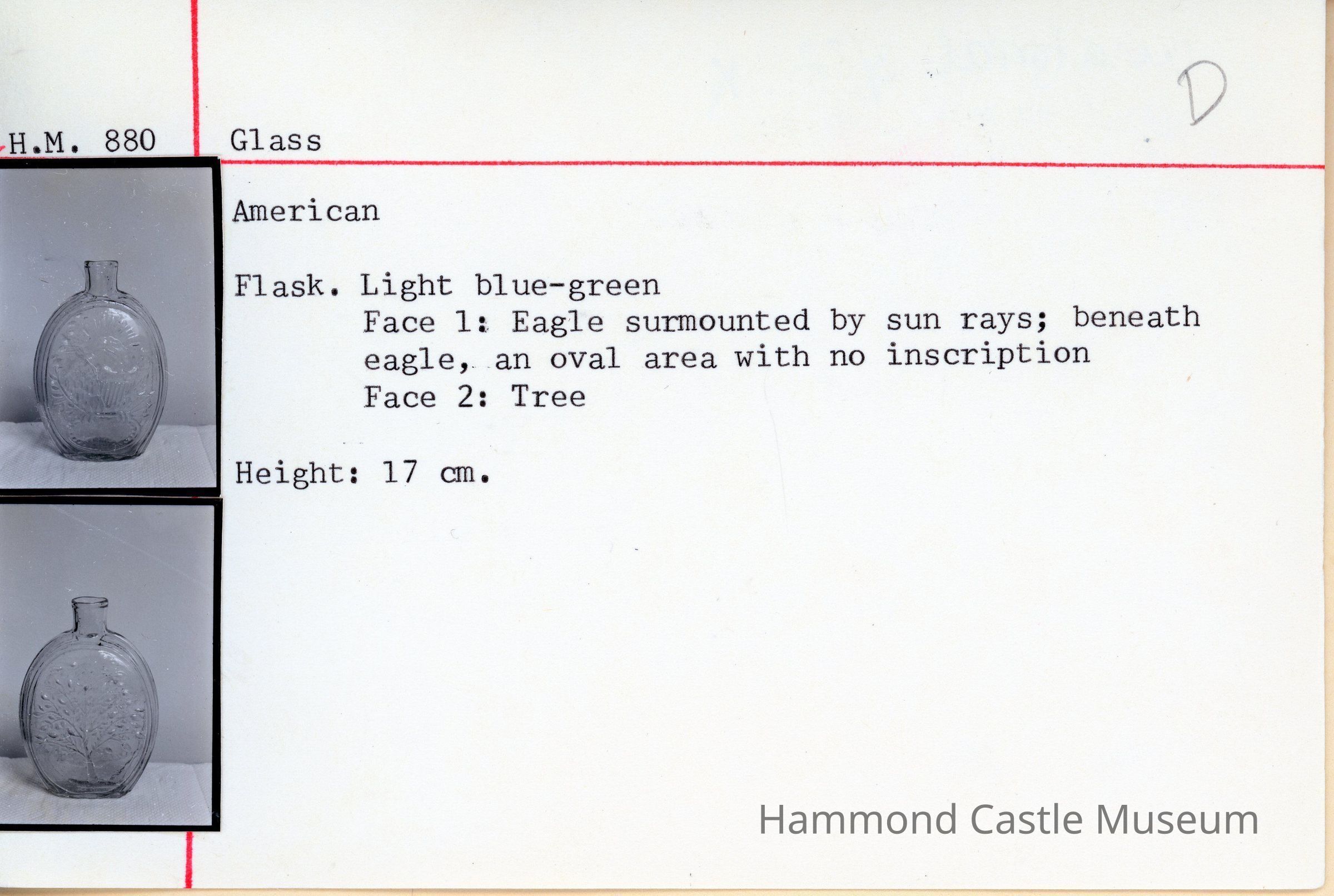 Blue glass flask bottle w eagle & tree DEACCESSIONED 6-28-1991