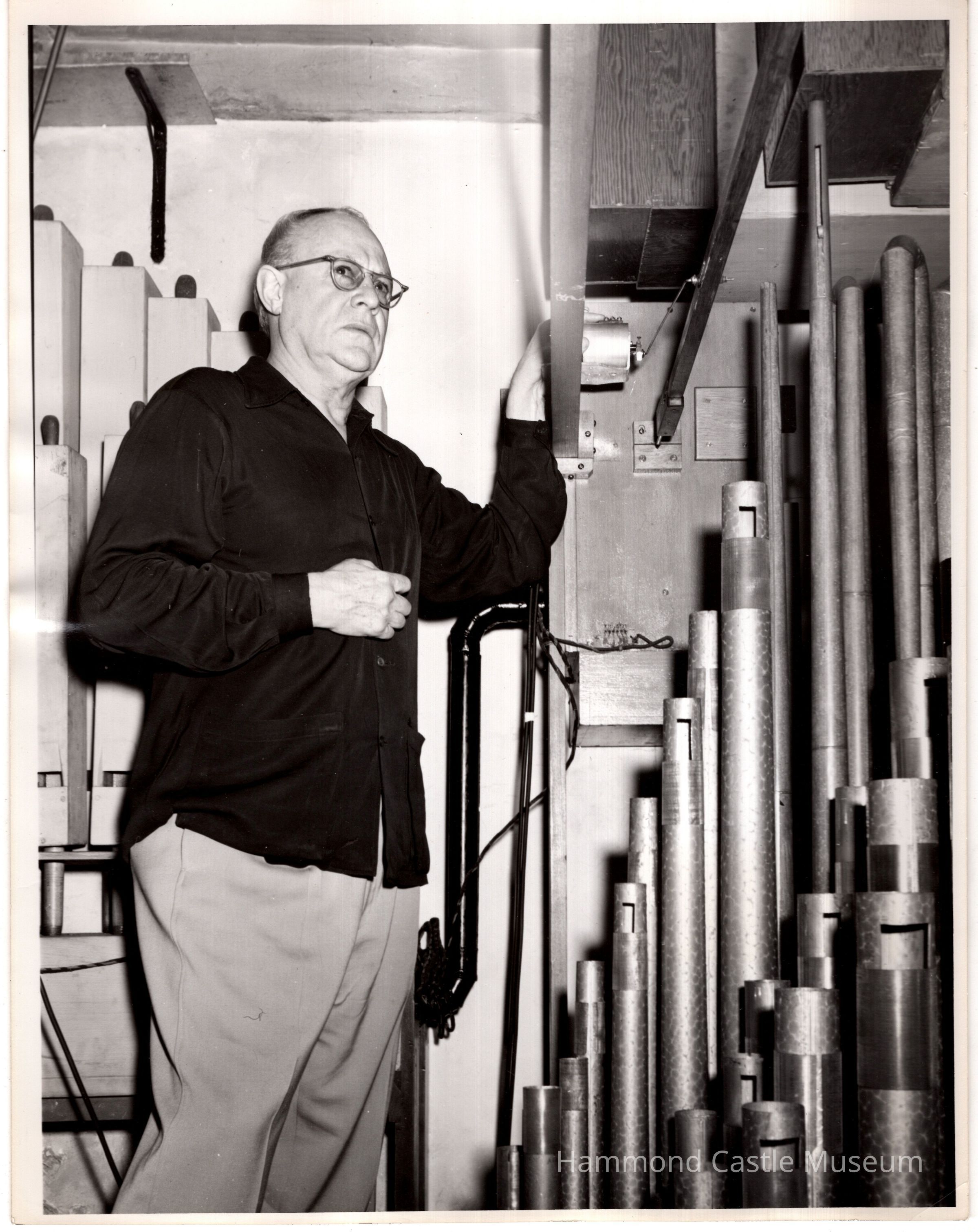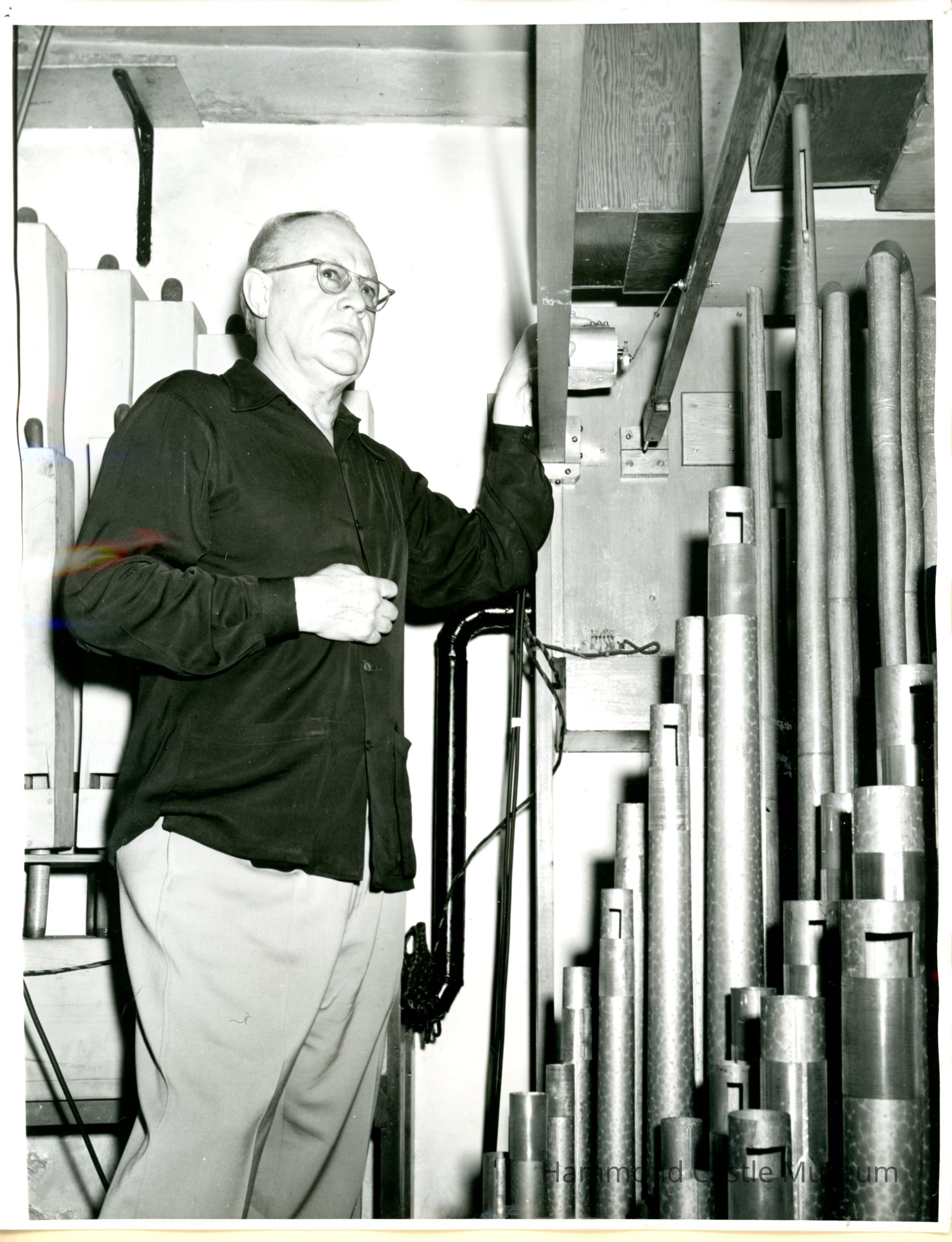 2 copies of photo taken 1950 ca of Hammond working on Organ Pipes Possible Bob Rapp image
