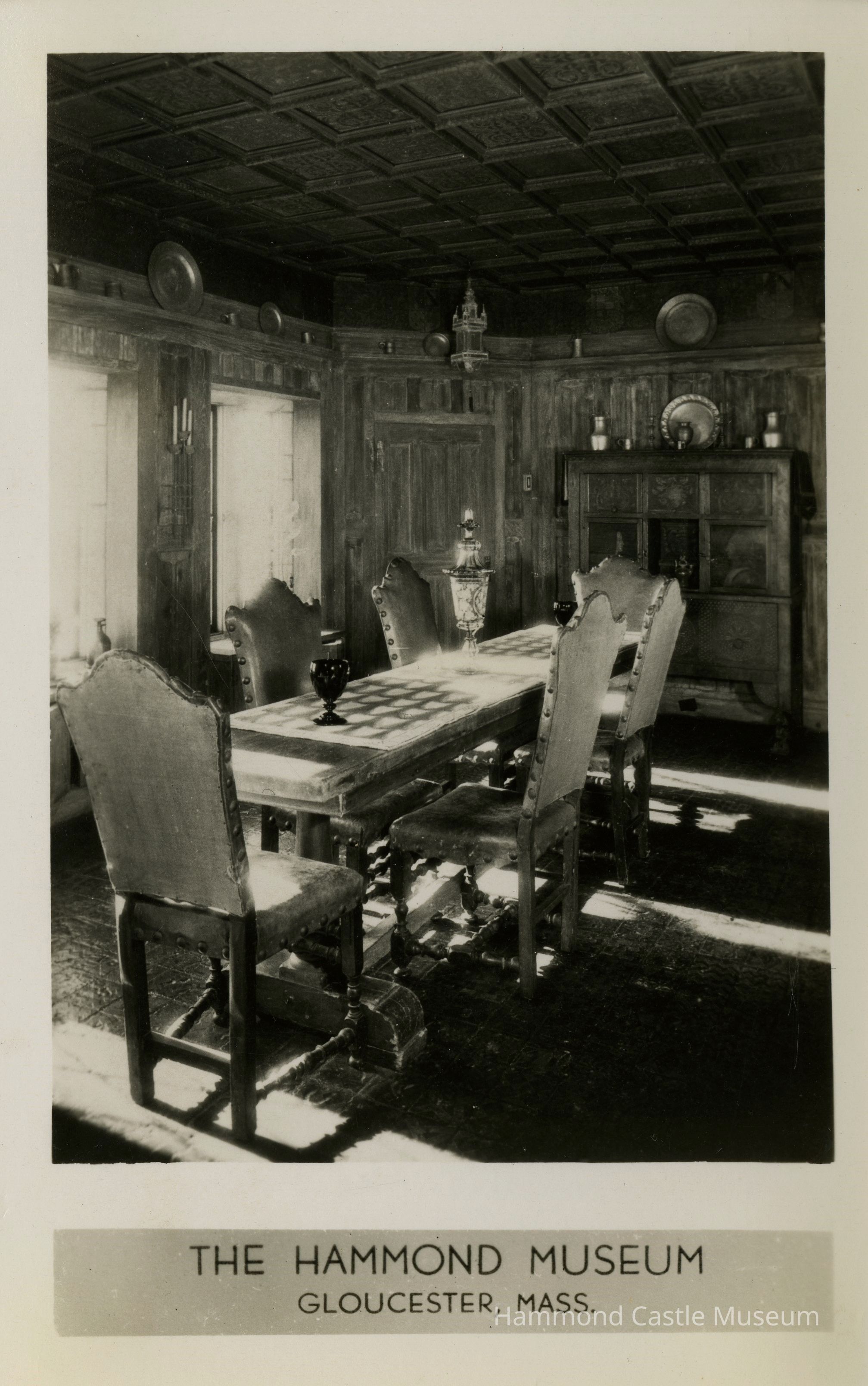 Early postcard of dining room, window side w pewter and original leather chairs