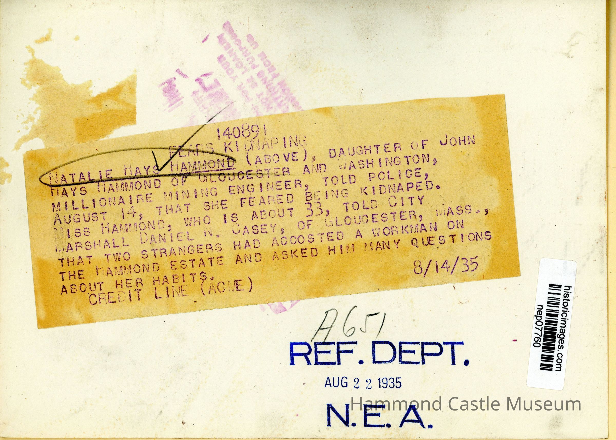 Natalie Hays Hammond, daughter of John Hays Hammond of Gloucester and Washington, millionaire mining engineer, told police, August 14, that she feared being kidnapped. Miss Hammond, who is about 33, told city marshall Daniel N. Casey, of Gloucester, Mass., that two strangers and accosted a workman on the Hammond estate and asked him many questions about her habits."