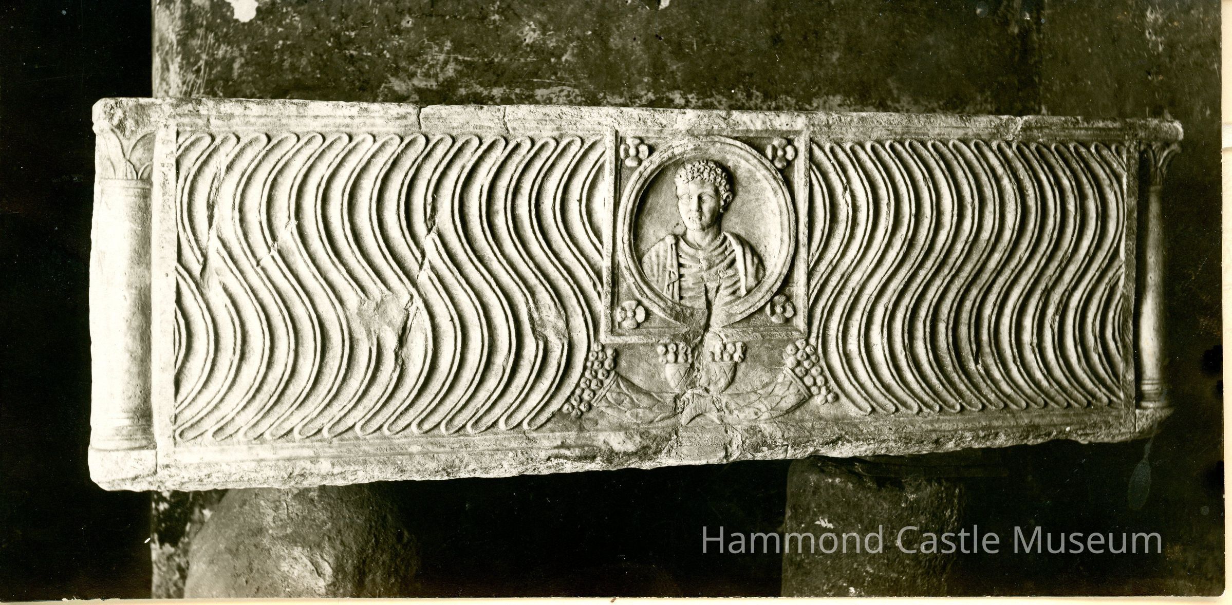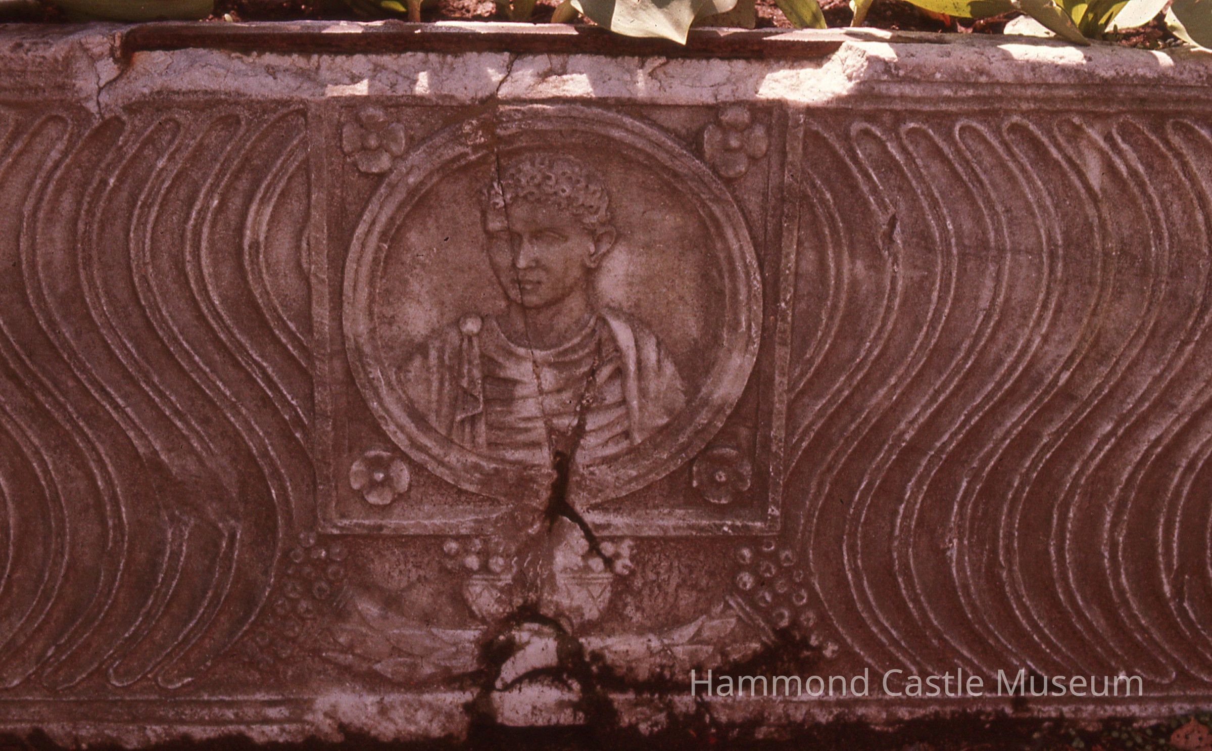 The chest was originally plain or minimally decorated and recarved probably in the 1920s to increase its financial value. Two sarcophagi by the same forger, or group of forgers, are in the Milles Collection, Lidingö, Sweden, and a third was on the art market in the 1960s in Rome. The forger or forgers had a preference for Roman Imperial portraits: the portrait on the Hammond Castle Museum sarcophagus is based on a famous image of Octavian (the future emperor Augustus) in the Capitoline Museum, Rome; the portrait on one sarcophagus in the Milles Collection is based on Nero’s portrait; and the portrait’s hairstyle on the sarcophagus formerly on the Roman art market recalls that of Empress Faustina Minor.