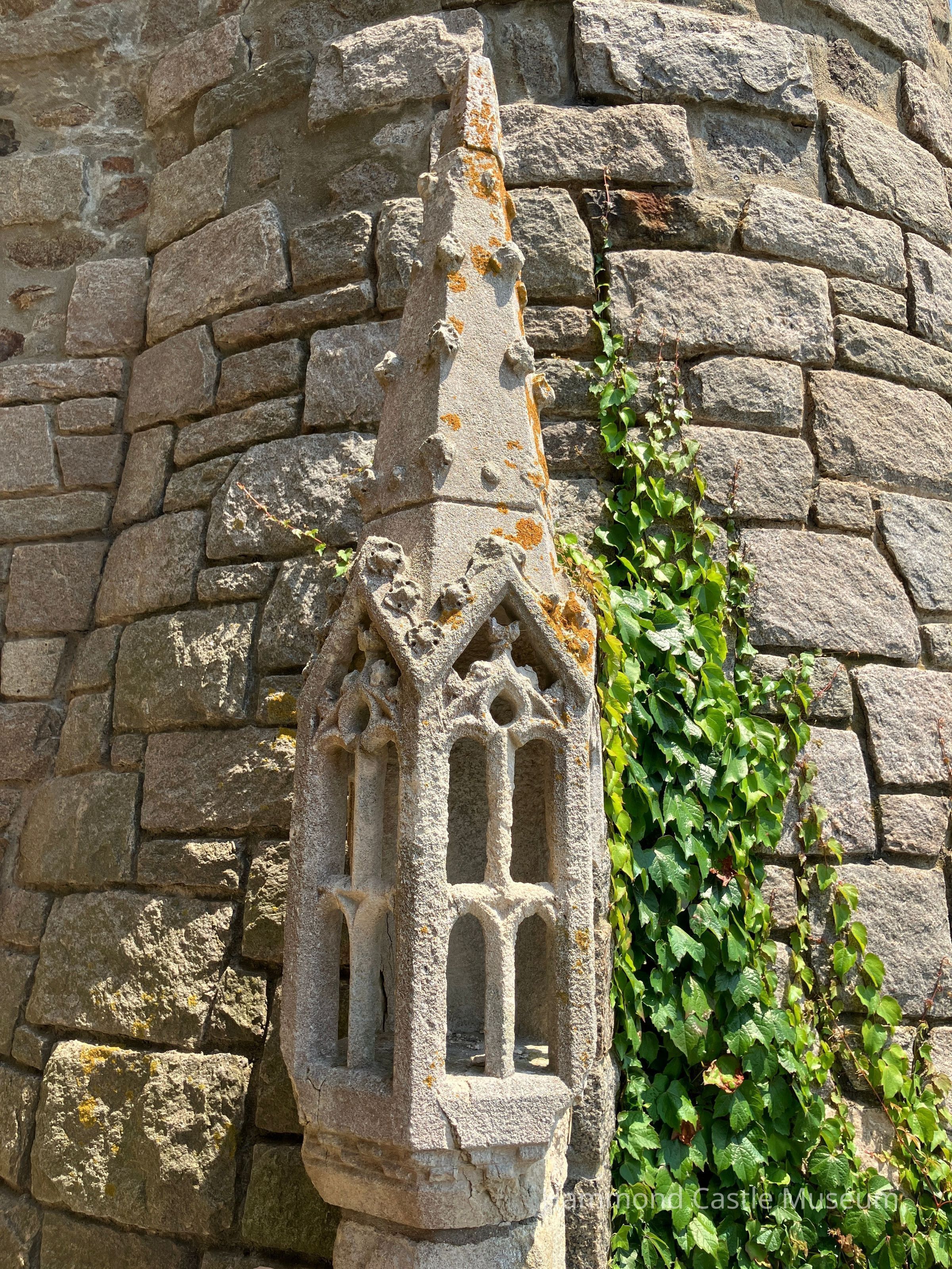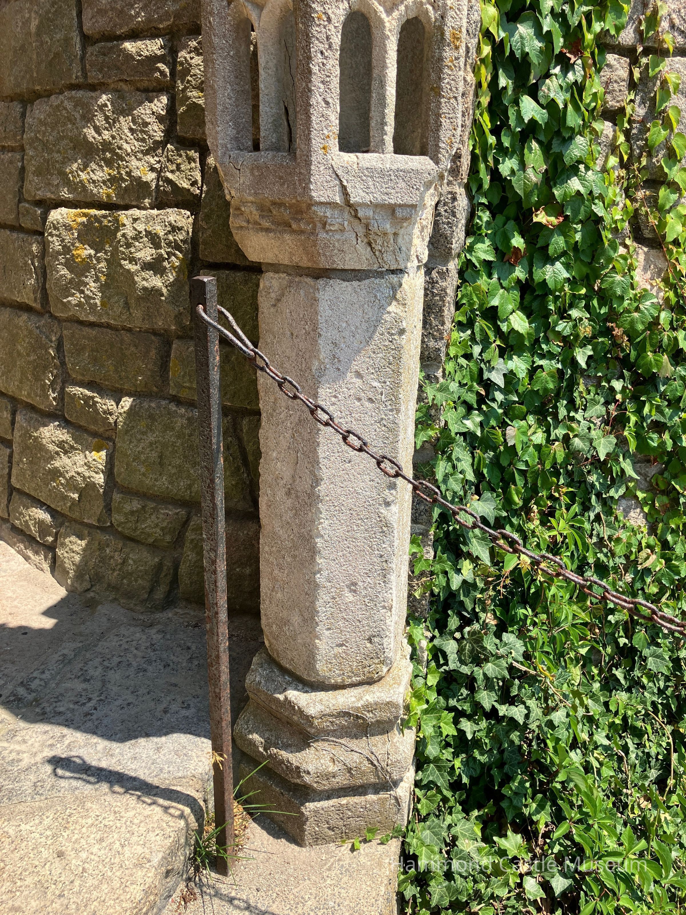 Hexagonal plain slender column on conforming base, surmounted by a lantern of openwork fenestral tracery and a spire studded with small rosettes