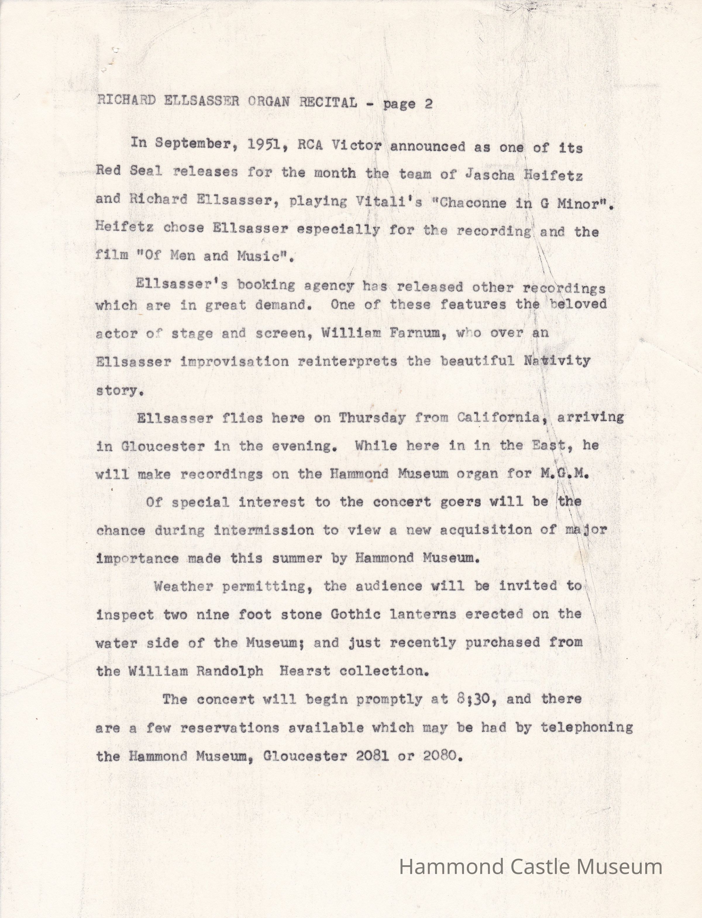 1952-08-29 Organ Concerts, Ellsasser PR, Hearst stone lanterns, Lubeck organ screenNote Type