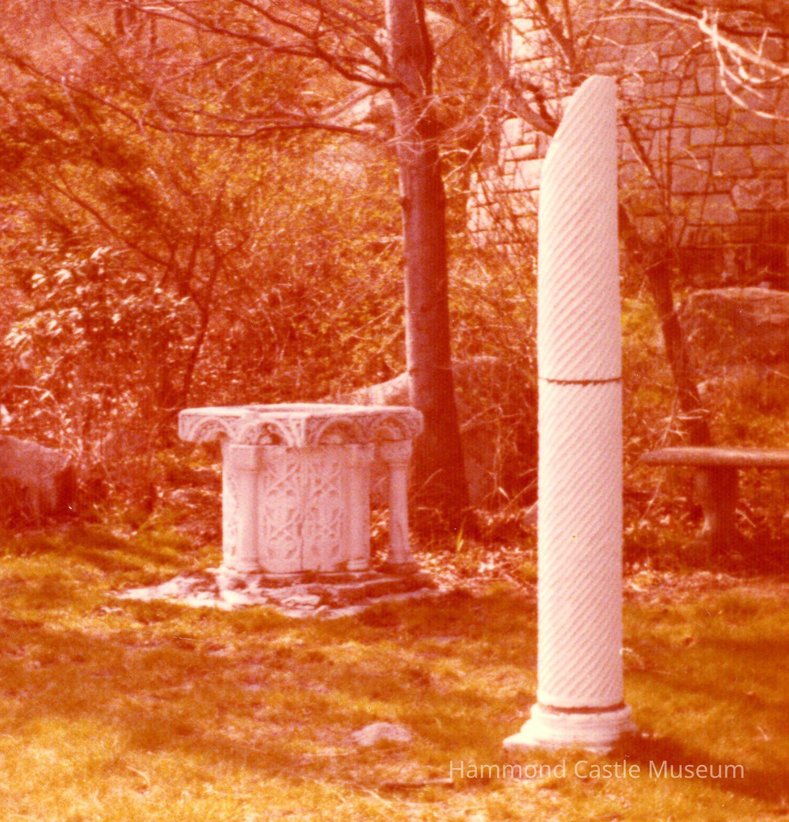 Column & base on west end of ocean lawn Currently broken and laying in undergrowth *2024 2 columns originally part of bell tower arches added to same location