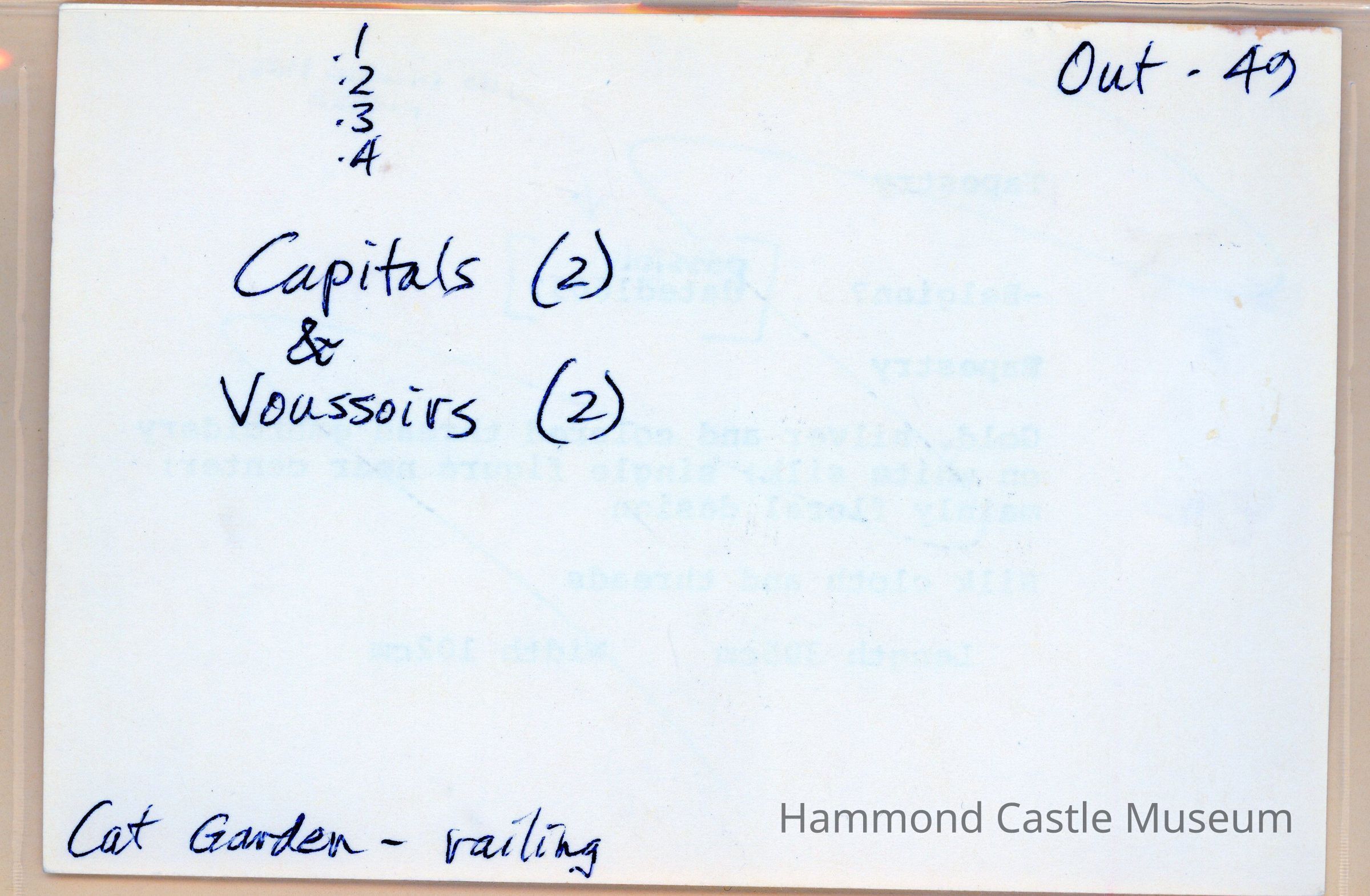 Capitals & Archway Pieces (on railing in cat garden)Entry/Object ID