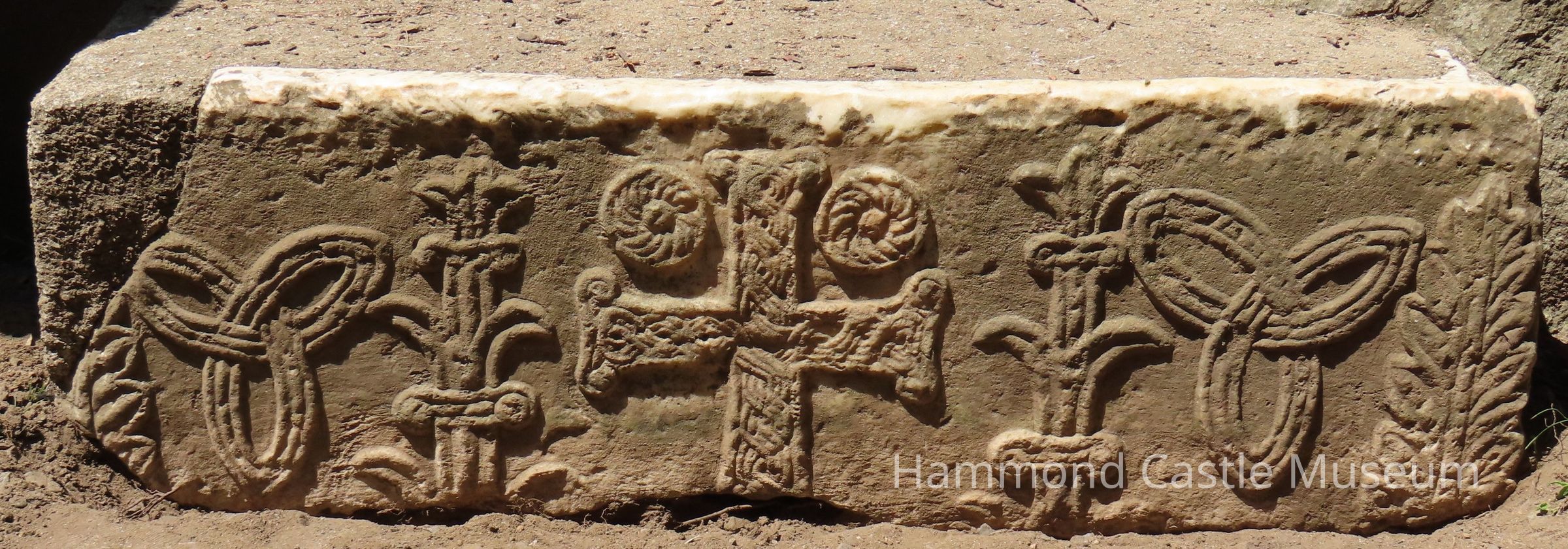 Cross Relief Sarcophagus Fragment Originally a side of a child's sarcophagus Decorative cross relief with flowers on either side Cat garden step along path