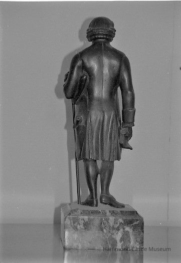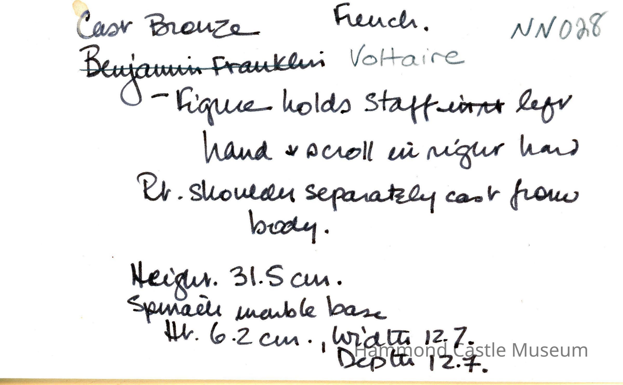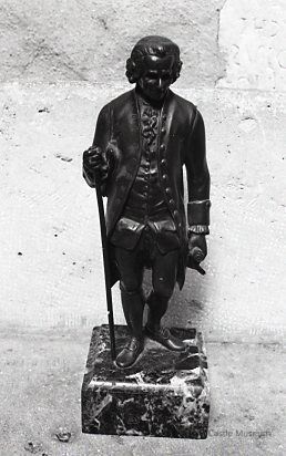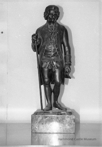 Bronze statue of Rousseau male figure in colonial outfit holding scroll and tricorner hat Formerly identified as Benjamin Franklin & Voltaire but inscribed as Rousseau In lower guestroom during Hammond's liftime