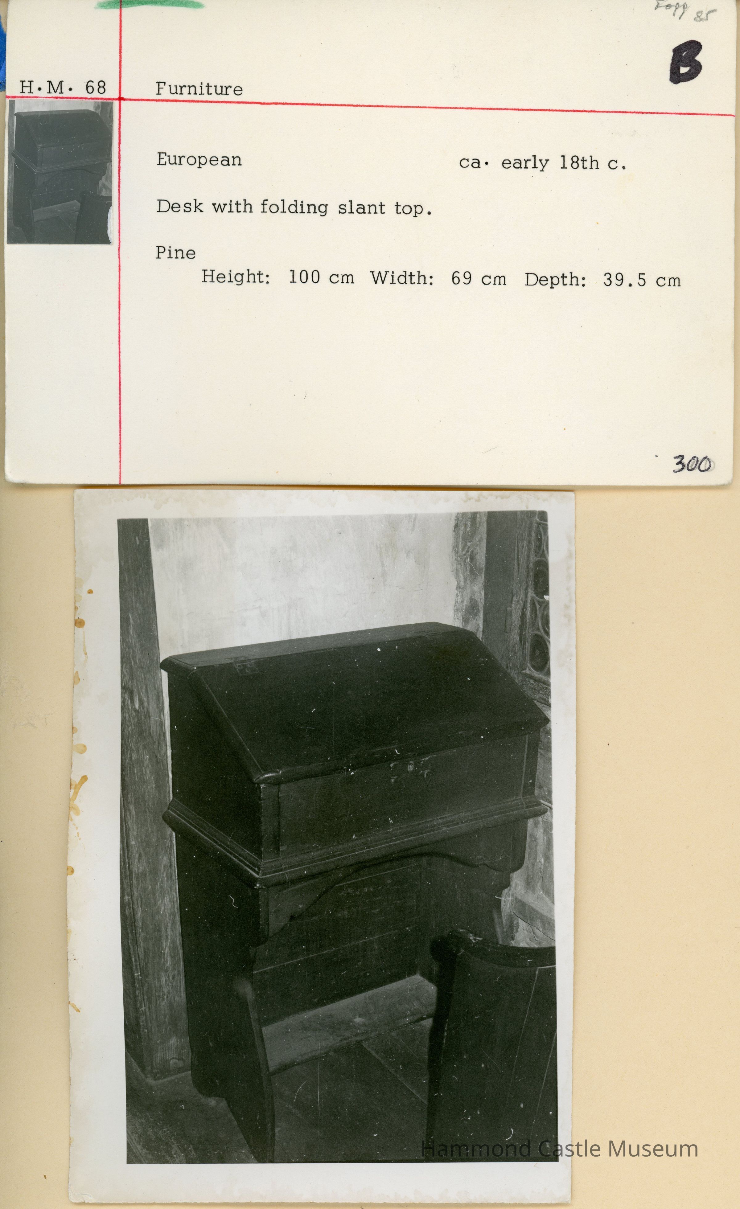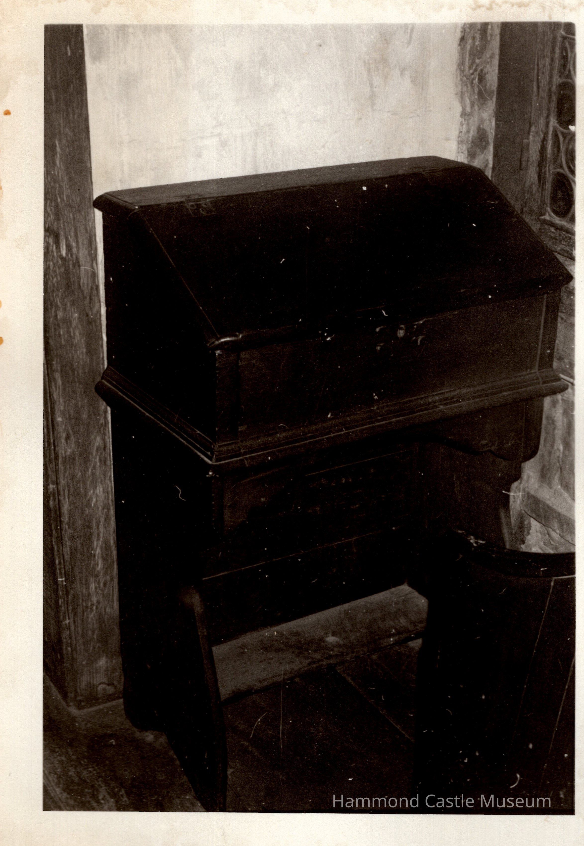 early 18th c. Lift Top Desk Yew wood 3 inner drawers, trestle base 1965 Probate Inventory - Sitting Room Entry