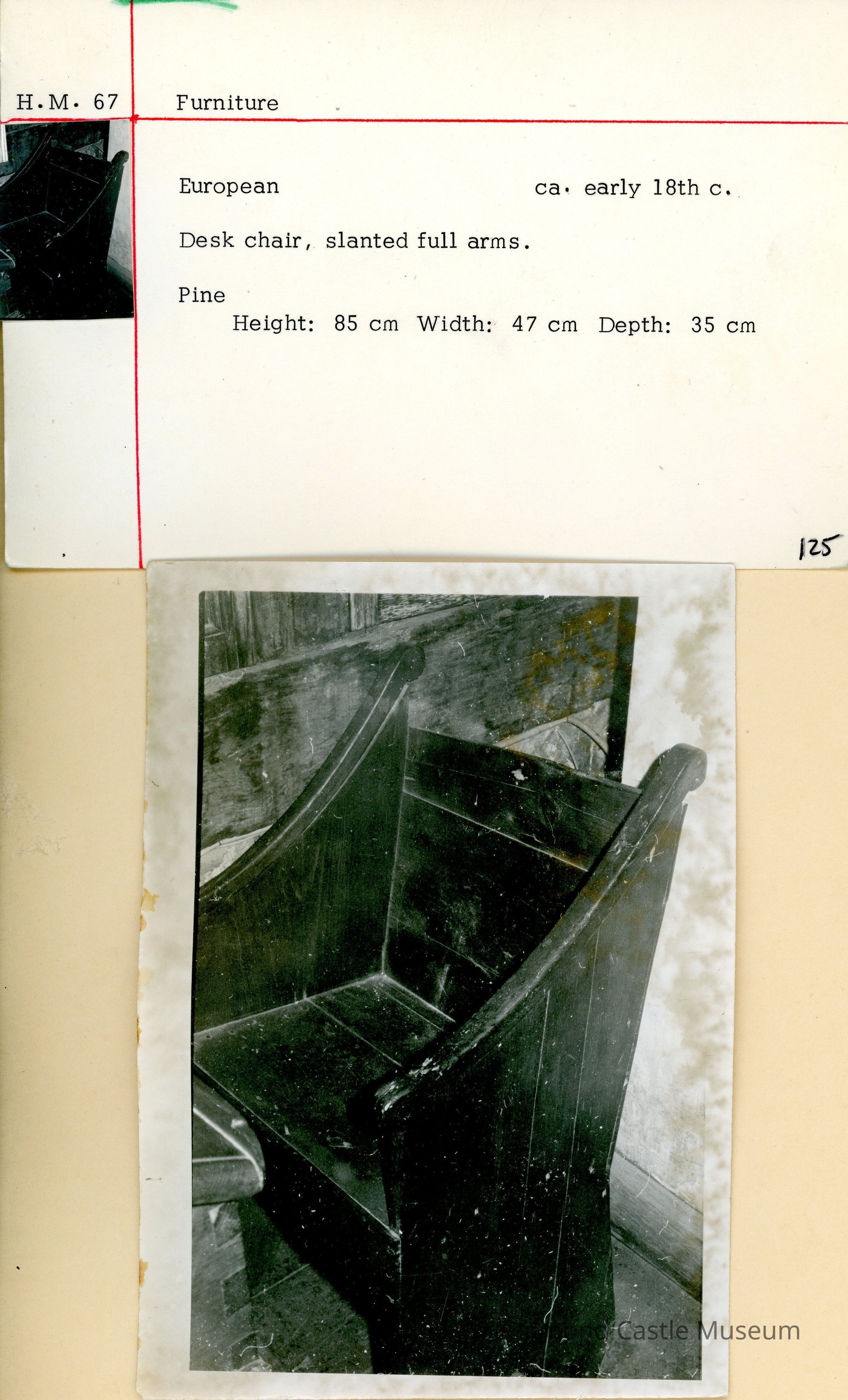 Desk chair, slanted full arms.