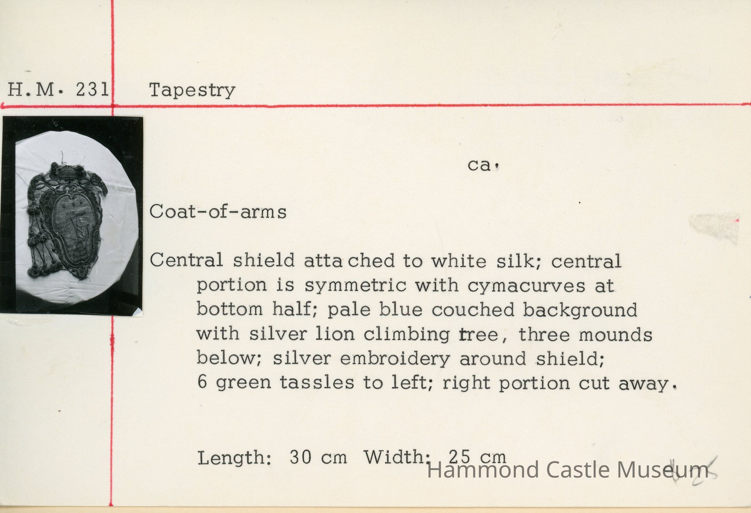 Embroidered Coat of Arms on White Silk with Lion Climbing TreeEntry/Object ID
