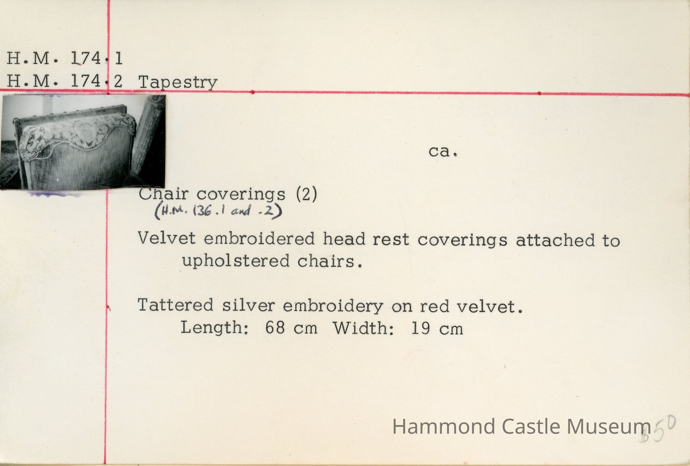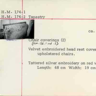 Pair of velvet embroidered headrest coverings attached to upholstered chairs (HM136. 1 and 2). Tattered silver embroidery on red velvet.