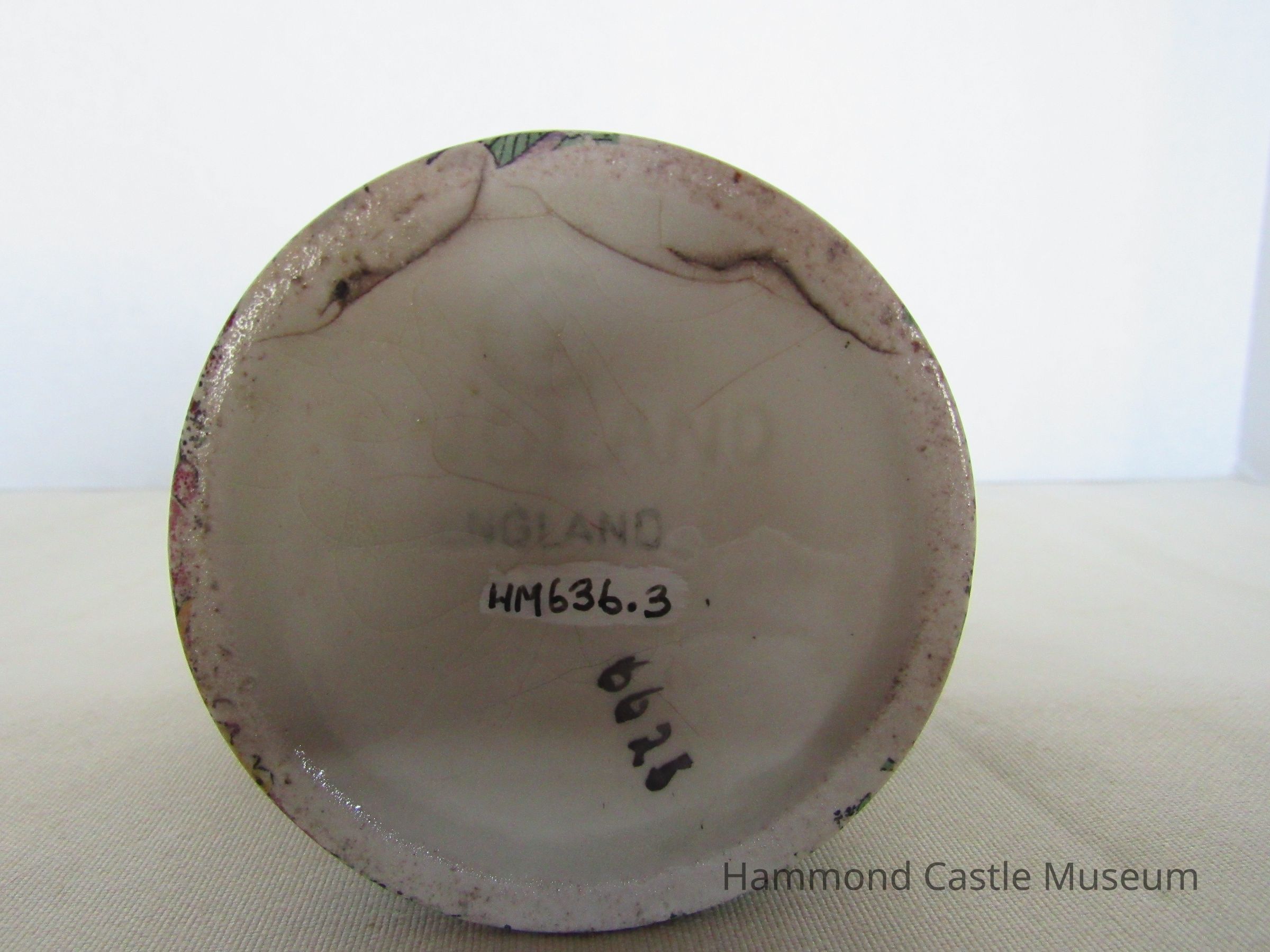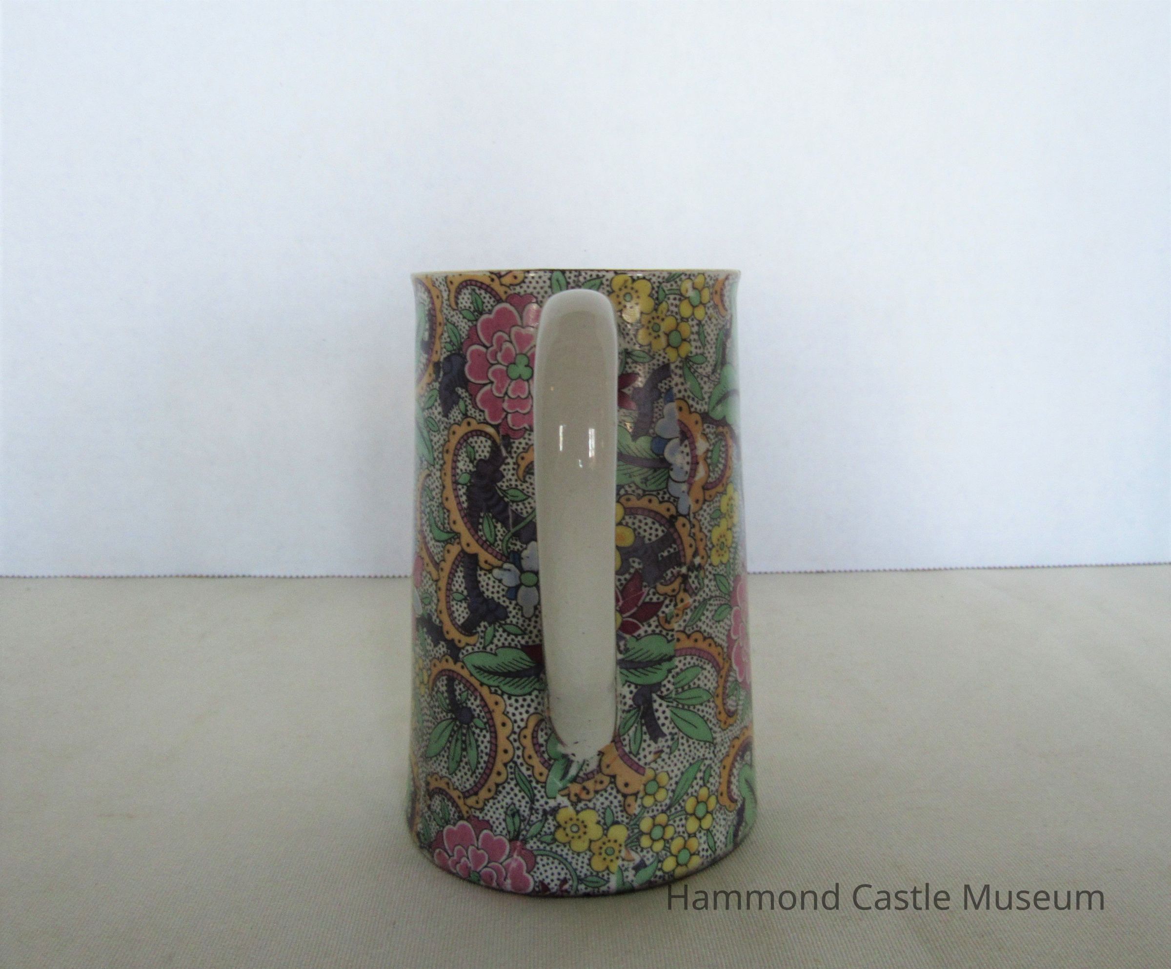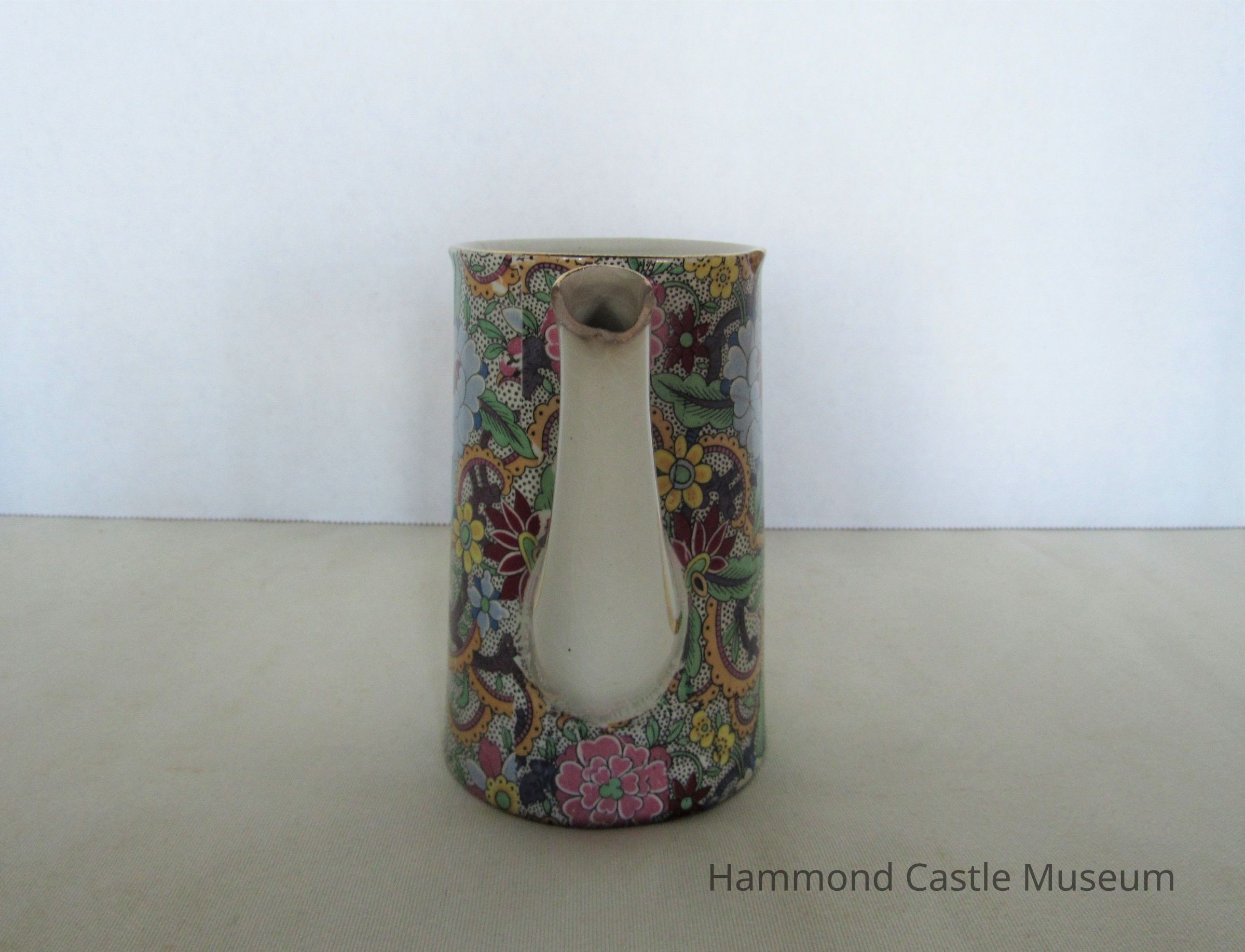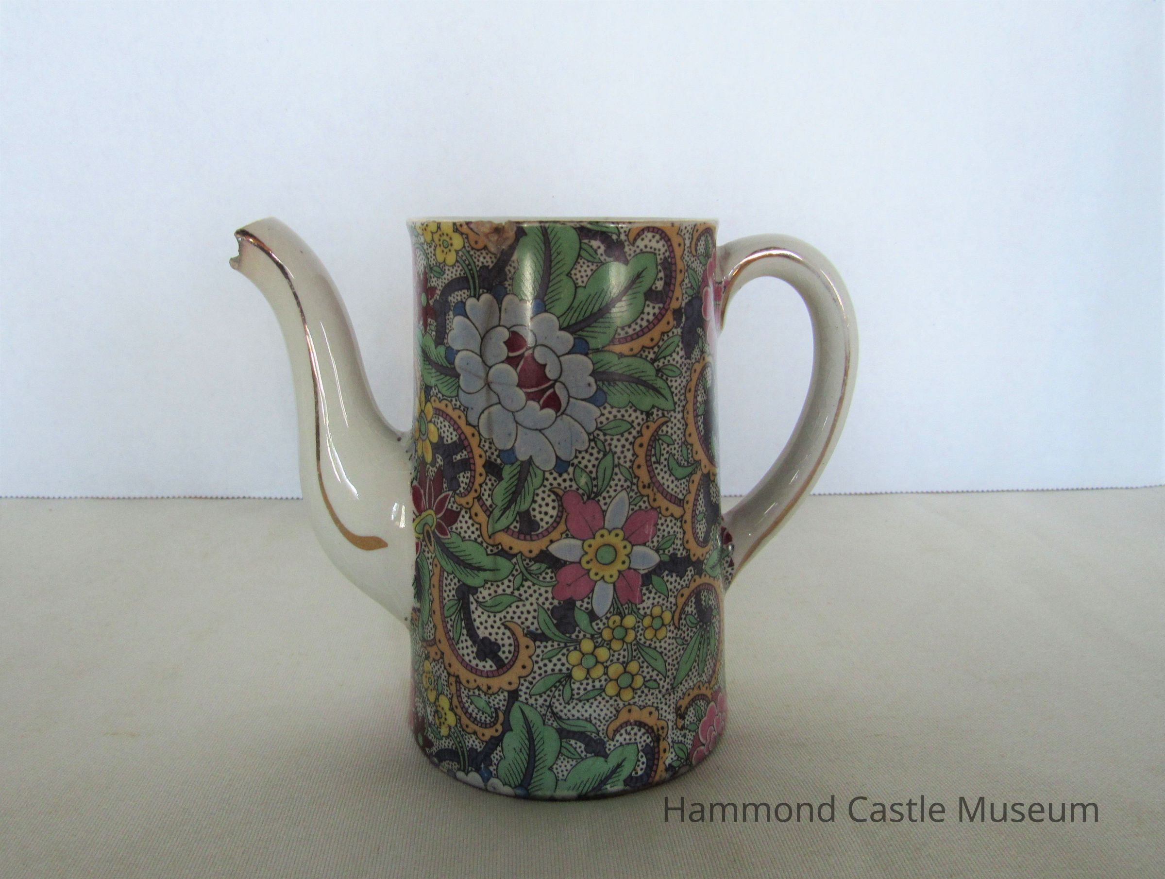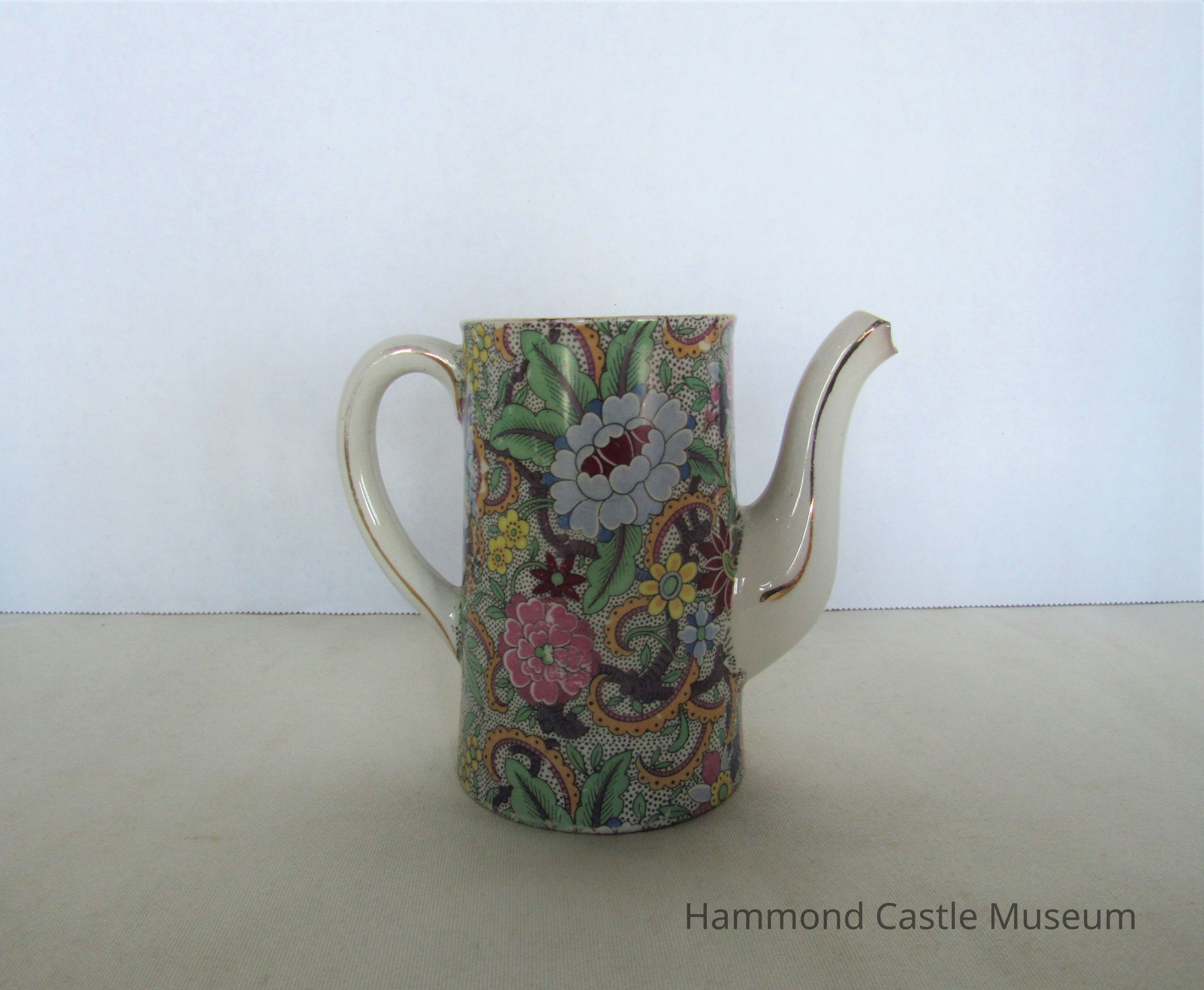 Small English tea or coffee pot. Paisley pattern. Missing top? Markings: ENGLAND (sideways horseshoe or omega around a lowercase S)