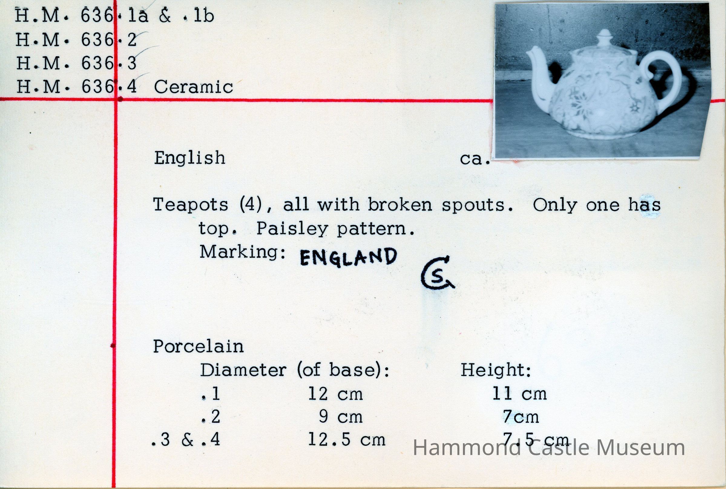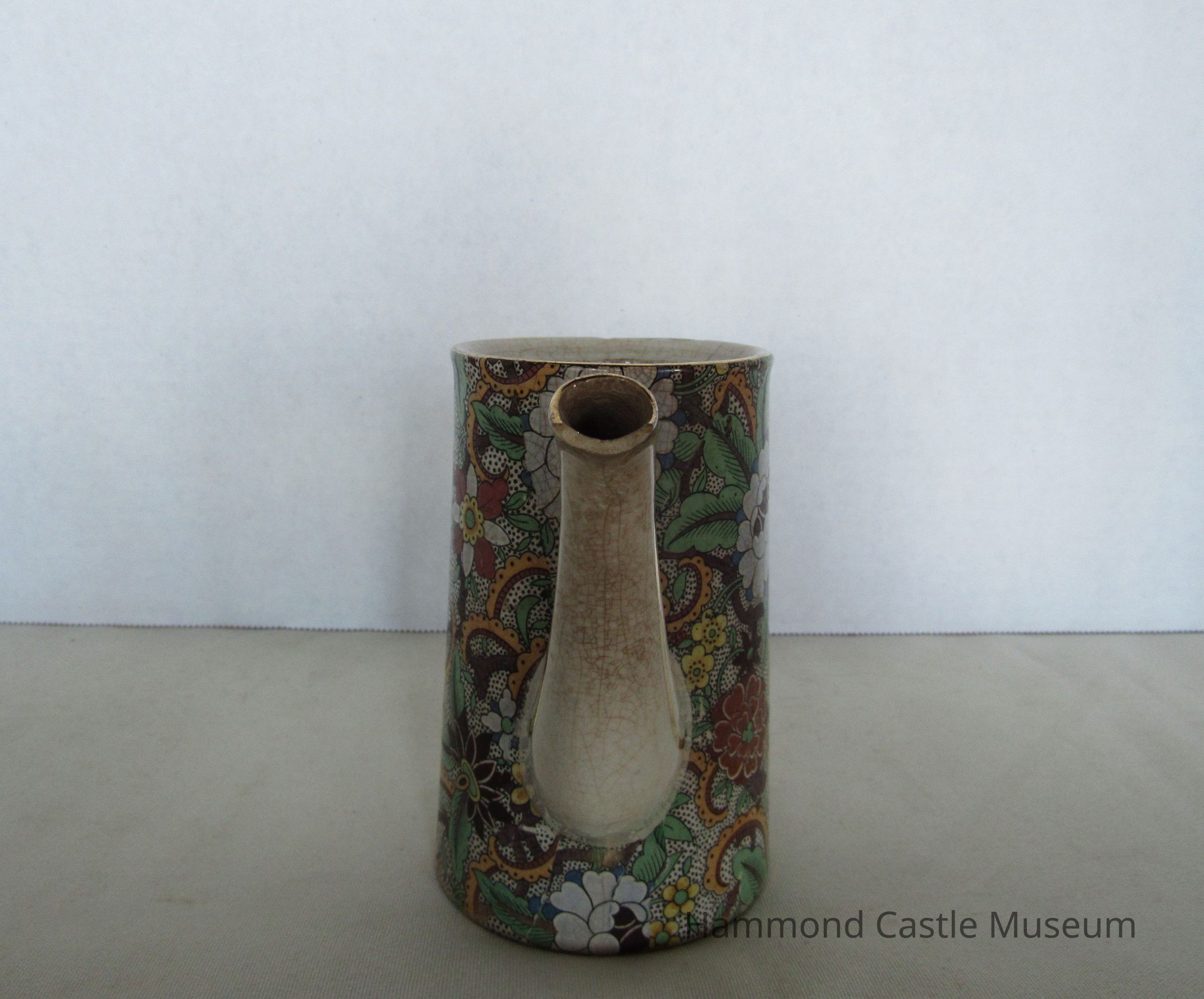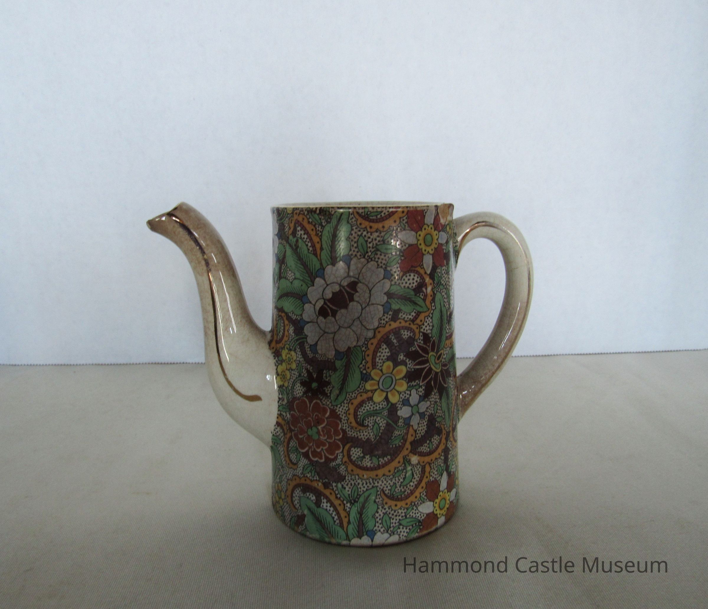 Small English tea or coffee pot with broken spout. Paisley pattern. Missing top? Markings: ENGLAND (sideways horseshoe or omega around a lowercase S)