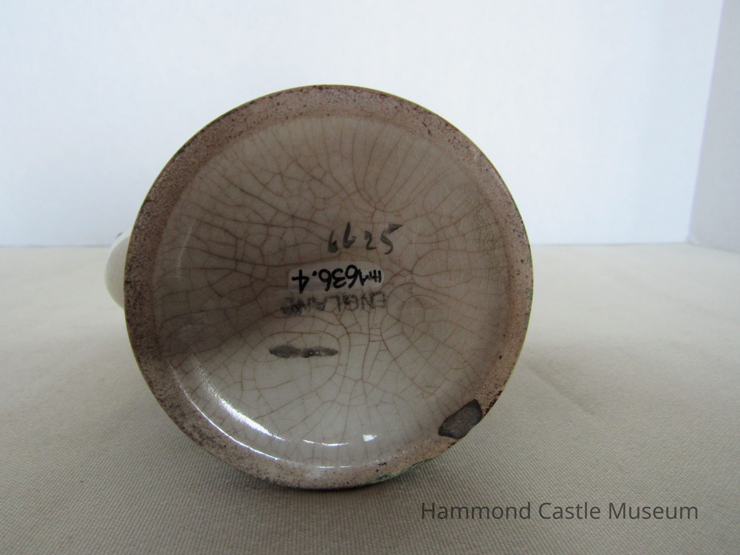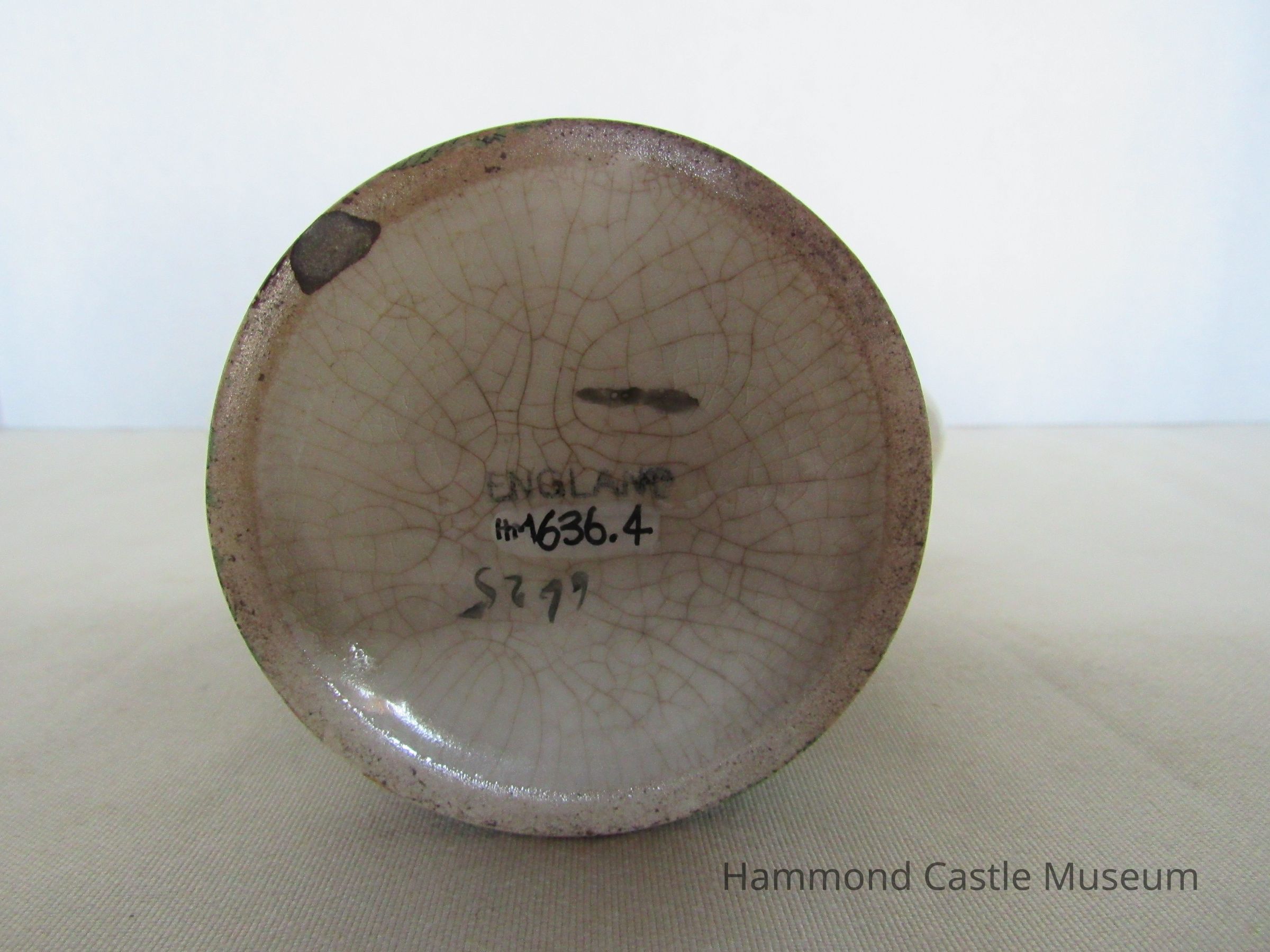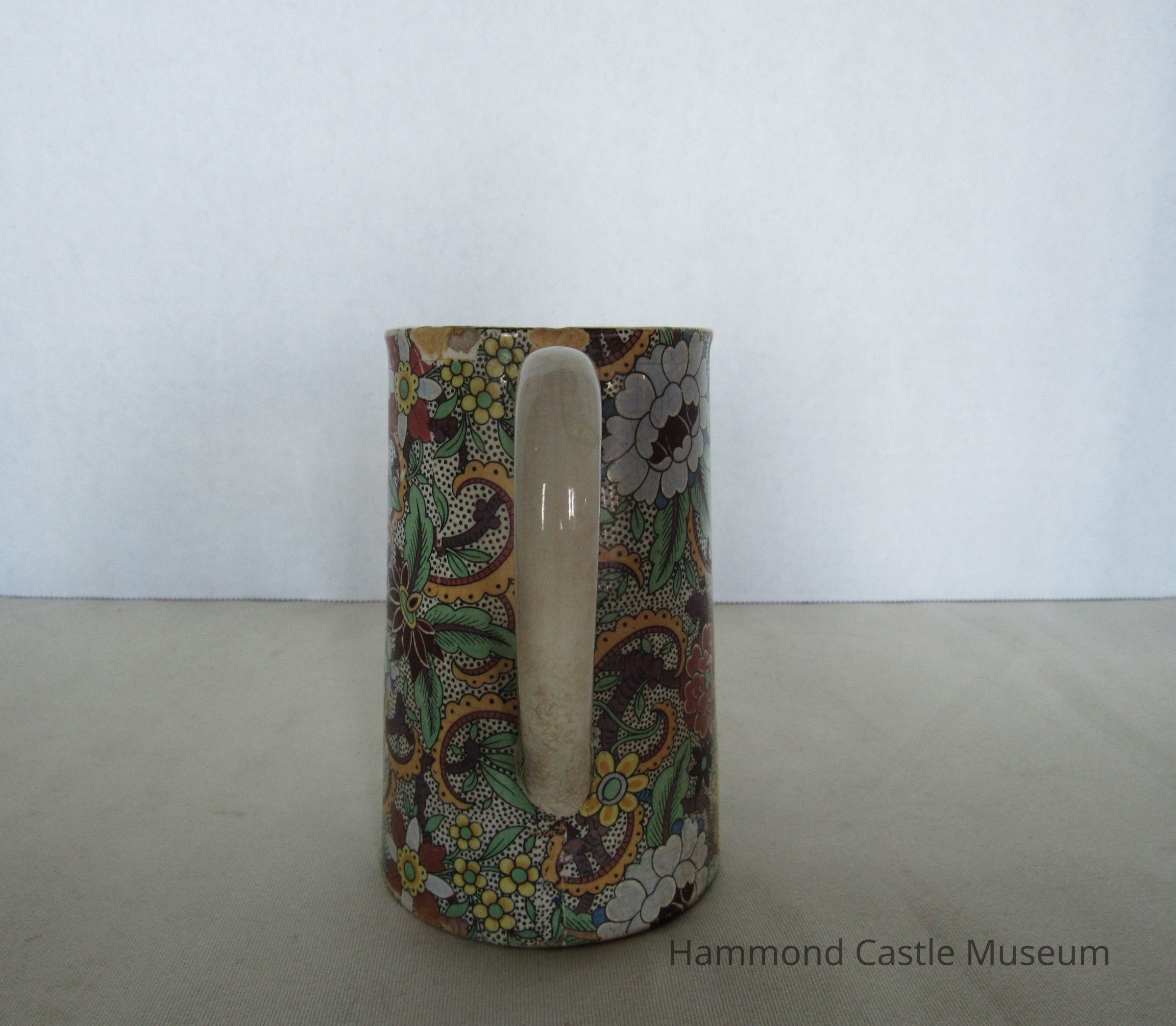 Small English tea or coffee pot with broken spout. Paisley pattern. Missing top? Markings: ENGLAND (sideways horseshoe or omega around a lowercase S)