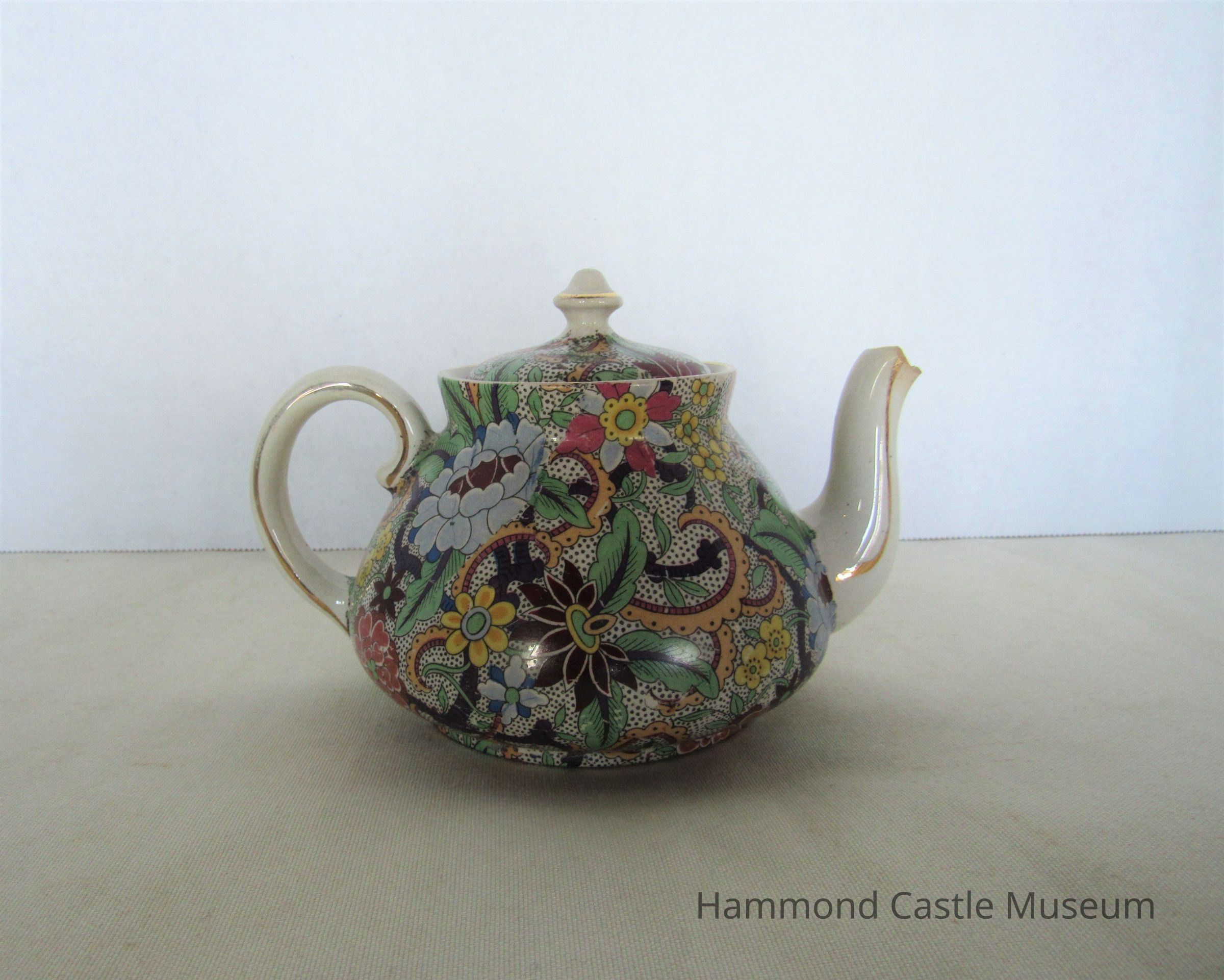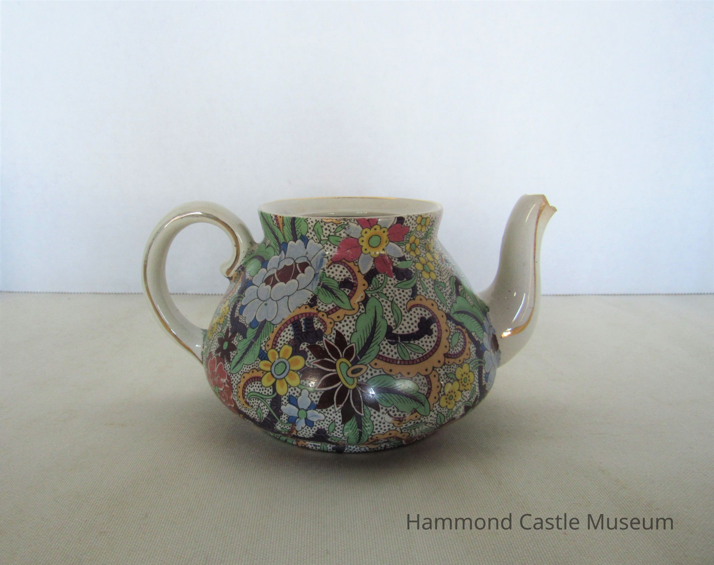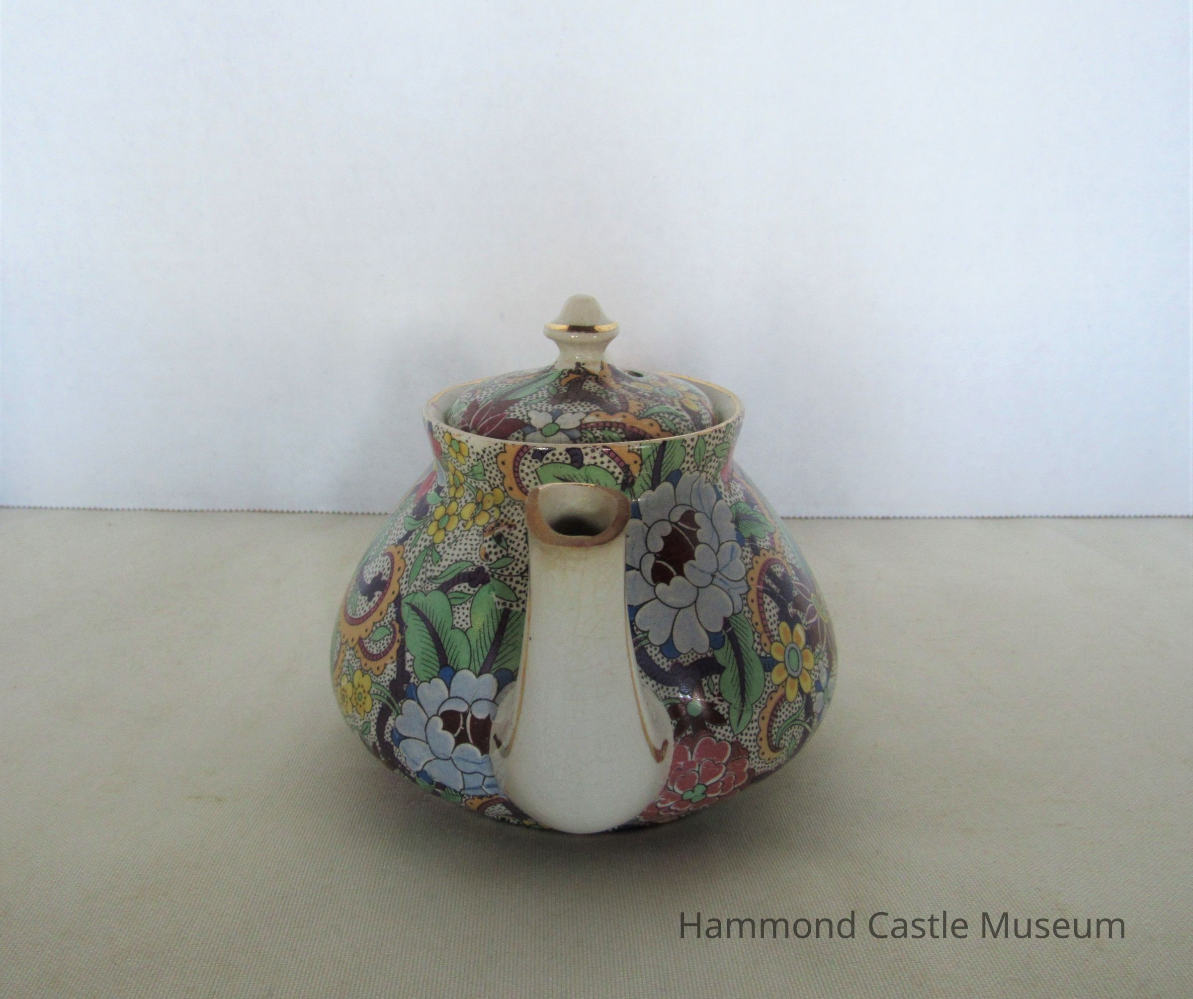 English teapot with broken spout. Paisley pattern. Includes top (635.1b) Markings: ENGLAND (sideways horseshoe or omega around a lowercase S)