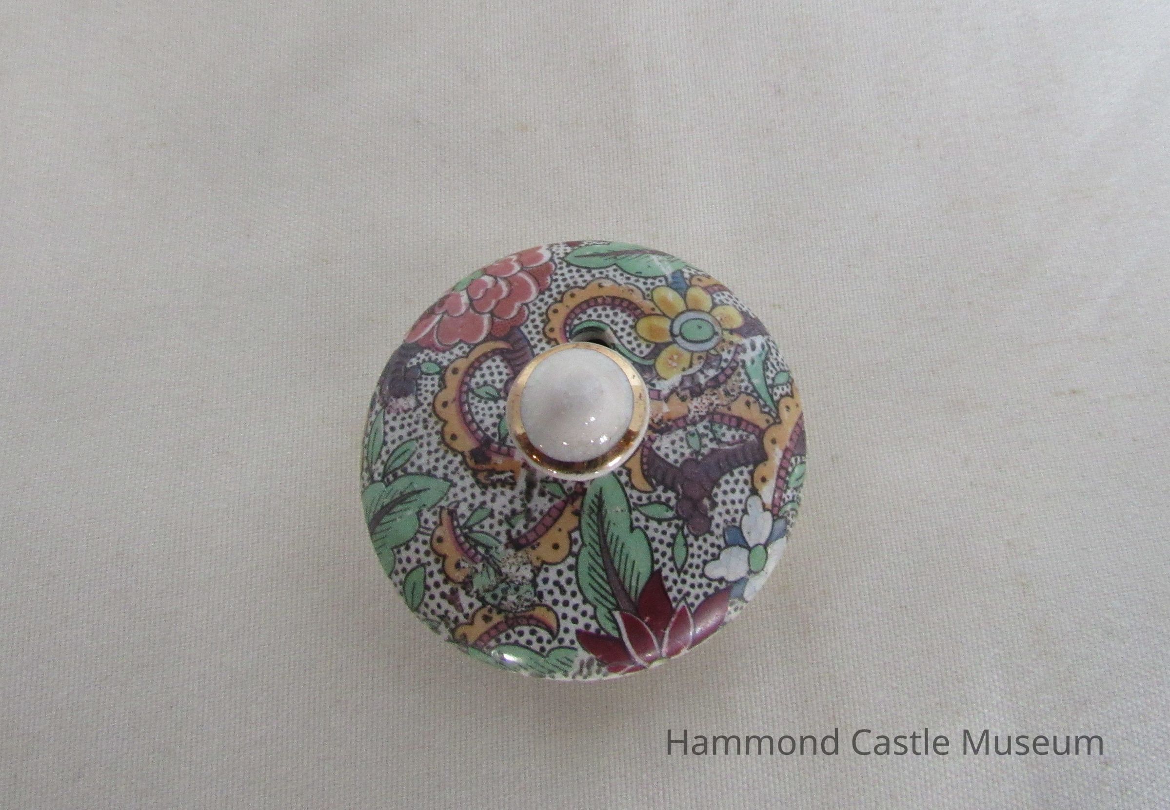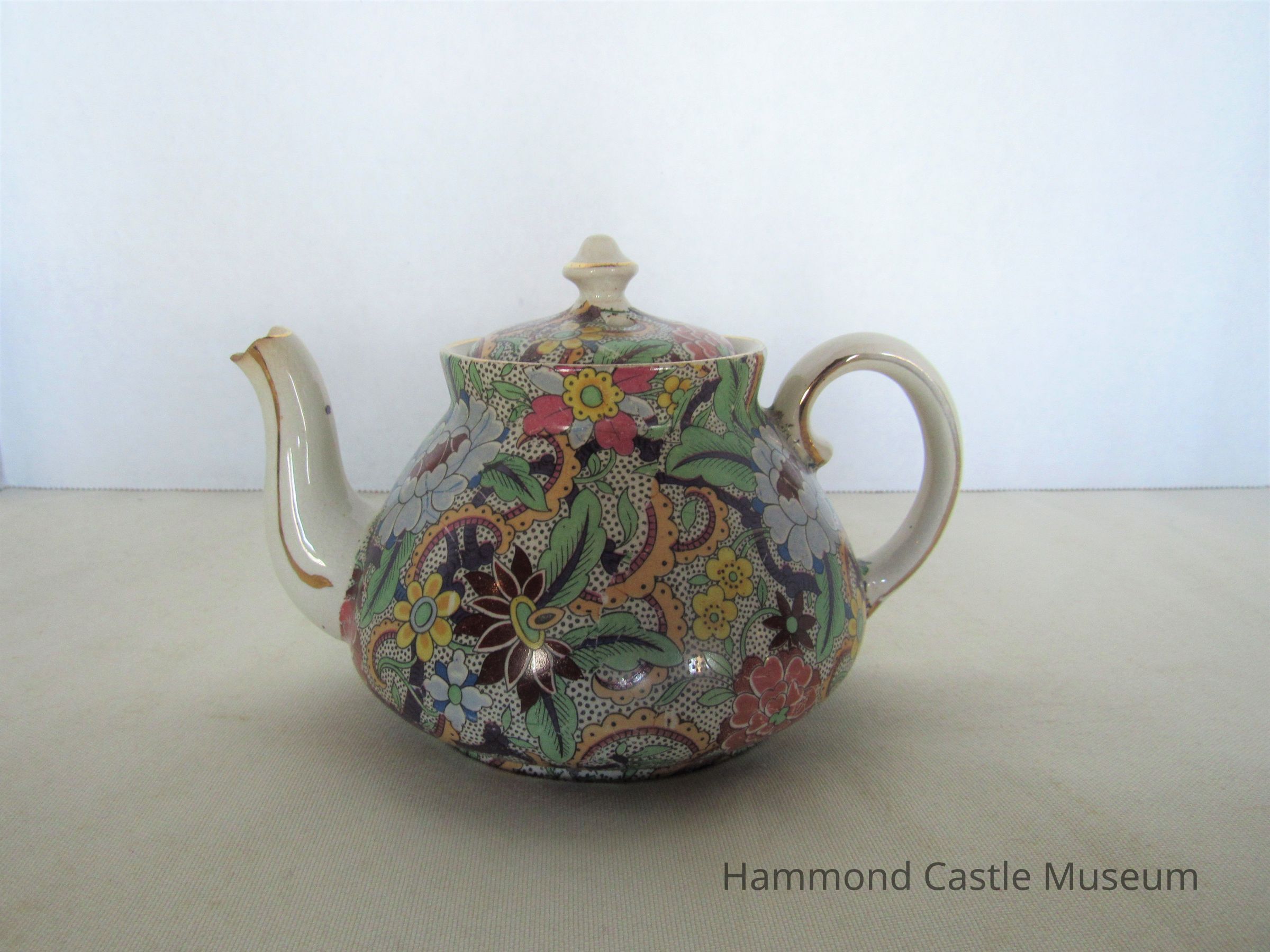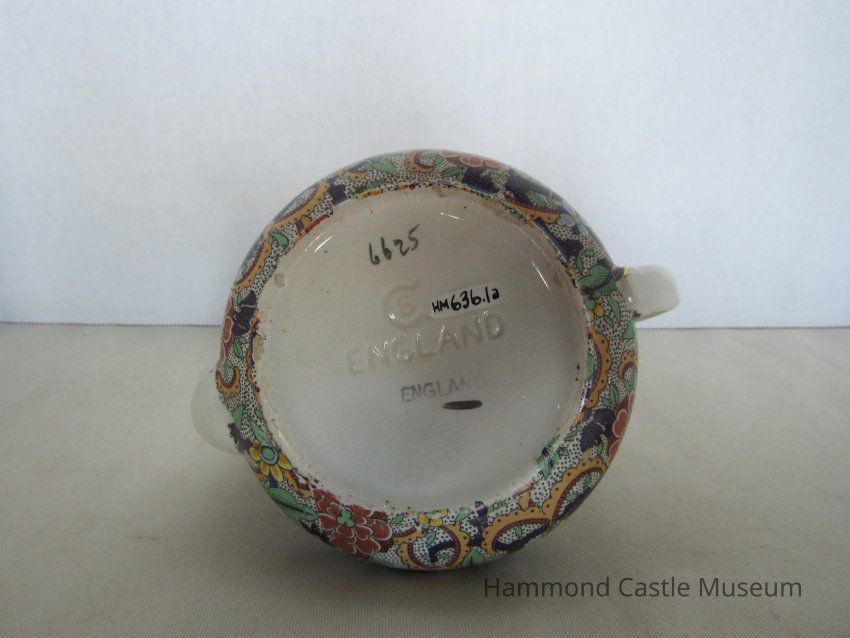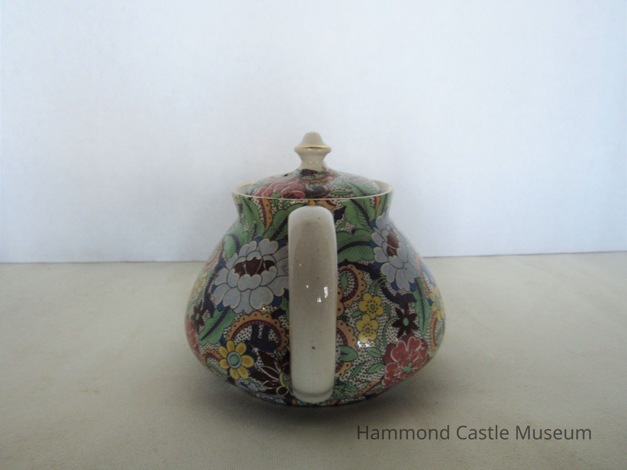 English teapot with broken spout. Paisley pattern. Includes top (635.1b) Markings: ENGLAND (sideways horseshoe or omega around a lowercase S)