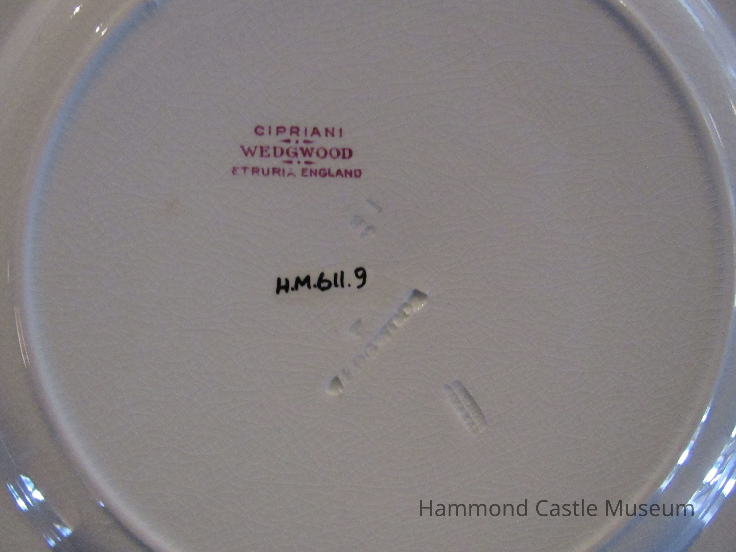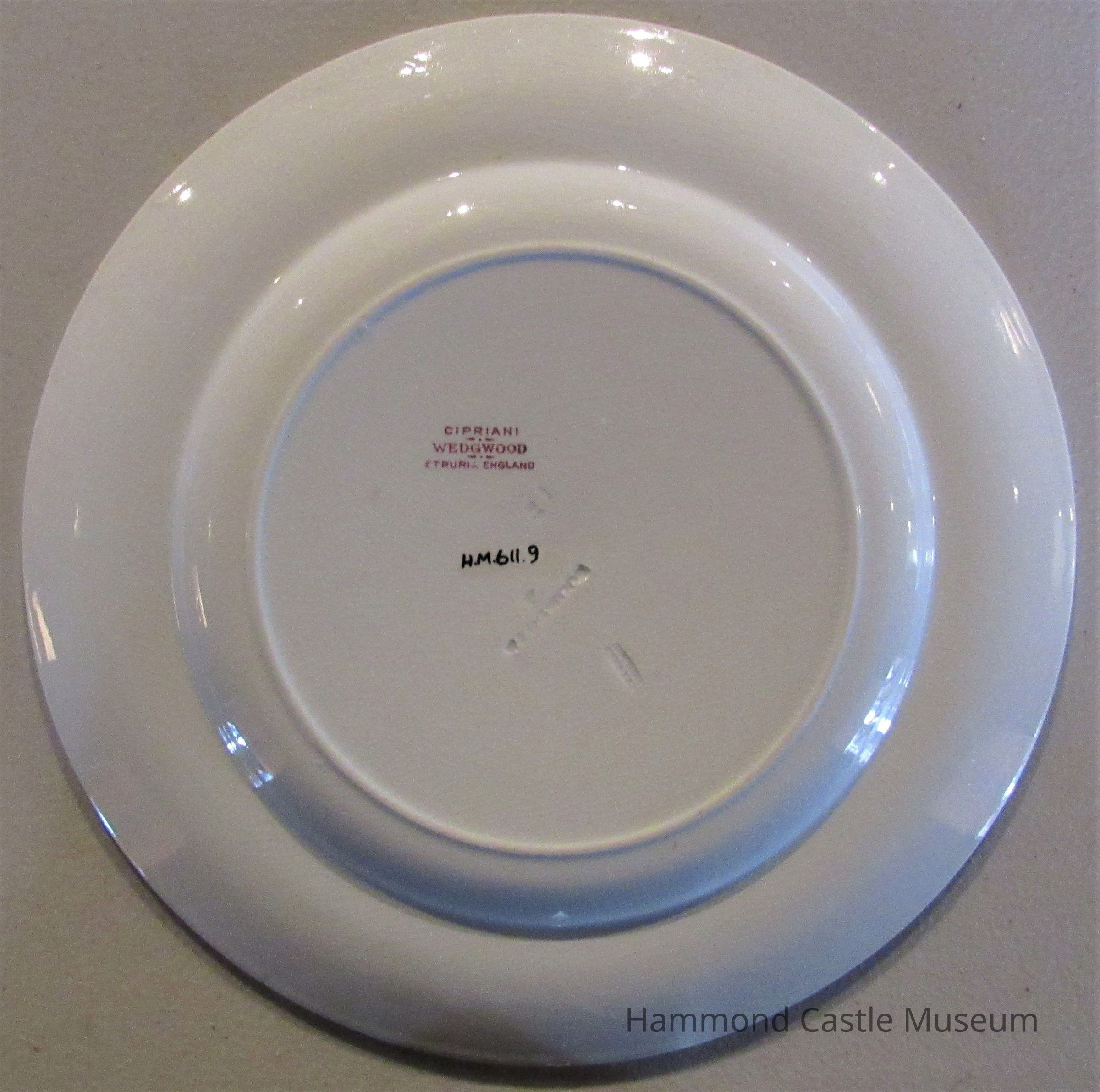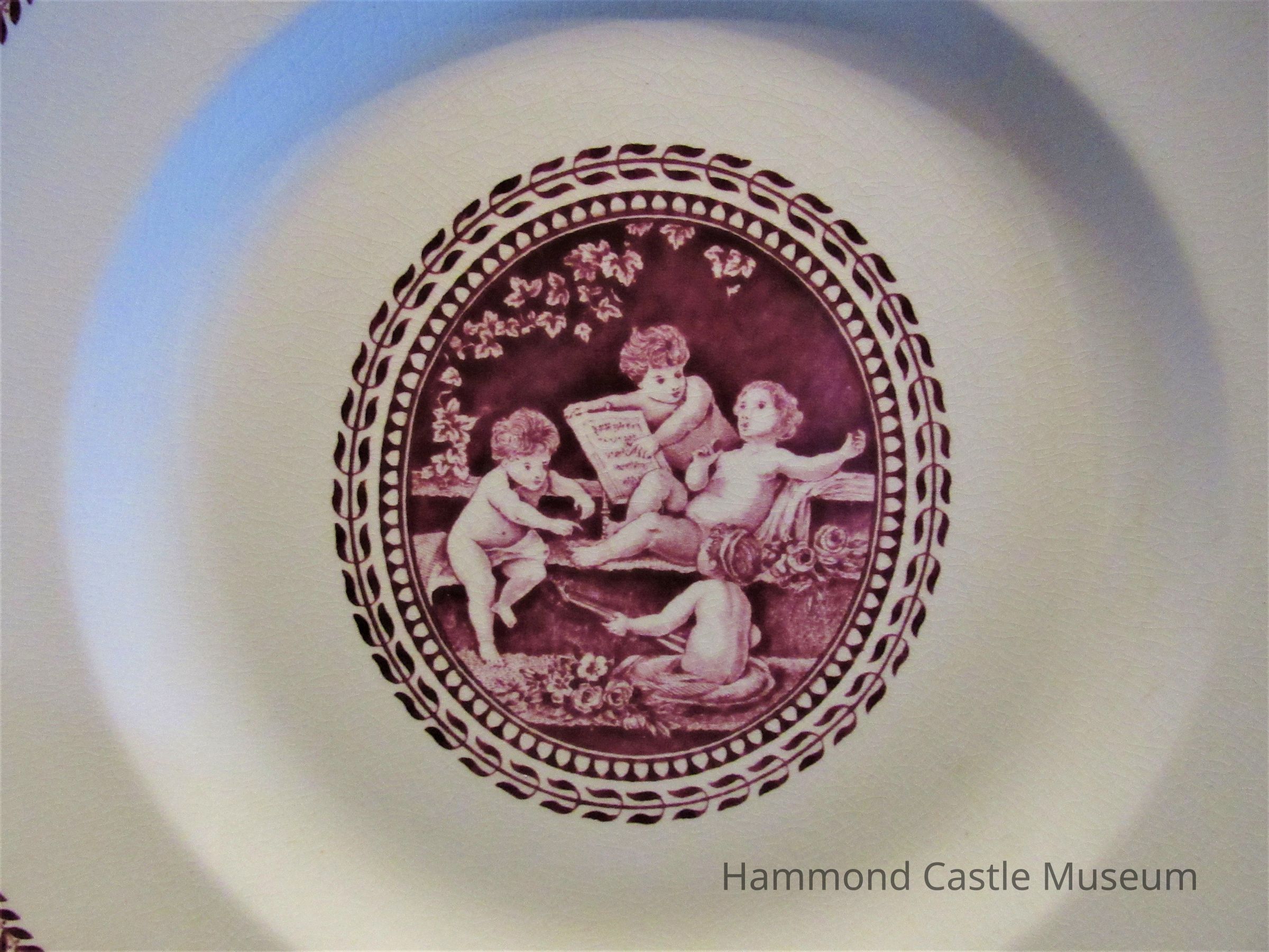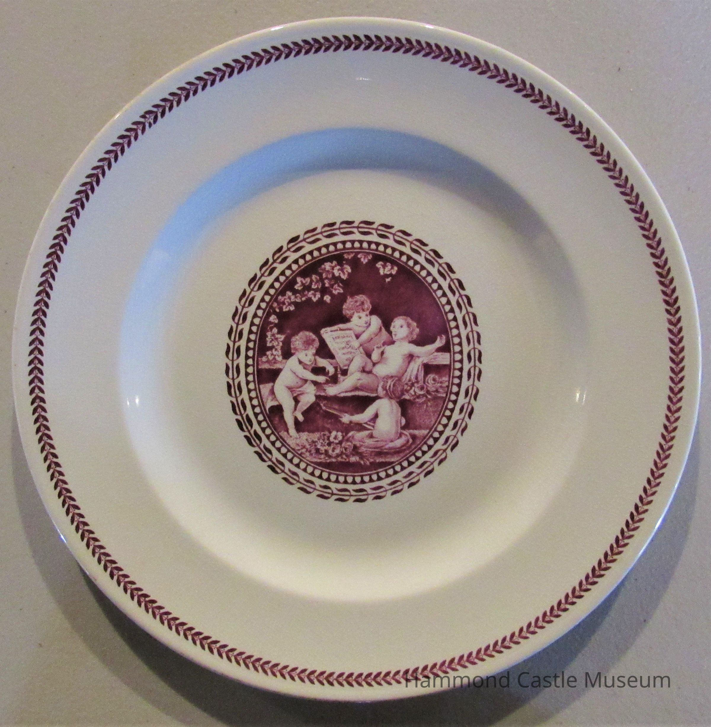 English Wedgewood: rose colored border with central medallion of angels. Part of 12 piece set.