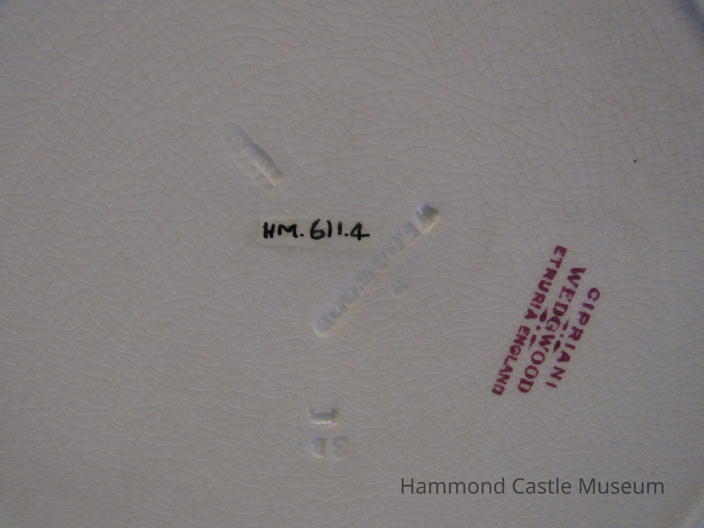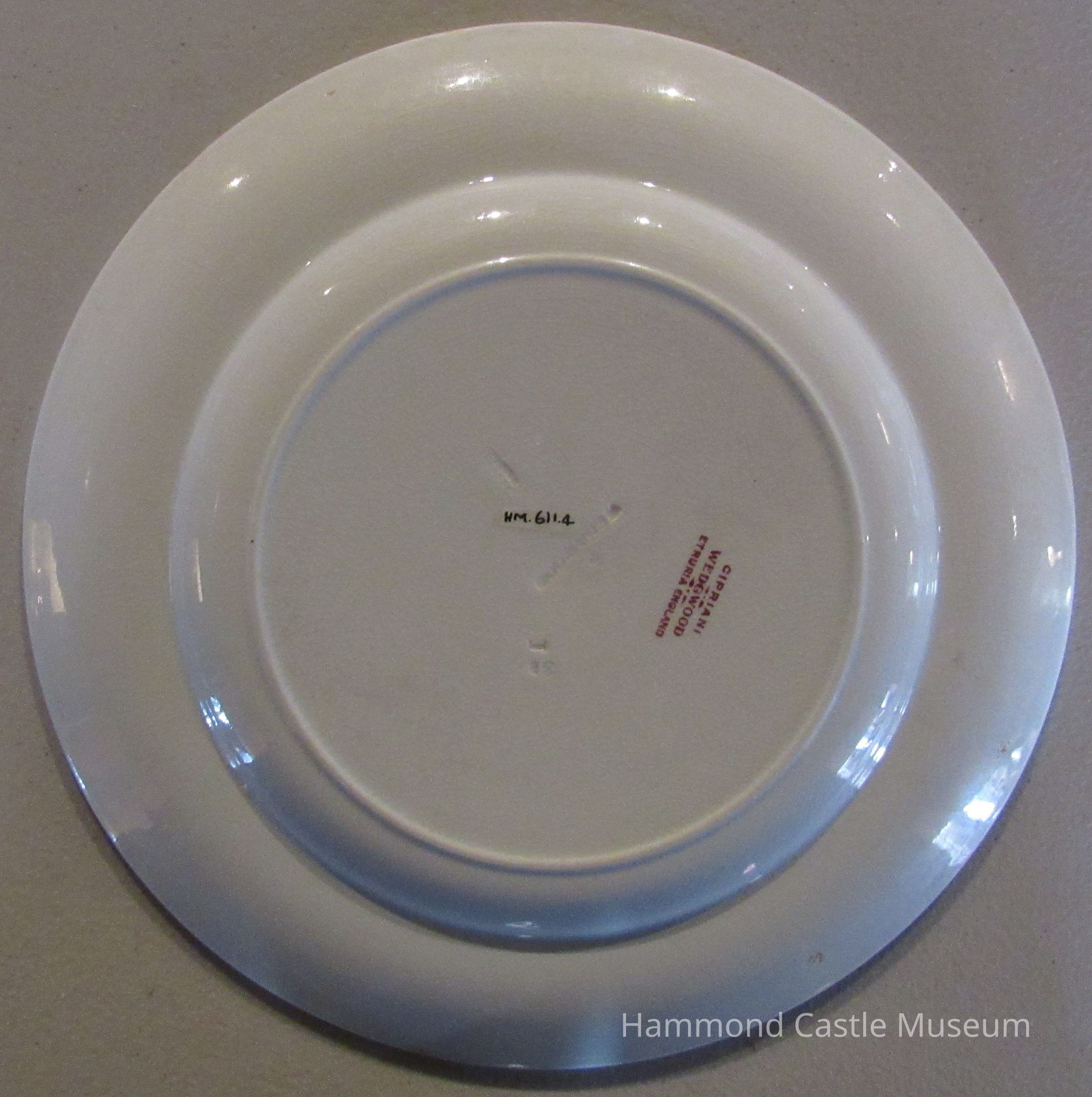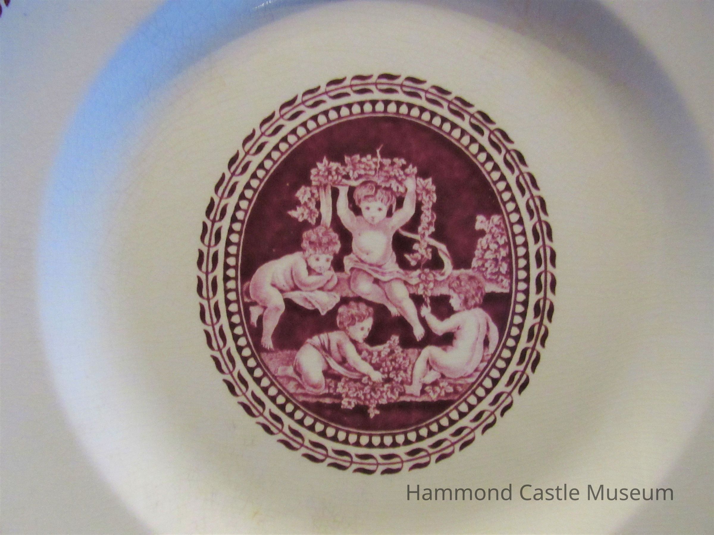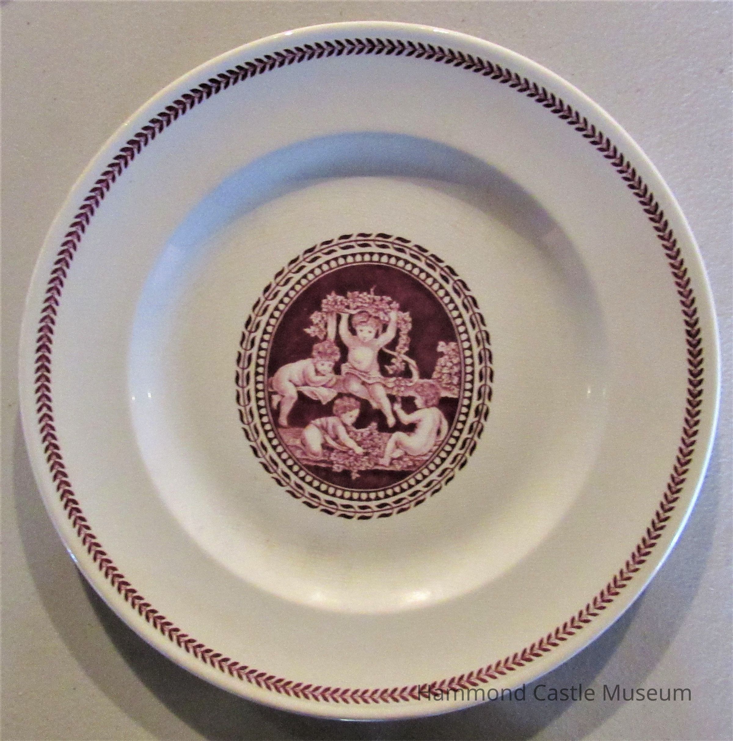 English Wedgewood: rose colored border with central medallion of angels. Part of 12 piece set.