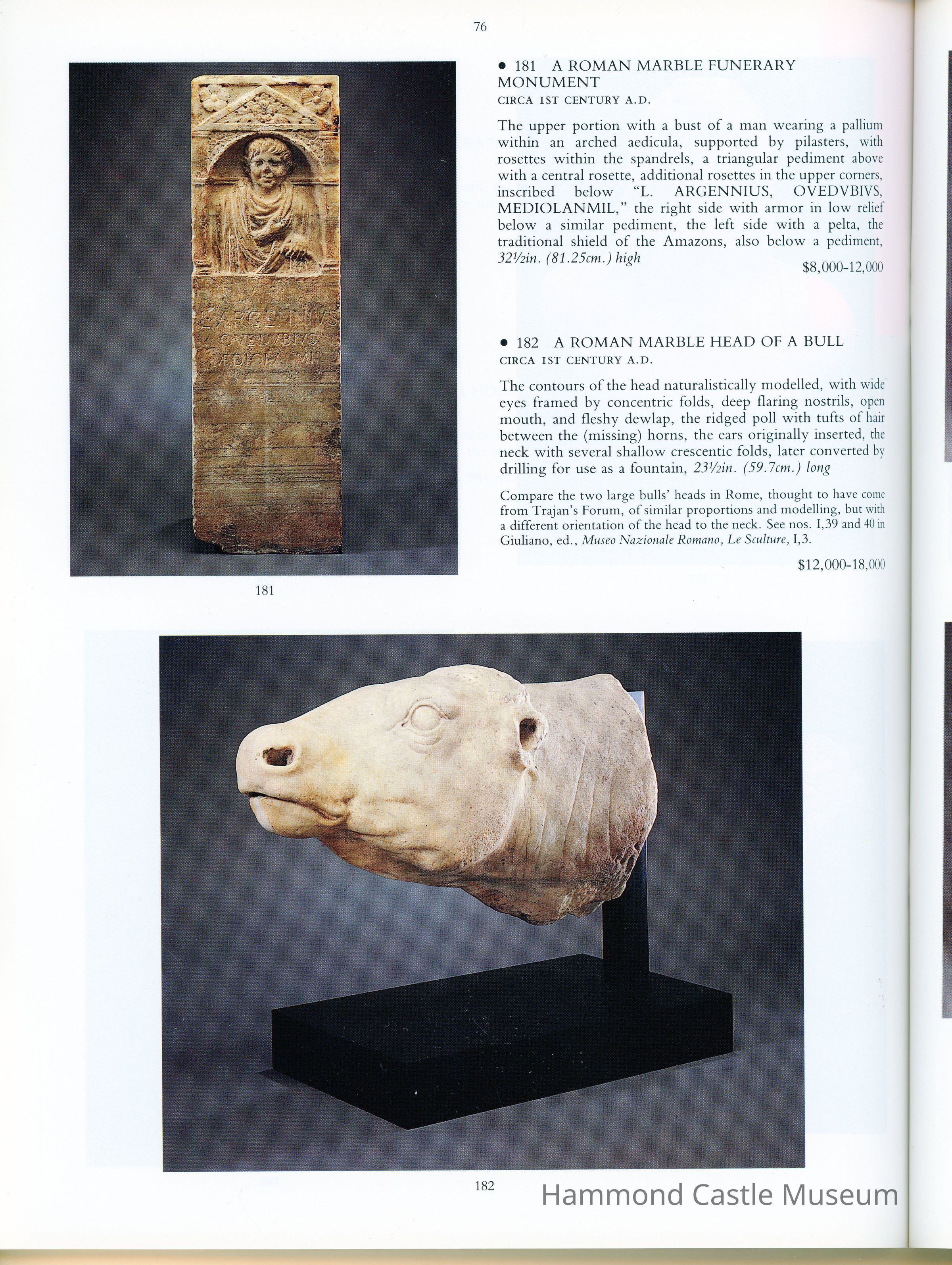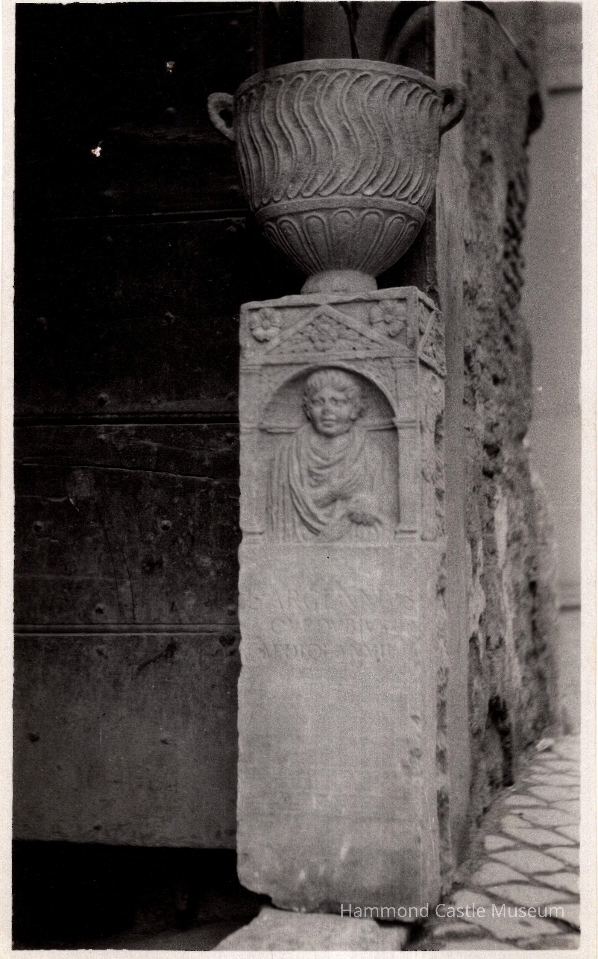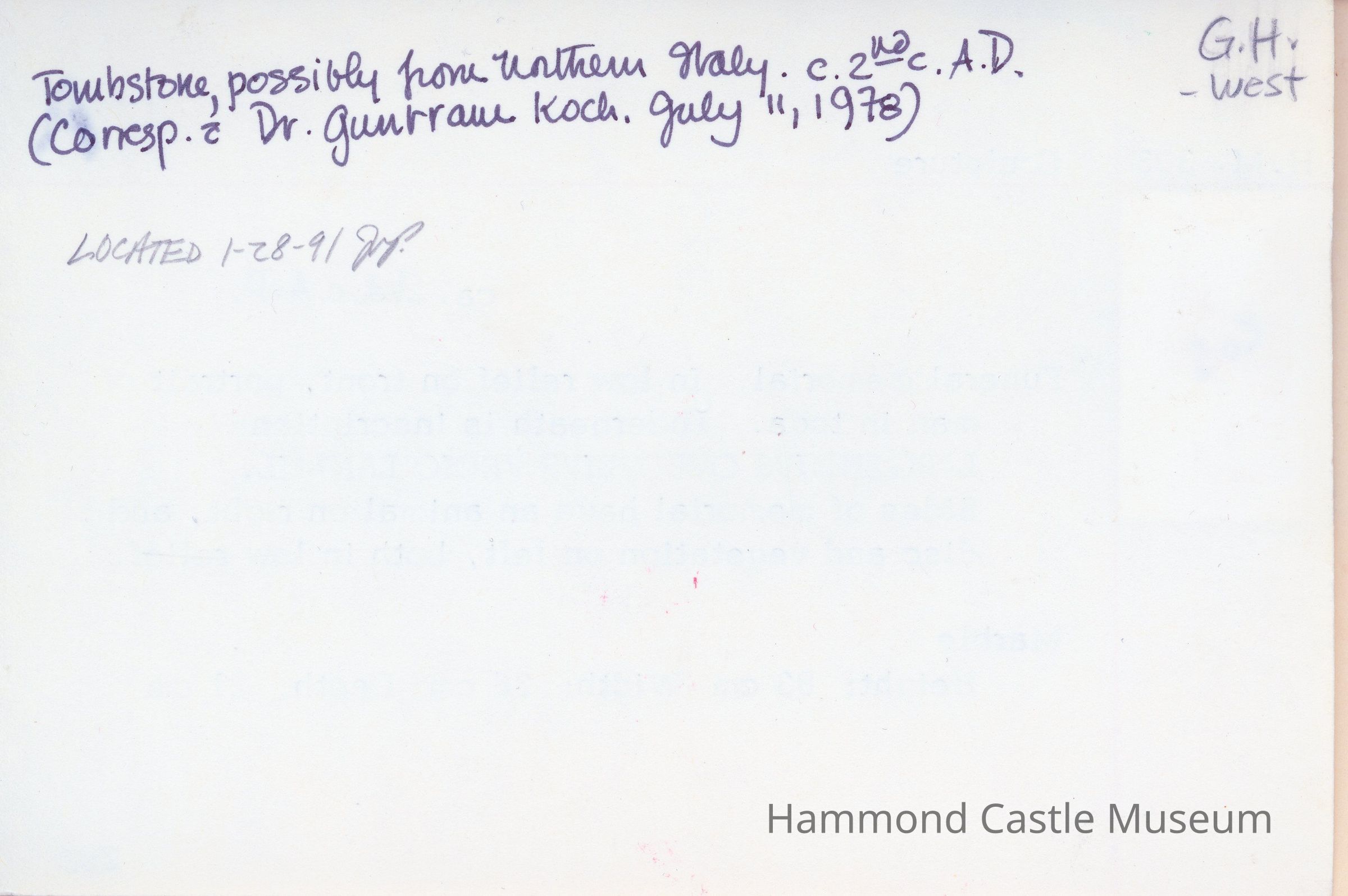 Sides of memorial have an animal on right, and disc and vegetation on left, both in low relief