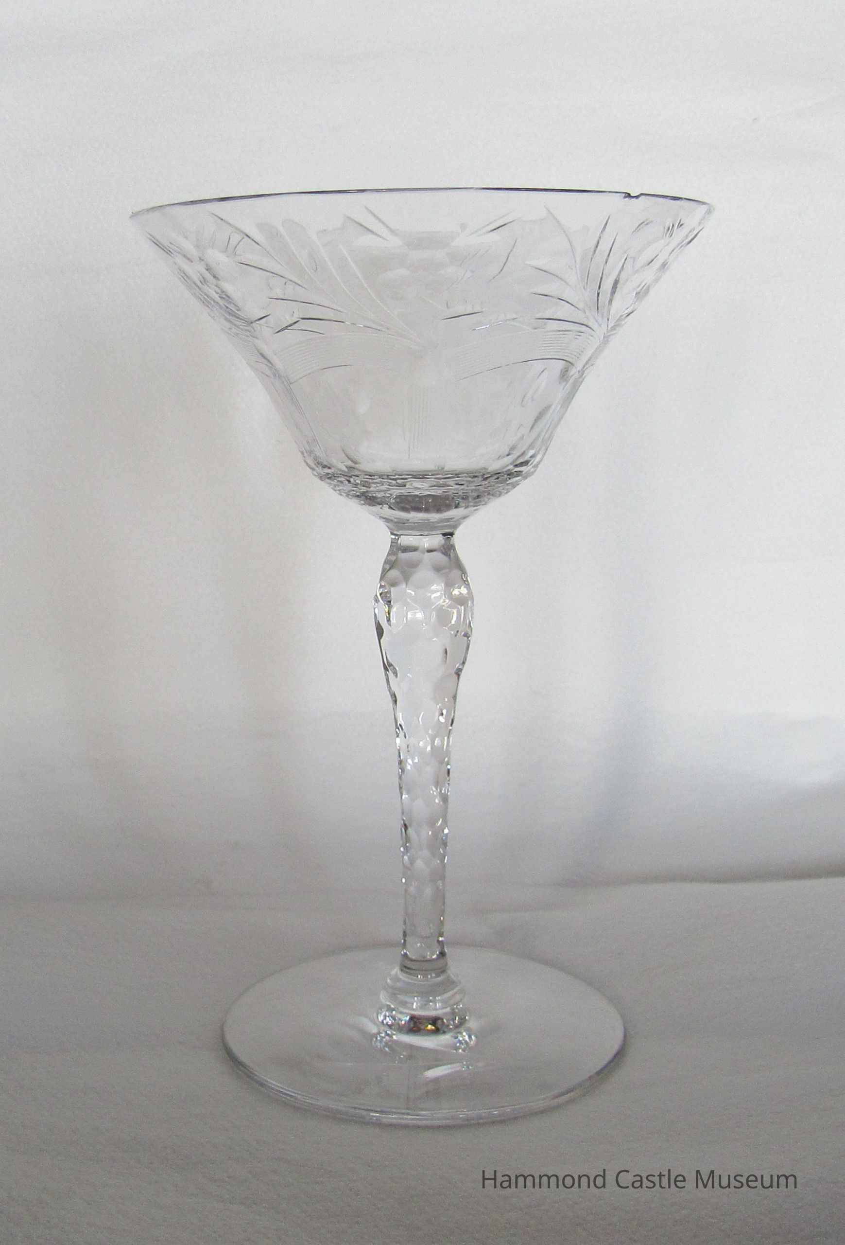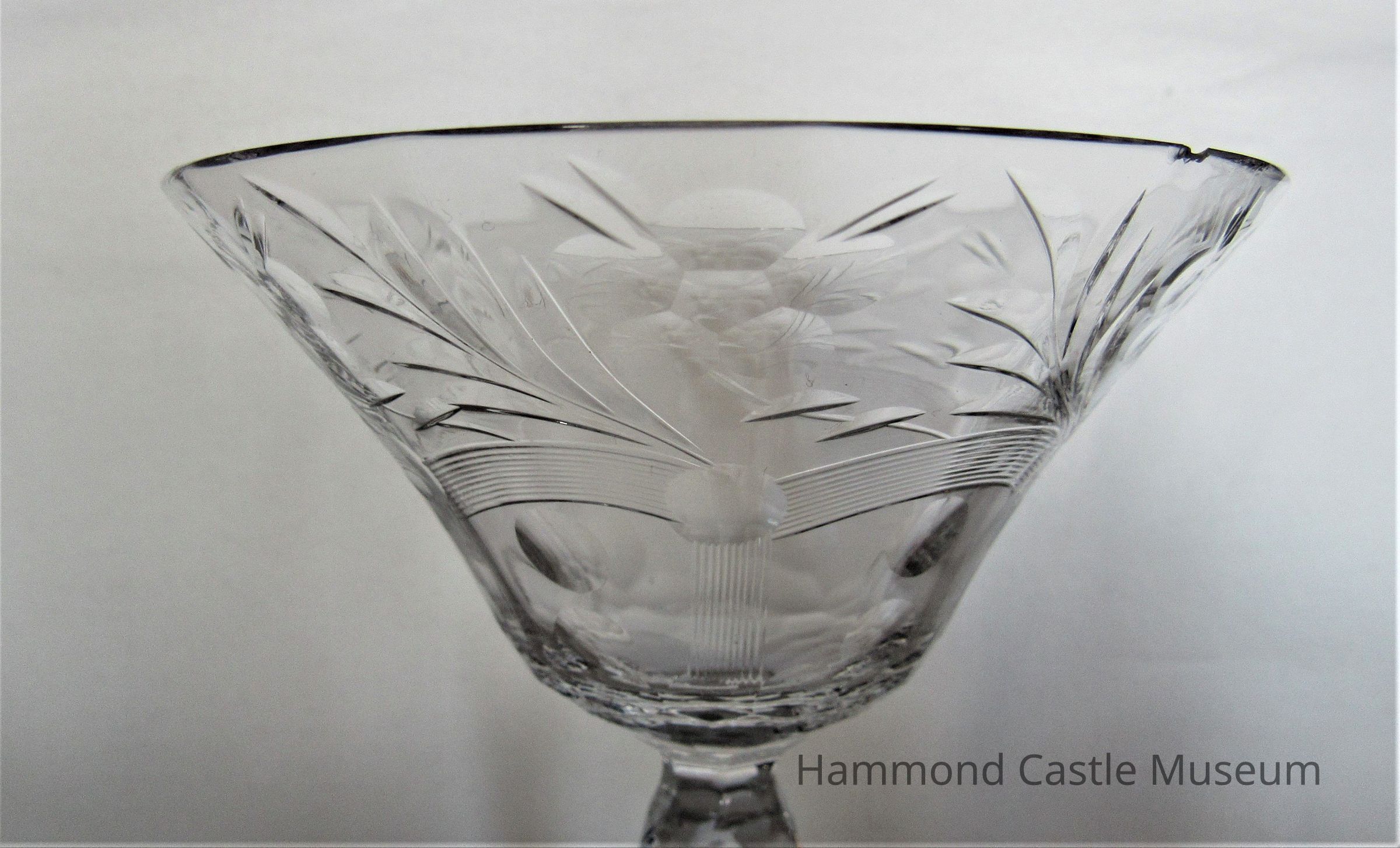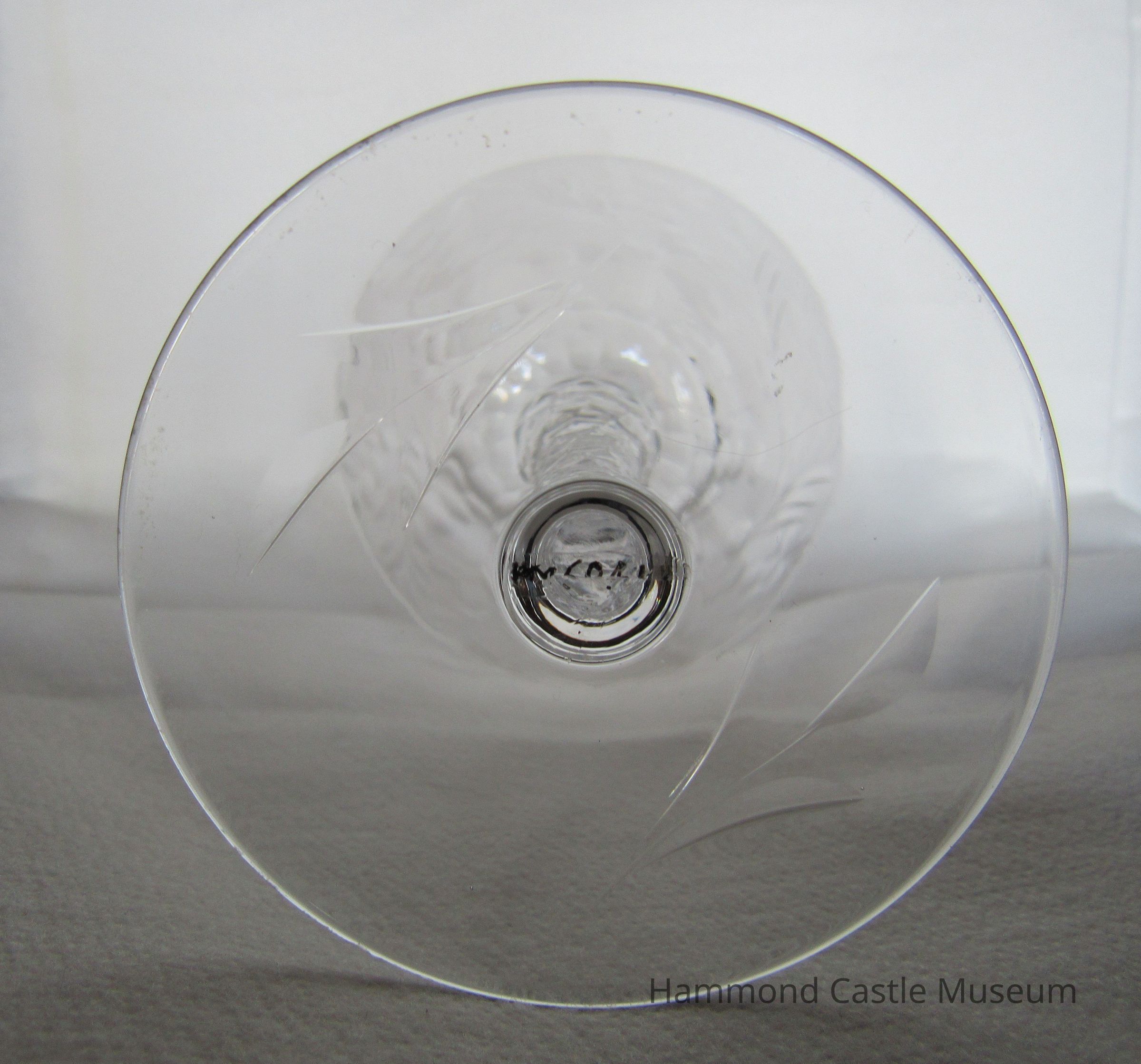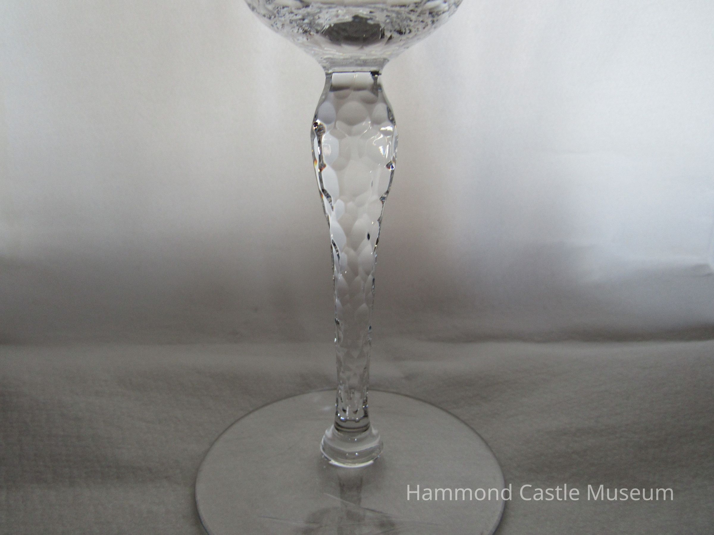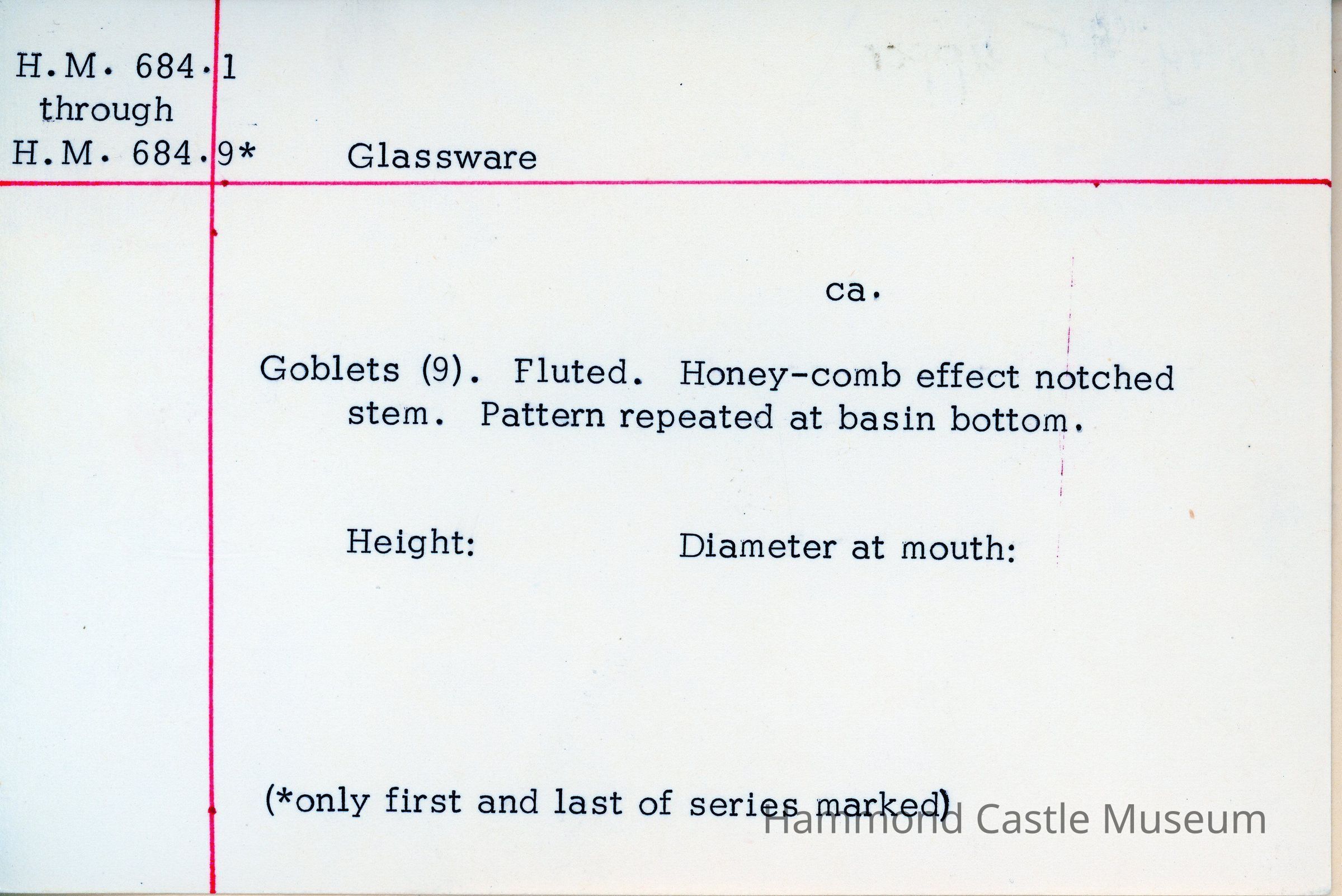 Set of 9. Fluted goblet with floral etched pattern, etching repeated on bottom foot. Honey-comb effect notched stem. Only first and last of series marked.