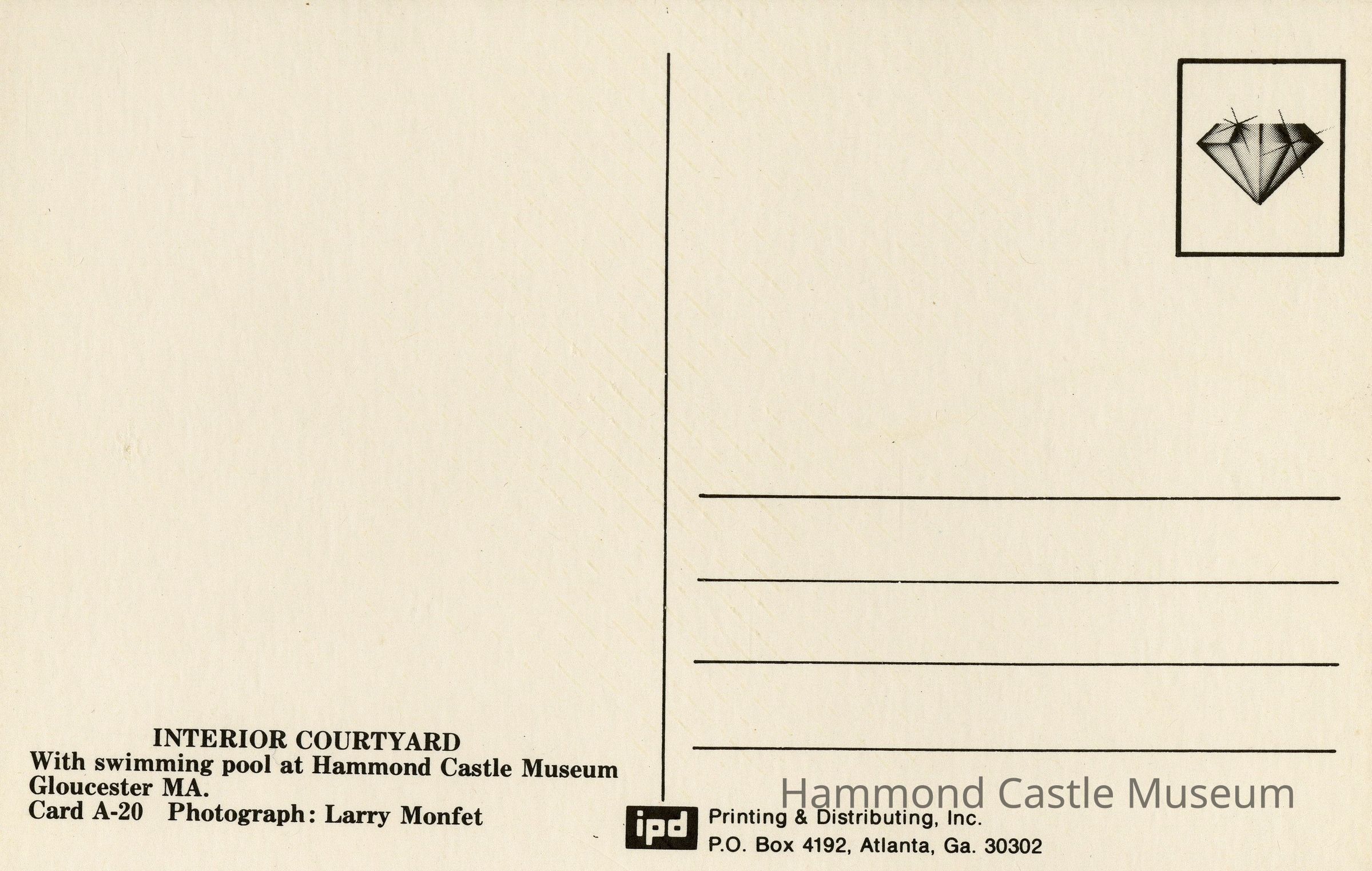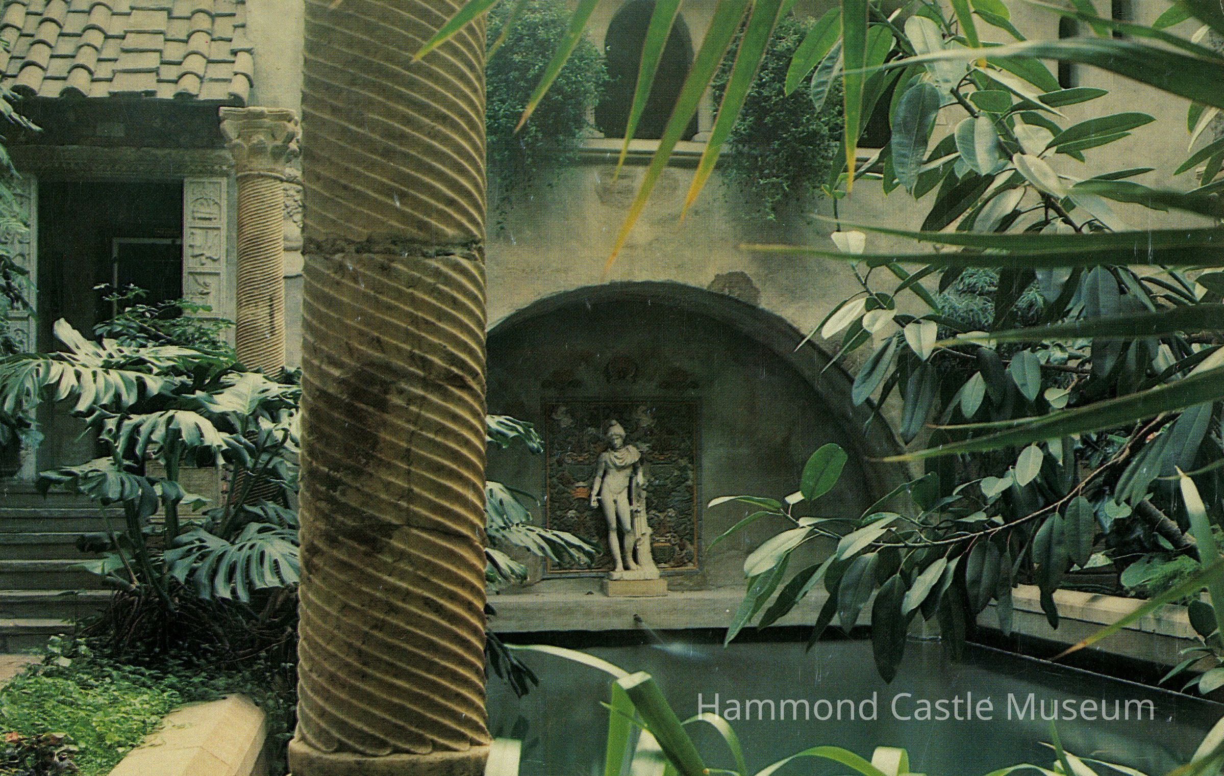 Postcard of courtyard pool with statue and tiles