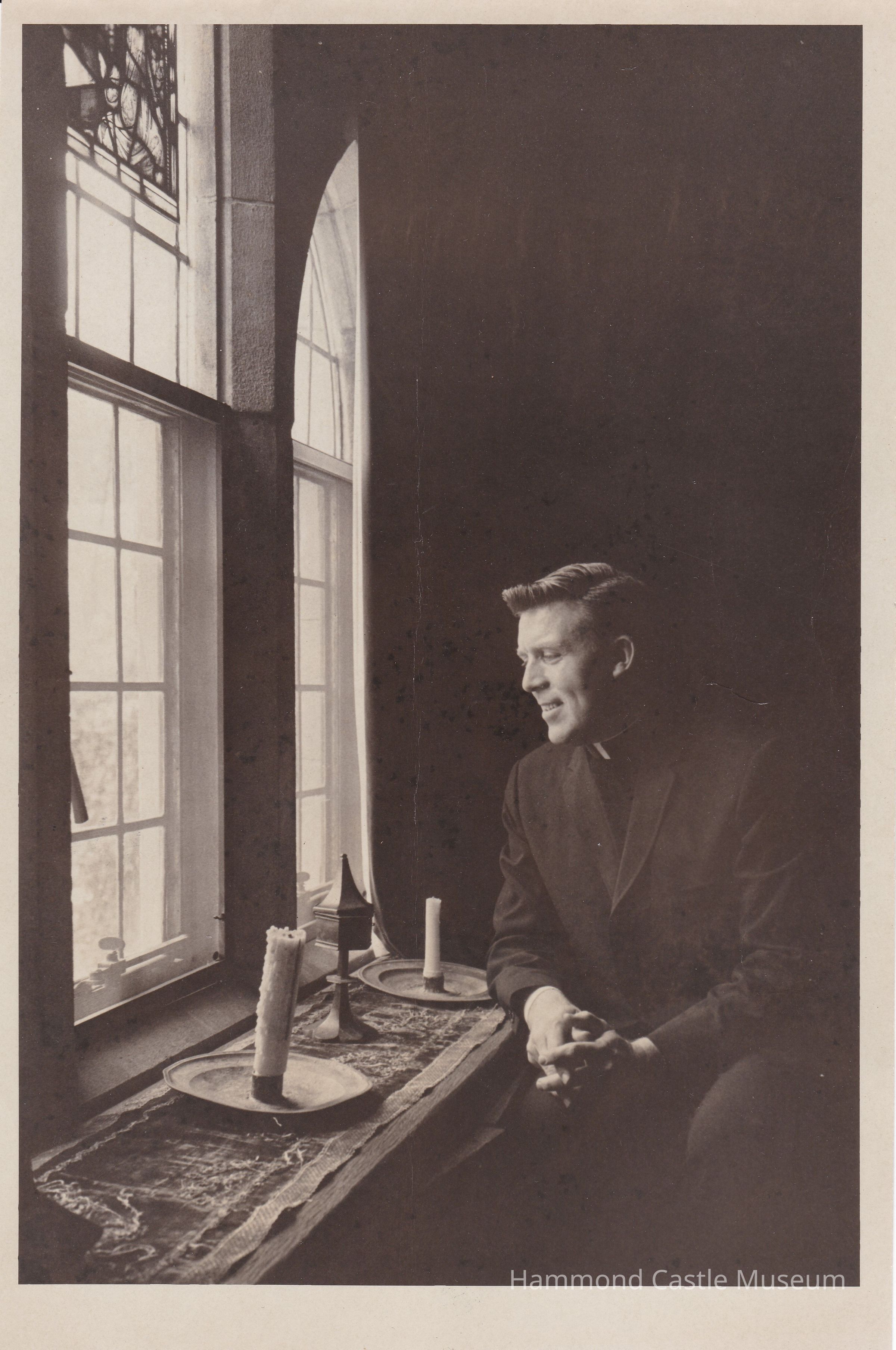 Photo of Father Francis Strahan in Gothic Room. Fr Strahan sang and recorded concerts in the castle post Hammond.